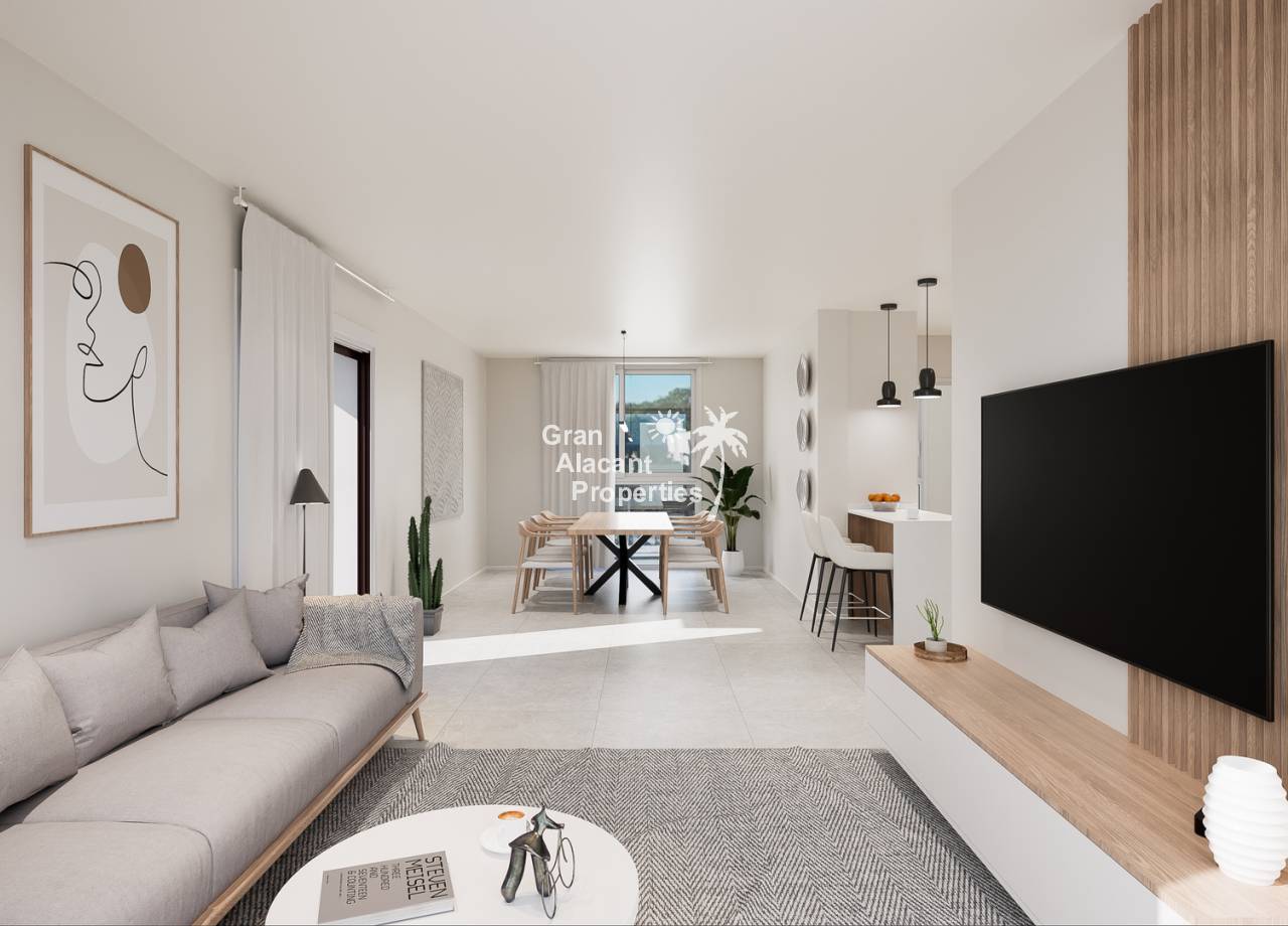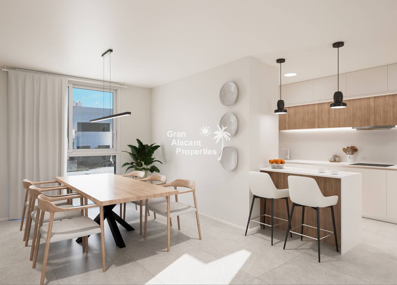 El interior de las propiedades en esta promoción ha sido cuidadosamente diseñado para ofrecer espacios confortables y modernos. Los apartamentos cuentan con 2 dormitorios, mientras que los adosados tienen 3 dormitorios, todos con armarios empotrados que optimizan el espacio de almacenamiento. Las cocinas americanas están completamente equipadas con electrodomésticos Siemens, incluyendo nevera, lavavajillas, vitrocerámica, horno y campana extractora. Los baños están equipados con calefacción por suelo radiante y mamparas de ducha, ofreciendo un toque adicional de confort y lujo. Las luces LED bajo los muebles de cocina y las persianas motorizadas en el salón añaden funcionalidad y estilo. Los grandes ventanales permiten la entrada de luz natural, creando un ambiente luminoso y acogedor, mientras que las amplias terrazas y solariums proporcionan un espacio exterior adicional para disfrutar.