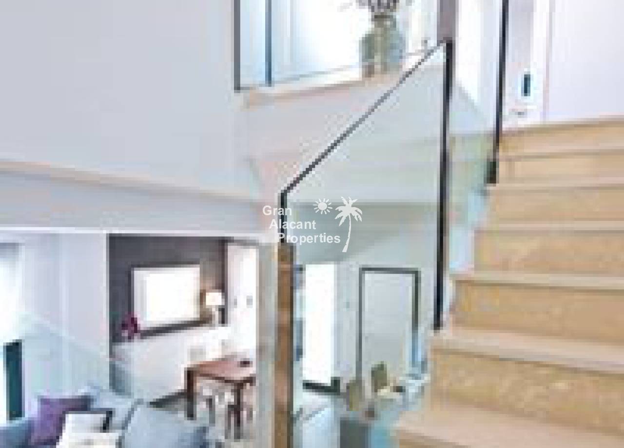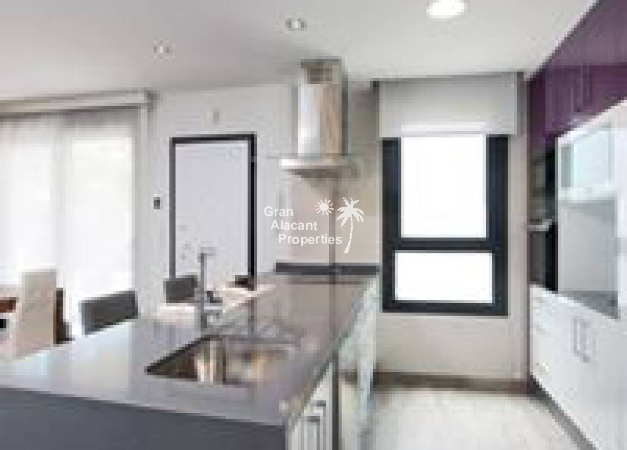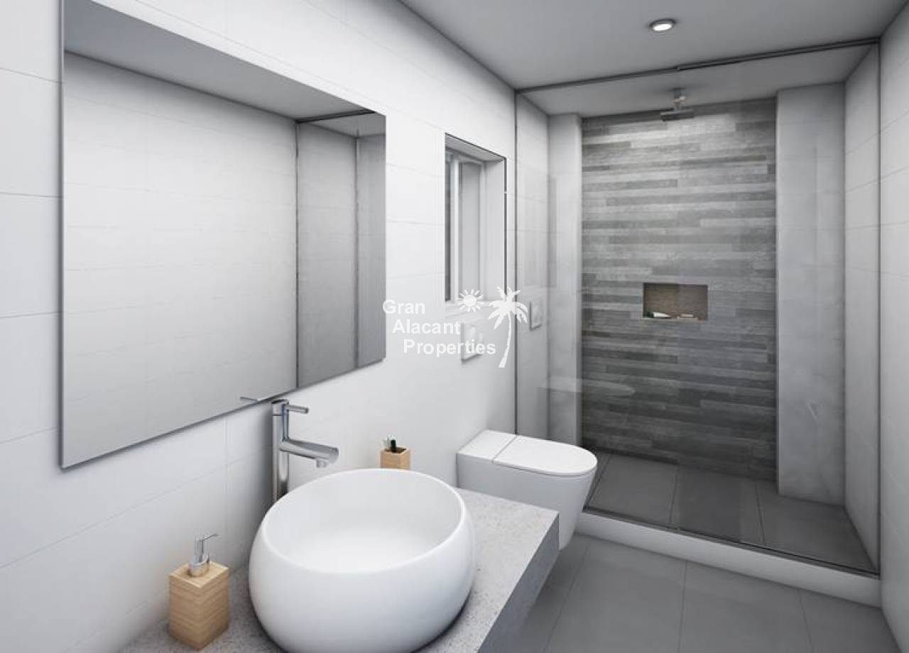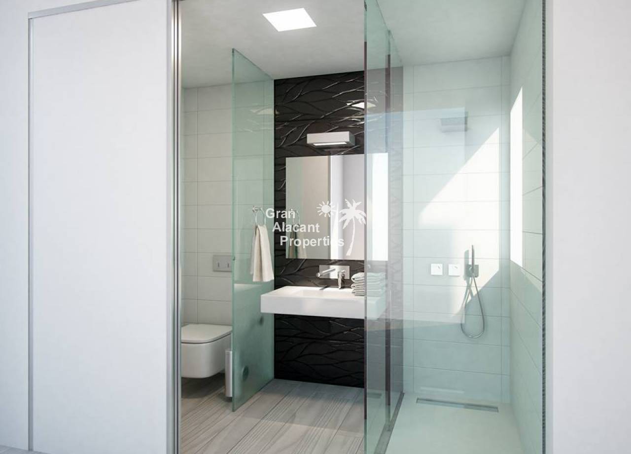 Obra nueva, chalets de lujo con piscina en una comunidad vallada en Gran Alacant. Estas viviendas de 2 plantas en “Gran Alicante” por iHome cuentan con un diseño minimalista elegante y moderno. Hay un gran salón con techo de doble altura y cocina/comedor contigua. Una pared de vidrio en la planta baja asegura que este espacio está inundado de luz. Un baño y un dormitorio doble con armario empotrado completan la planta baja. Subiendo la escalera de cristal y acero a la primera planta, hay un amplio dormitorio principal con cuarto de baño con doble lavabo y un adicional de habitación doble en suite, ambos con armarios empotrados. Estos chalets nuevos contarán con modernos acabados de alta calidad. Todas las ventanas son de vidrio de doble acristalamiento Climalit con la garantía de Sunguard recubrimiento de control solar el lugar se mantiene confortablemente fresco. La cocina dispone de fácil cierre de gabinetes, encimeras de Silestone blanco brillante ingeniería de cuarzo, campana extractora integrada, placa de inducción, y cocina especial del grifo agarre con una sola mano. Los baños cuentan con grifería termostática de ducha, ducha de vidrio de seguridad rodea y puertas de vidrio para la luz máxima. baldosas cerámicas de gran formato modernos se utilizan en toda la propiedad. Hay pre-instalación de aire acondicionado central o de calor, sistema de alarma integrada, puerta de seguridad, persianas automáticas, calentador de agua eficiente de la energía, las paredes de yeso lisas, blancas con puertas interiores de aluminio o de acero de hardware, sistema de entrada de vídeo, mucho más. En el exterior, estos chalets cuentan con un gran espacio al aire libre. Situado en una parcela de 250-330 m2, estas villas tienen un jardín privado con sistema de riego y un moderno 6 x 3 metros piscina privada rodeada de baldosas no deslizantes. La piscina está incluido en el precio. Hay una terraza en la planta baja, que colinda con la sala de estar. El nivel de la terraza y el salón están al mismo nivel que ofrece un acceso casi sin barreras para las personas con movilidad reducida. La característica de villas es un solarium de 65 m2 en la azotea con barandilla de vidrio de seguridad a lo largo del frente de la casa. Pavimentado con aislante baldosas de cerámica resistente al