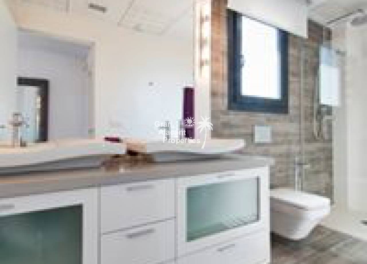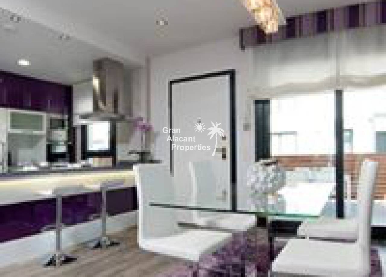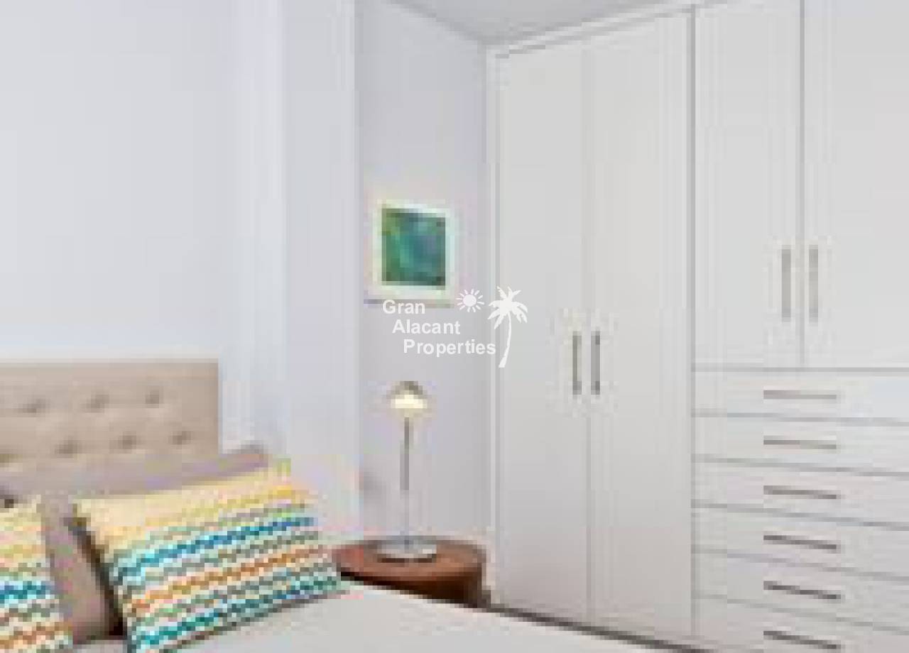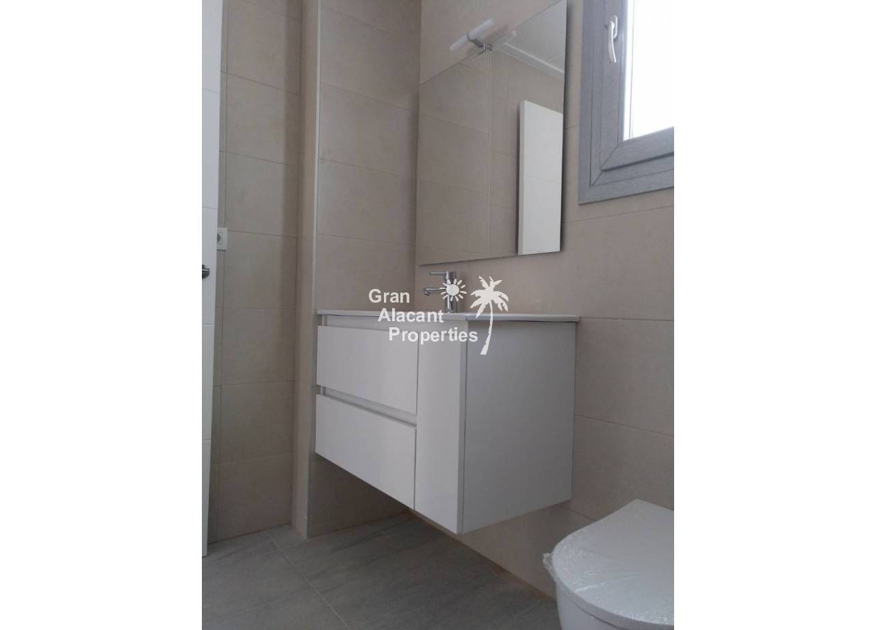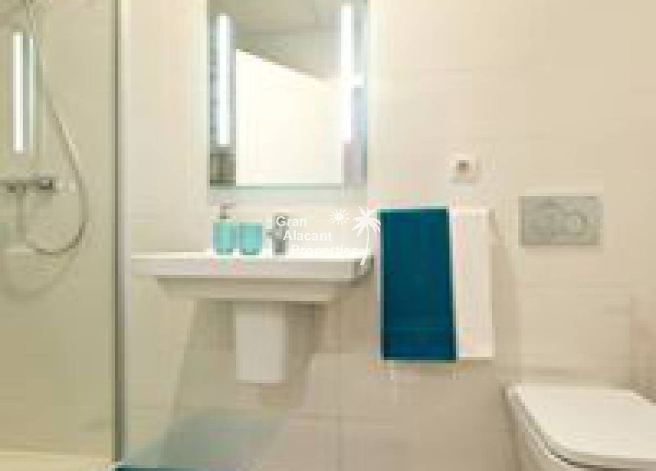 Obra nueva, chalets de lujo con piscina en una comunidad vallada en Gran Alacant. Estas viviendas de 2 plantas en “Gran Alicante” por iHome cuentan con un diseño minimalista elegante y moderno. Hay un gran salón con techo de doble altura y cocina/comedor contigua. Una pared de vidrio en la planta baja asegura que este espacio está inundado de luz. Un baño y un dormitorio doble con armario empotrado completan la planta baja. Subiendo la escalera de cristal y acero a la primera planta, hay un amplio dormitorio principal con cuarto de baño con doble lavabo y un adicional de habitación doble en suite, ambos con armarios empotrados. Estos chalets nuevos contarán con modernos acabados de alta calidad. Todas las ventanas son de vidrio de doble acristalamiento Climalit con la garantía de Sunguard recubrimiento de control solar el lugar se mantiene confortablemente fresco. La cocina dispone de fácil cierre de gabinetes, encimeras de Silestone blanco brillante ingeniería de cuarzo, campana extractora integrada, placa de inducción, y cocina especial del grifo agarre con una sola mano. Los baños cuentan con grifería termostática de ducha, ducha de vidrio de seguridad rodea y puertas de vidrio para la luz máxima. baldosas cerámicas de gran formato modernos se utilizan en toda la propiedad. Hay pre-instalación de aire acondicionado central o de calor, sistema de alarma integrada, puerta de seguridad, persianas automáticas, calentador de agua eficiente de la energía, las paredes de yeso lisas, blancas con puertas interiores de aluminio o de acero de hardware, sistema de entrada de vídeo, mucho más. En el exterior, estos chalets cuentan con un gran espacio al aire libre. Situado en una parcela de 250-330 m2, estas villas tienen un jardín privado con sistema de riego y un moderno 6 x 3 metros piscina privada rodeada de baldosas no deslizantes. La piscina está incluido en el precio. Hay una terraza en la planta baja, que colinda con la sala de estar. El nivel de la terraza y el salón están al mismo nivel que ofrece un acceso casi sin barreras para las personas con movilidad reducida. La característica de villas es un solarium de 65 m2 en la azotea con barandilla de vidrio de seguridad a lo largo del frente de la casa. Pavimentado con aislante baldosas de cerámica resistente al
