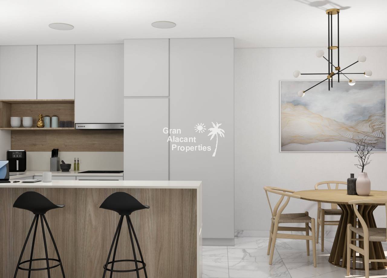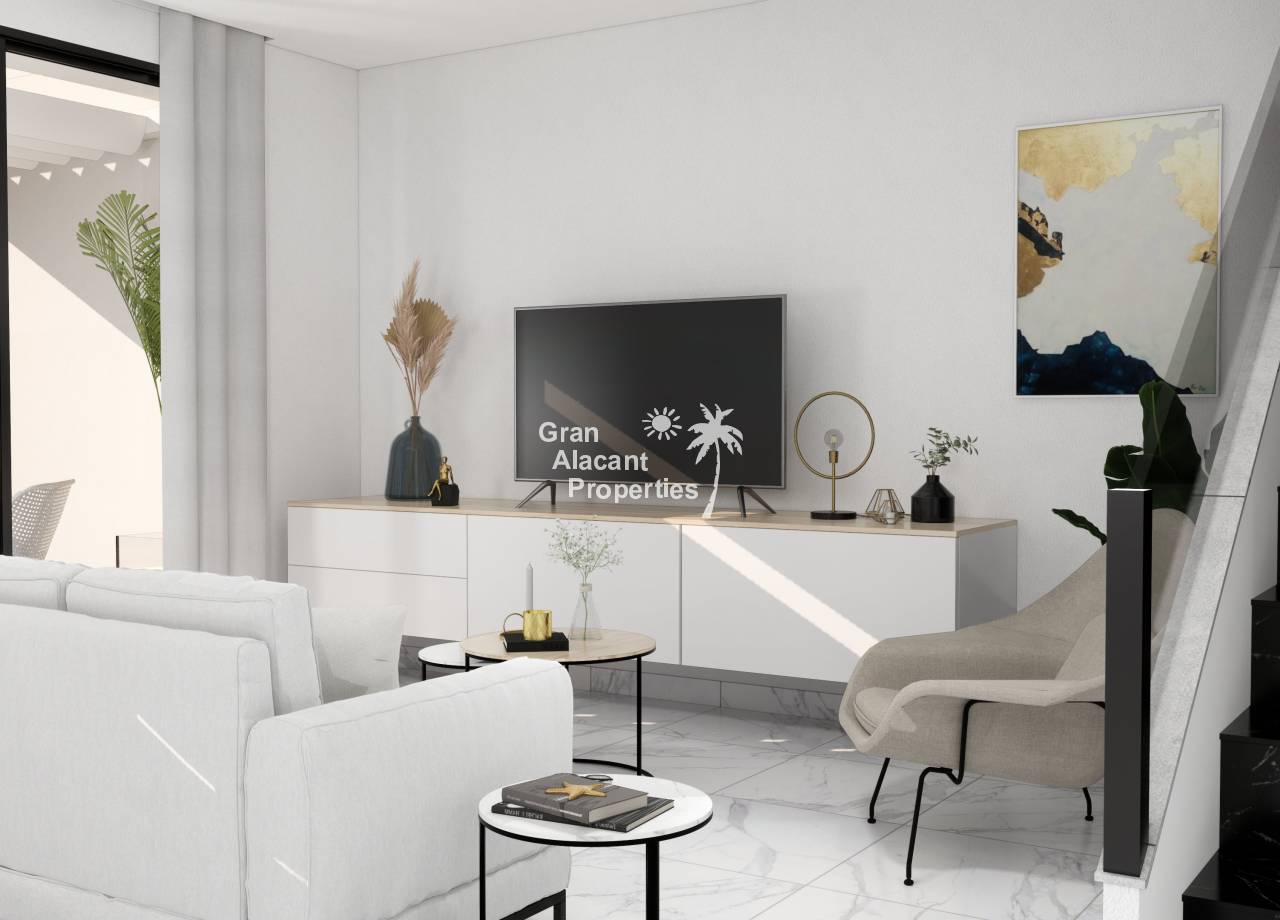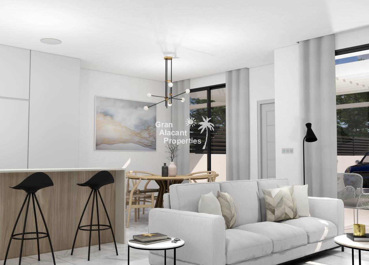 Destacan por sus interiores elegantes y funcionales. El diseño moderno incluye un amplio salón/comedor que se abre al jardín, perfecto para el entretenimiento. La cocina abierta está equipada con electrodomésticos integrados de alta calidad. En la planta baja, el dormitorio principal cuenta con vestidores y baño en suite, mientras que hay un baño adicional para invitados. En el primer piso, dos dormitorios dobles con armarios empotrados ofrecen espacio adicional para la familia o invitados. Opciones como el solárium en la azotea agregan un toque de lujo. Estos interiores combinan estilo y funcionalidad para crear un hogar confortable y contemporáneo en la hermosa Costa Blanca.