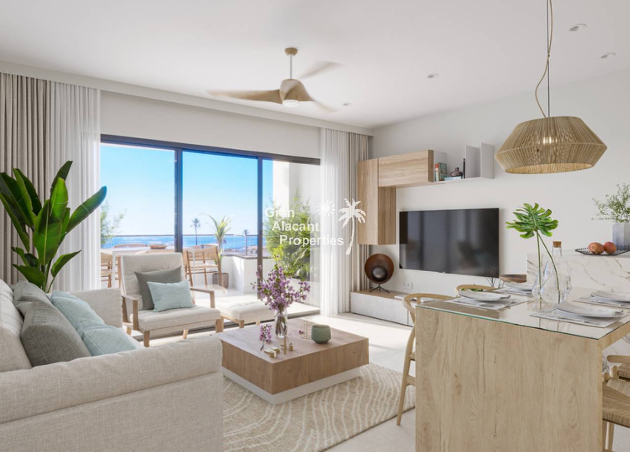 El diseño exterior de esta promoción destaca por su estética contemporánea y su integración armoniosa con el paisaje costero. Los edificios, de tres niveles, presentan líneas limpias y acabados modernos, reflejando un estilo arquitectónico que combina elegancia y funcionalidad. La promoción se ubica en primera línea de playa, permitiendo que muchas de las viviendas disfruten de vistas directas o laterales al mar. Además, las amplias terrazas privadas, algunas con acceso directo a solariums, ofrecen un espacio adicional al aire libre para disfrutar del clima mediterráneo y de las espectaculares puestas de sol sobre el Mar Menor.