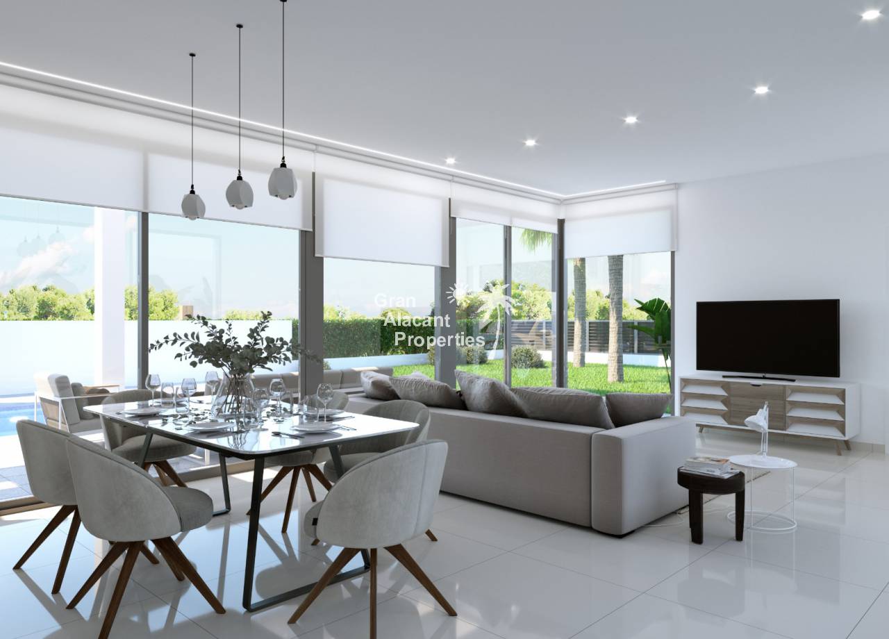 Chalets de lujo de nueva construcción en Sierra Cortina, Costa Blanca, Finestrat-Benidorm. Estos chalets ofrecen lujo elegante y práctico con espacios amplios y cómodos para vivir, acabados de alta calidad y un entorno magnífico con vistas al mar en la soleada costa sureste de España. Todas las casas están orientadas al sur con grandes extensiones de vidrio y techos de 2,40 metros de altura que hacen que los interiores sean luminosos y luminosos durante todo el año.