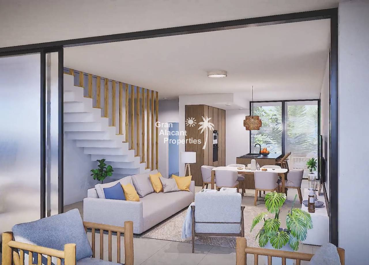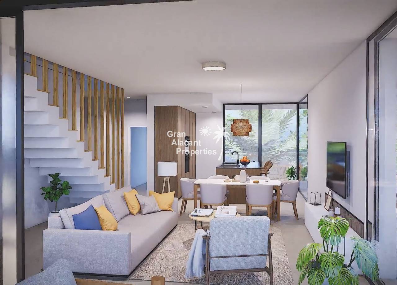 Las viviendas han sido diseñadas con un estilo moderno, minimalista y funcional. El espacio principal integra cocina, comedor y salón en un concepto abierto que favorece la conexión visual con el exterior a través de grandes ventanales correderos. El dormitorio principal destaca por su amplitud e incluye un elegante vestidor y baño en suite. Los techos altos y los acabados en tonos neutros potencian la sensación de espacio y luminosidad, creando un ambiente fresco y acogedor. Además, se incorpora un segundo baño completo, uno o dos dormitorios de invitados con armarios empotrados, y una práctica zona de lavandería independiente.