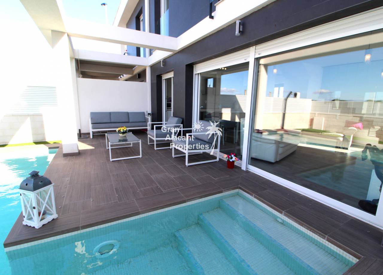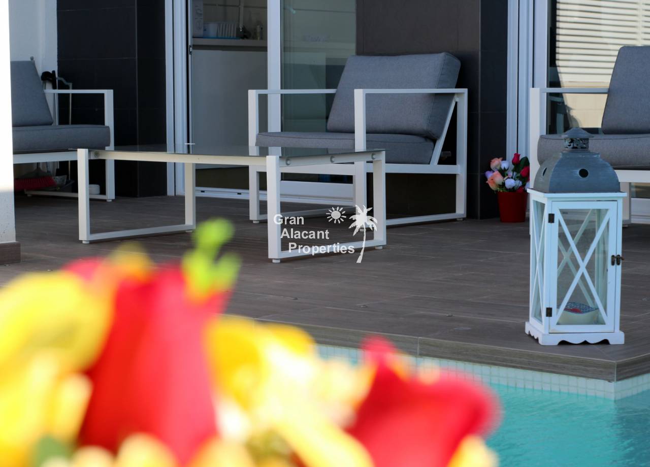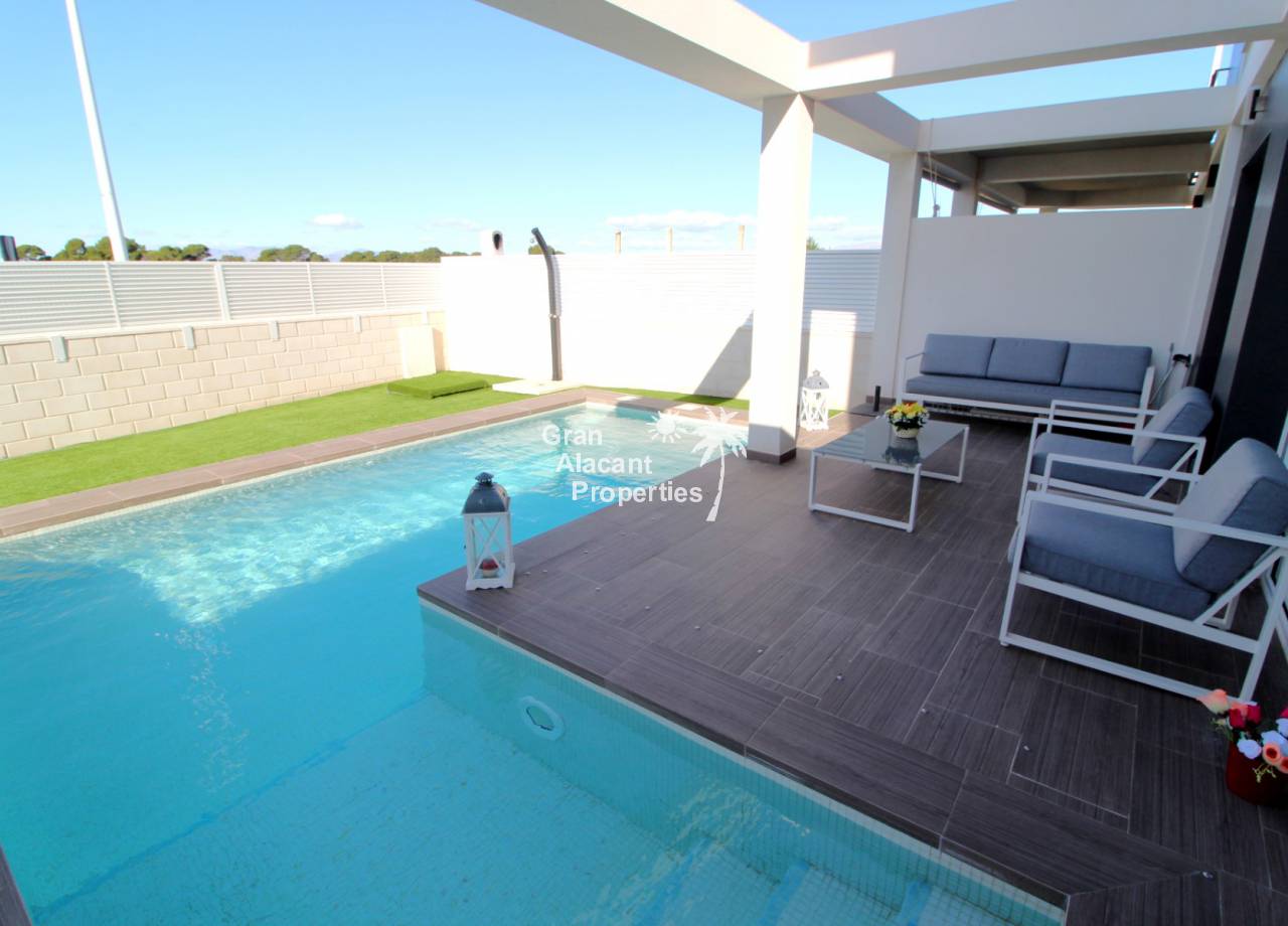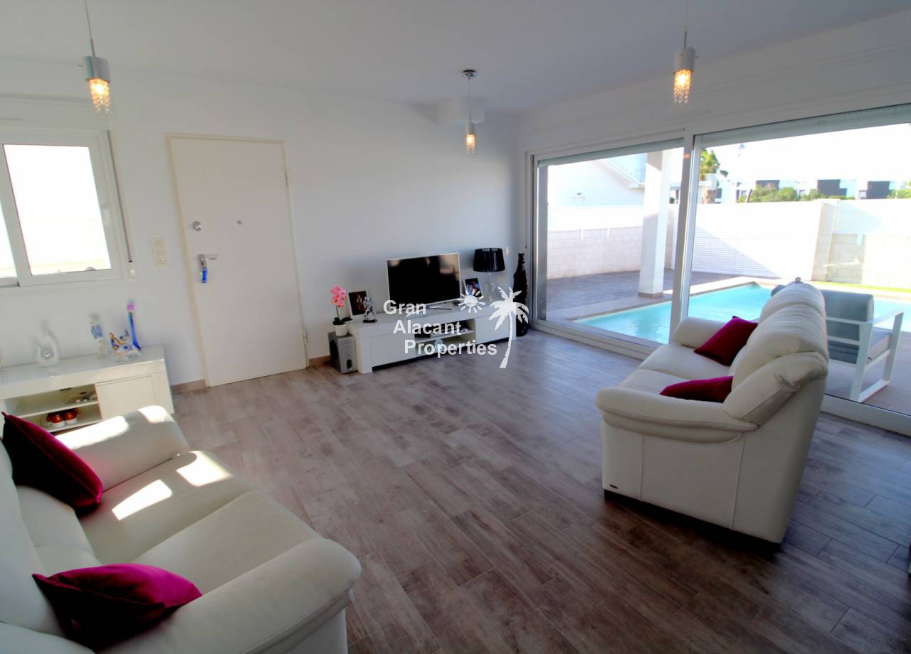 Gran Alacant Properties se enorgullece en ofrecer esta linda villa semi-adosada "Key Ready", una moderna villa de lujo con piscina que se construyó en 2018 en el Bajo Gran Alacant. Esta nueva villa está orientada al suroeste, por lo que es soleada y luminosa y cuenta con acabados modernos de alta calidad que incluyen encimeras de cuarzo y campana extractora de acero inoxidable en la cocina, así como ventanas de doble acristalamiento Climalit, puertas correderas de PVC, calefacción central por conductos y aire acondicionado, Iluminación ambiental LED, sistema de TV Satelitte, un calentador de agua caliente de bajo consumo y mucho más.