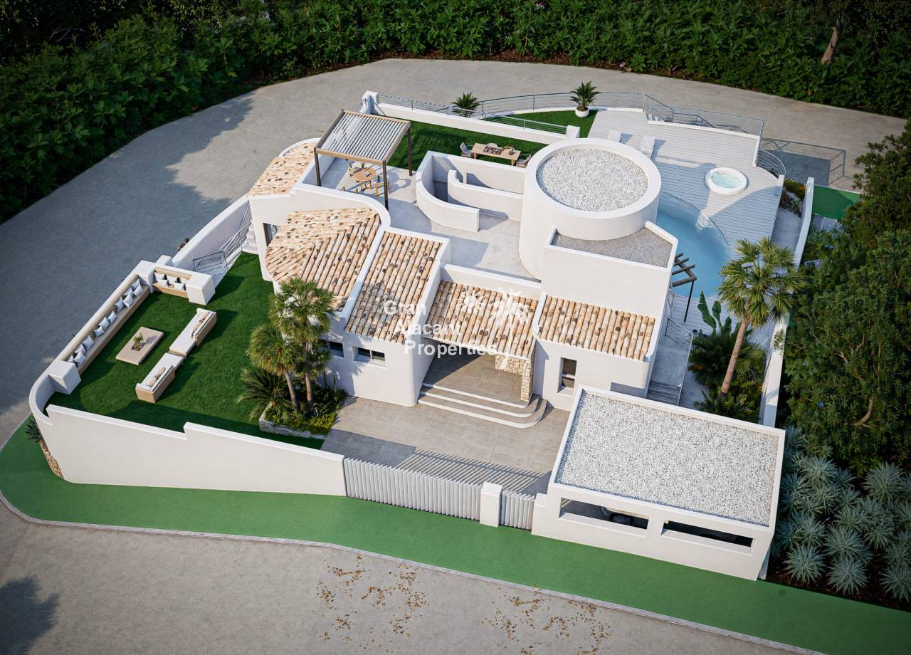 Situada sobre una generosa parcela de 970 m² orientada al sur, la villa ofrece múltiples espacios exteriores pensados para el descanso y la vida al aire libre. Sus distintas terrazas, algunas cubiertas y otras abiertas, están diseñadas para aprovechar al máximo la luz natural y las espectaculares vistas al mar. En la terraza superior, una zona chill-out con pérgola y solárium invita a disfrutar de cada amanecer y atardecer con la máxima intimidad. En la planta inferior, el jardín y el comedor exterior completan un entorno perfecto para largas veladas mediterráneas.