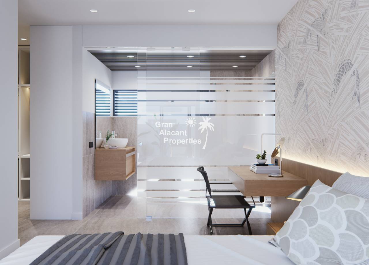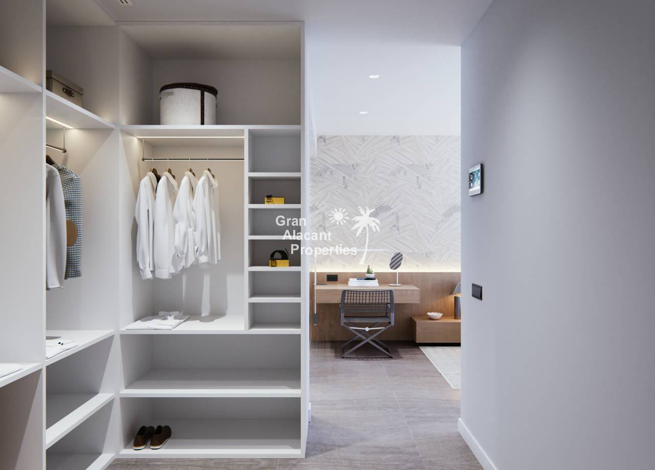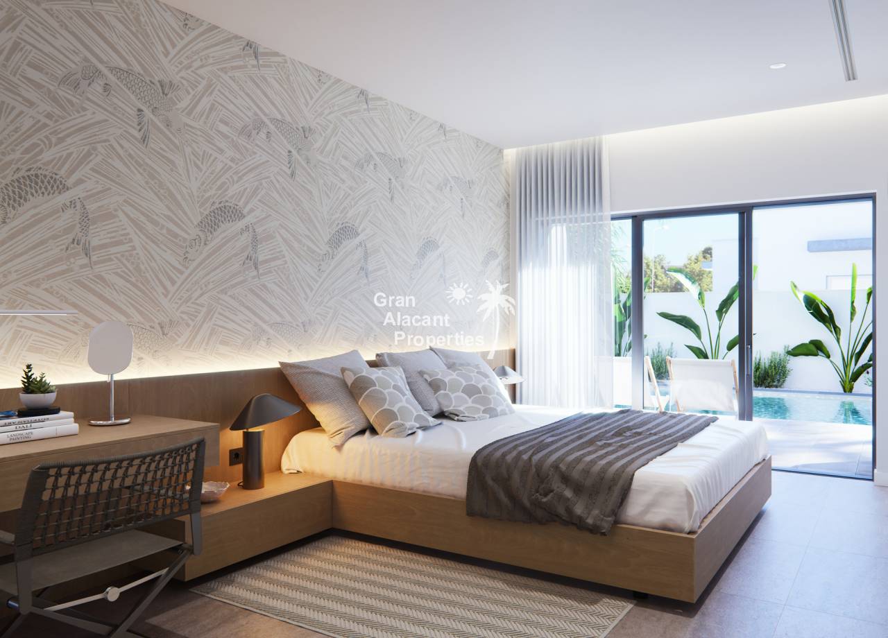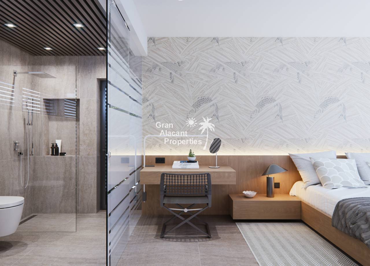 En su interior, cada villa ha sido pensada para crear un microclima confortable durante todo el año, gracias a su óptimo aislamiento térmico y acústico. Disponen de tres dormitorios amplios, todos con armarios empotrados, y cuatro baños completos, incluyendo un dormitorio principal con vestidor y baño en suite. La cocina, moderna y de concepto abierto, está completamente amueblada y equipada con electrodomésticos de alta gama integrados, y se conecta con un salón luminoso gracias a grandes ventanales con acceso directo a la piscina y el jardín. Los baños incluyen aparatos suspendidos, grifería termostática y acabados de primera calidad.