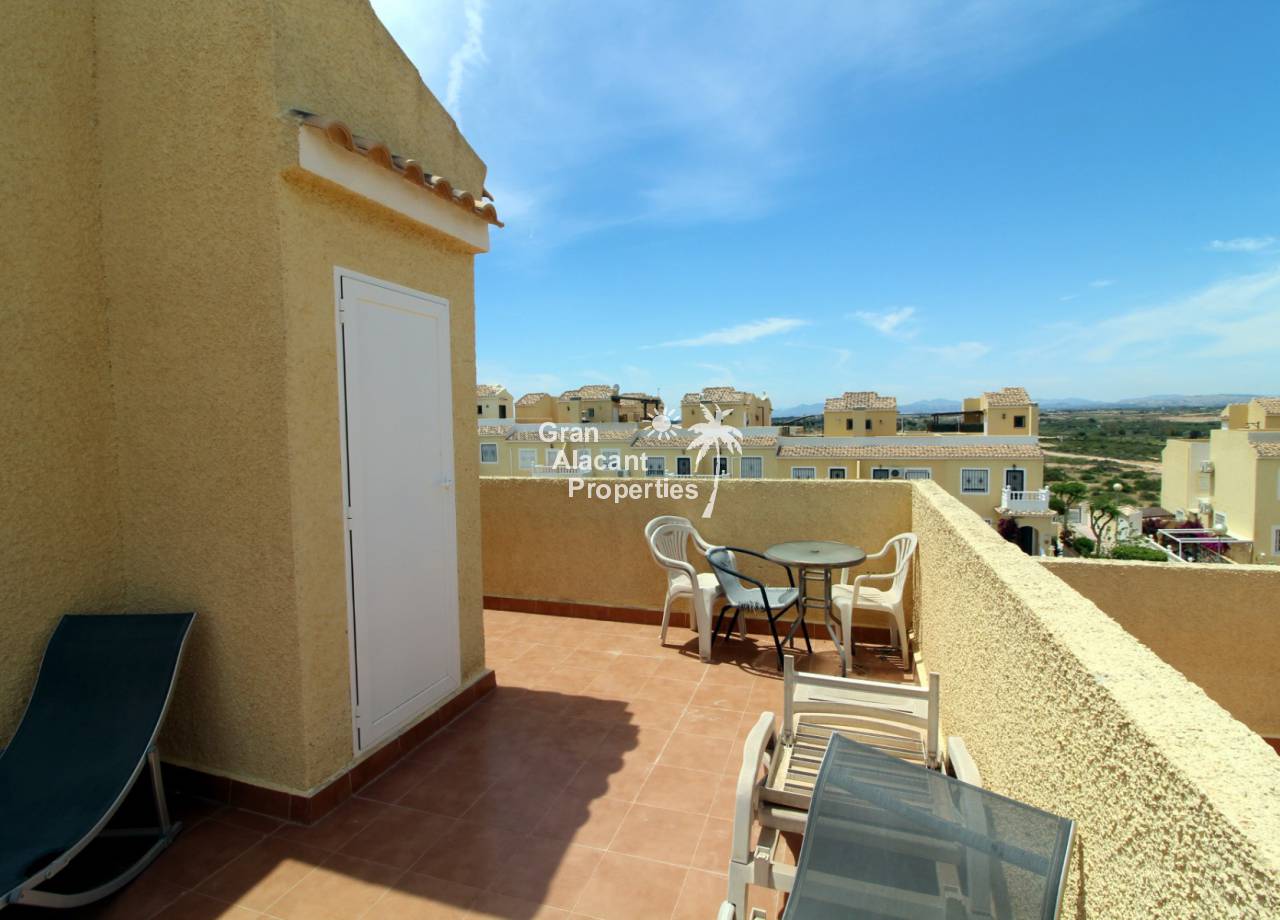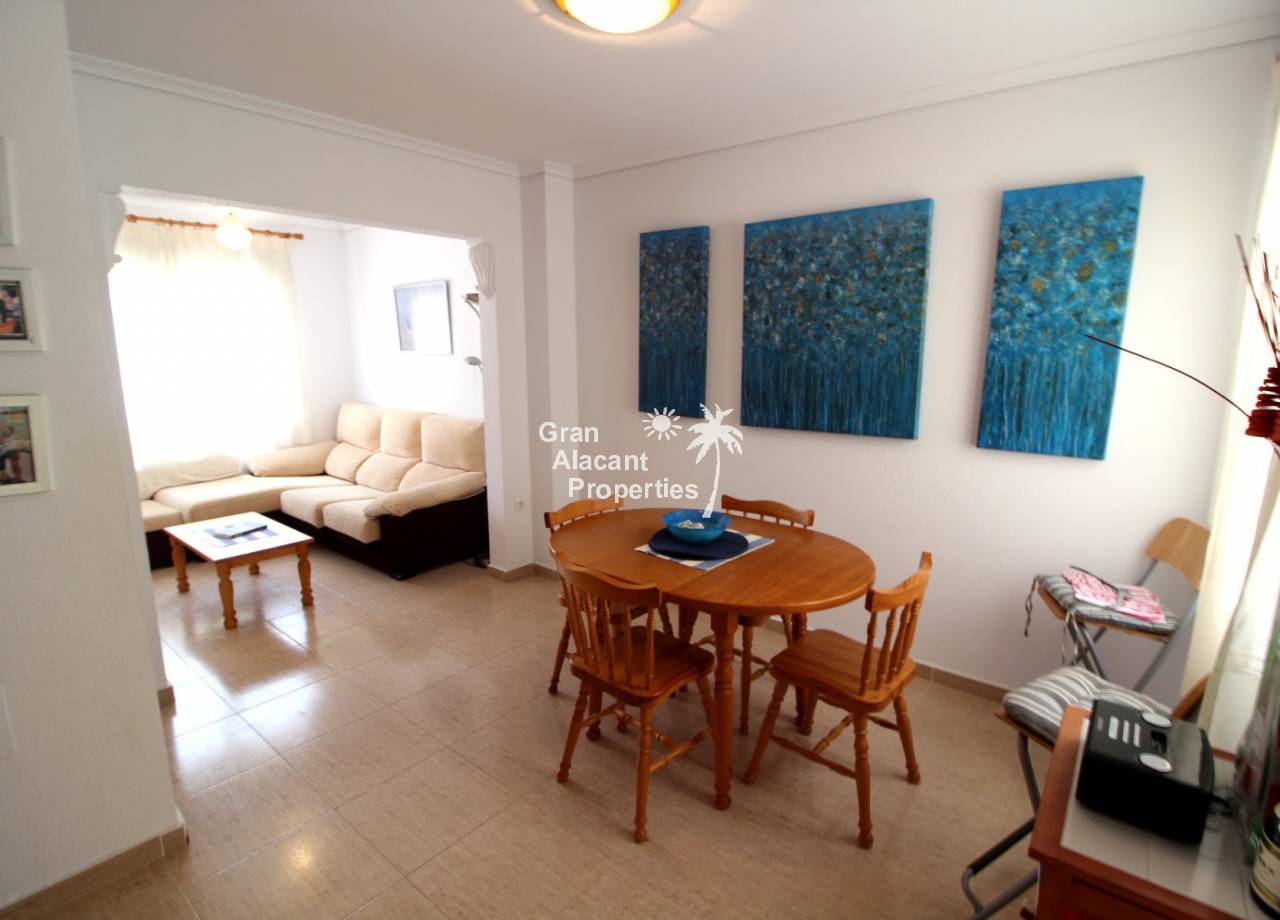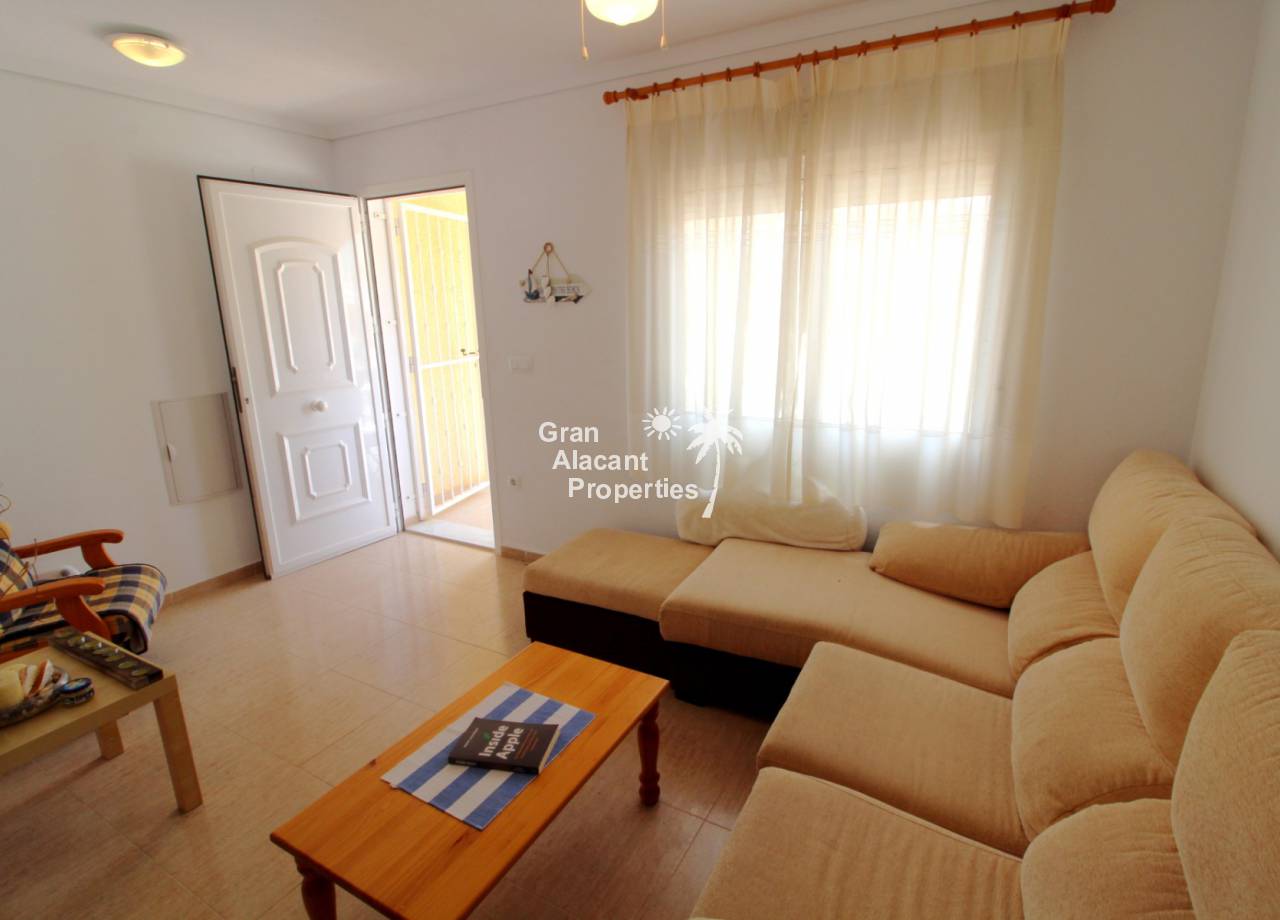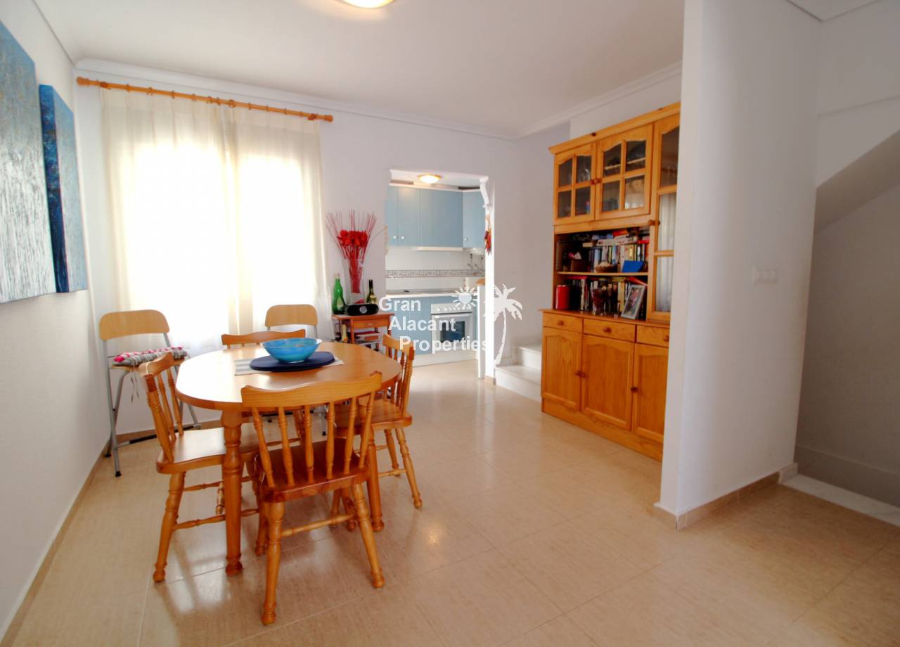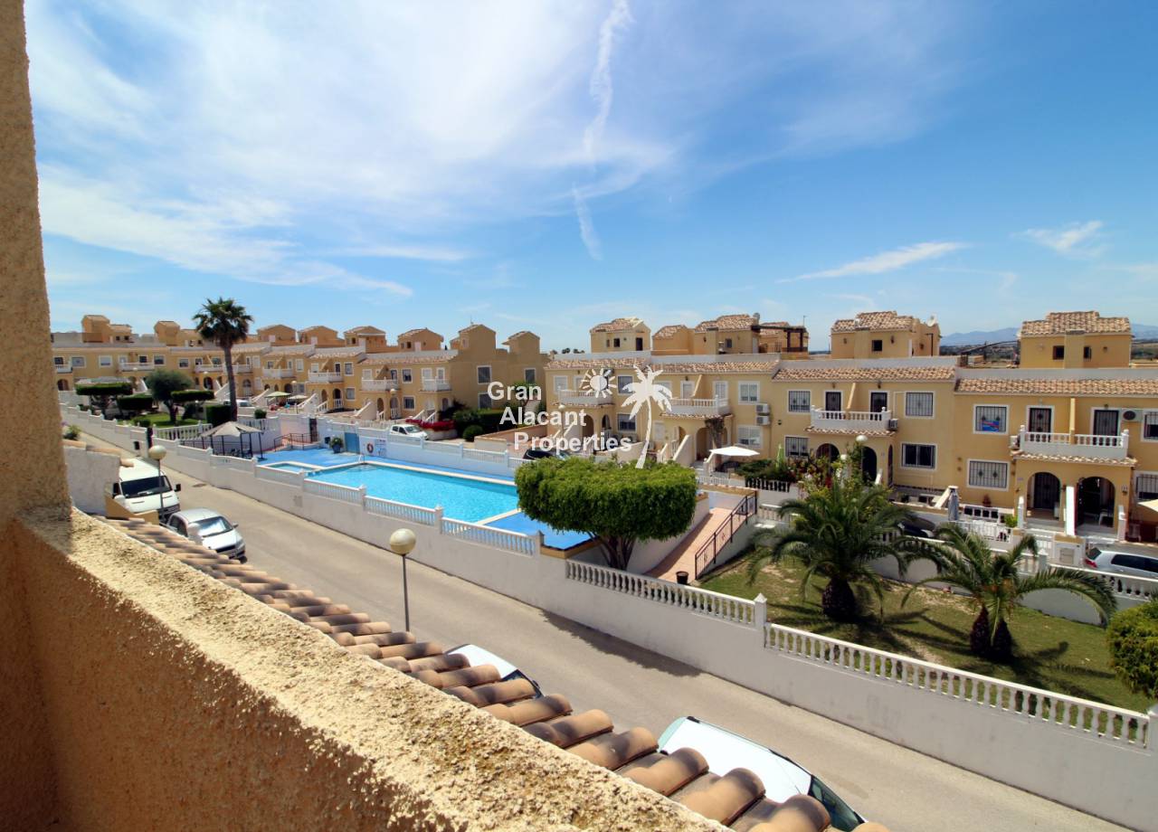Casa adosada en venta en Gran Alacant en la soleada Costa Blanca de España. Ubicada en una popular comunidad cerrada en la parte baja de Gran Alacant (zona colegio) a poca distancia de la playa de Carabassi, esta casa tiene vistas a la hermosa piscina y jardines comunitarios. Esta casa adosada estilo "Aurora Plus" cuenta con un diseño único con una sala de estar / comedor más grande que lo normal. Una cocina de estilo americano y una galería abierta completan la planta baja. En la primera planta, hay un dormitorio principal con aire acondicionado con armarios empotrados para él y ella y balcón privado, un segundo dormitorio con aire acondicionado y armario empotrado, y un baño familiar. Hay un gran semisótano con aire acondicionado y ventana para luz natural y ventilación. El propietario actual usa este espacio adicional como otro sala de estar, habitación de invitados y zona de almacenamiento. Además, hay un cuarto de ducha conveniente para los huéspedes. Hay rejas de seguridad y la propiedad se vende amueblada, incluidos todos los electrodomésticos, por lo que la casa está literalmente lista para entrar y vivir.