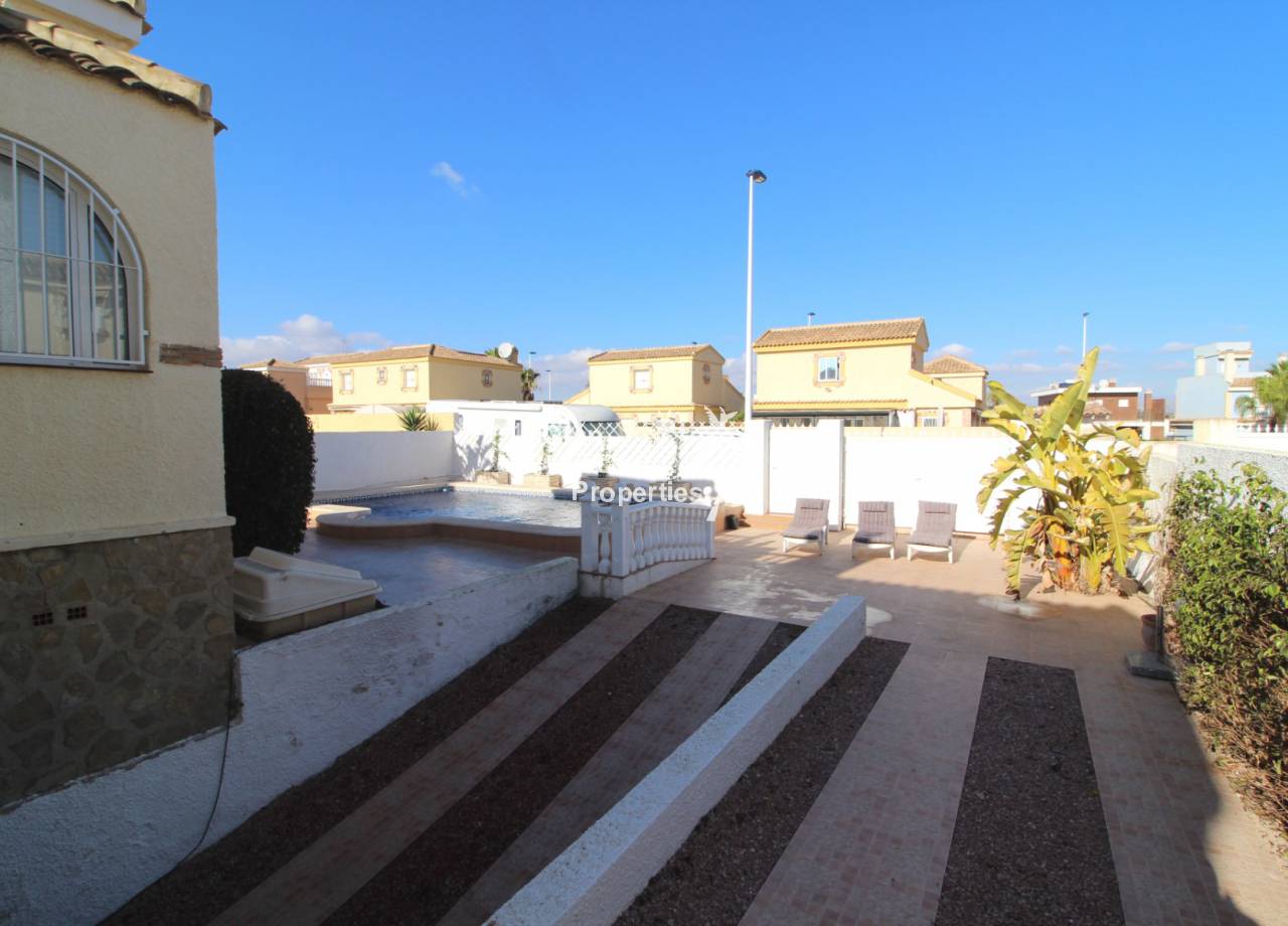 En el exterior, el jardín de bajo mantenimiento (400 m²) ofrece mucho espacio para entretenerse o disfrutar del sol español durante todo el año. Lo mejor de todo es la piscina privada perfecta para refrescarse en esos calurosos días de verano. La belleza de esta casa es que puedes caminar alrededor de ella, así que tienes acceso de 360 grados, esto significa que siempre tendrás sol y sombra en algún lugar de tu jardín en algún momento del día.