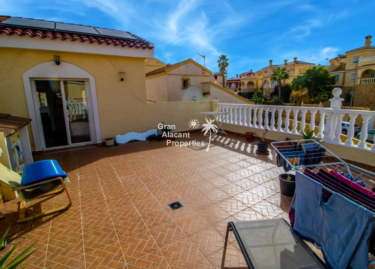 El solárium es un refugio soleado para los ocupantes de la planta superior. La balaustrada curva, el bonito pavimento tipo ladrillo y las vistas al parque, a las montañas y hacia Alicante hacen de este espacio un lugar ideal para relajarse. Los paneles solares están instalados en la cubierta y también hay un trastero bajo el techo. Además, en el solárium hay un cuarto de lavandería construido a medida con espacio para lavadora y almacenaje, perfecto para tender la ropa al sol.