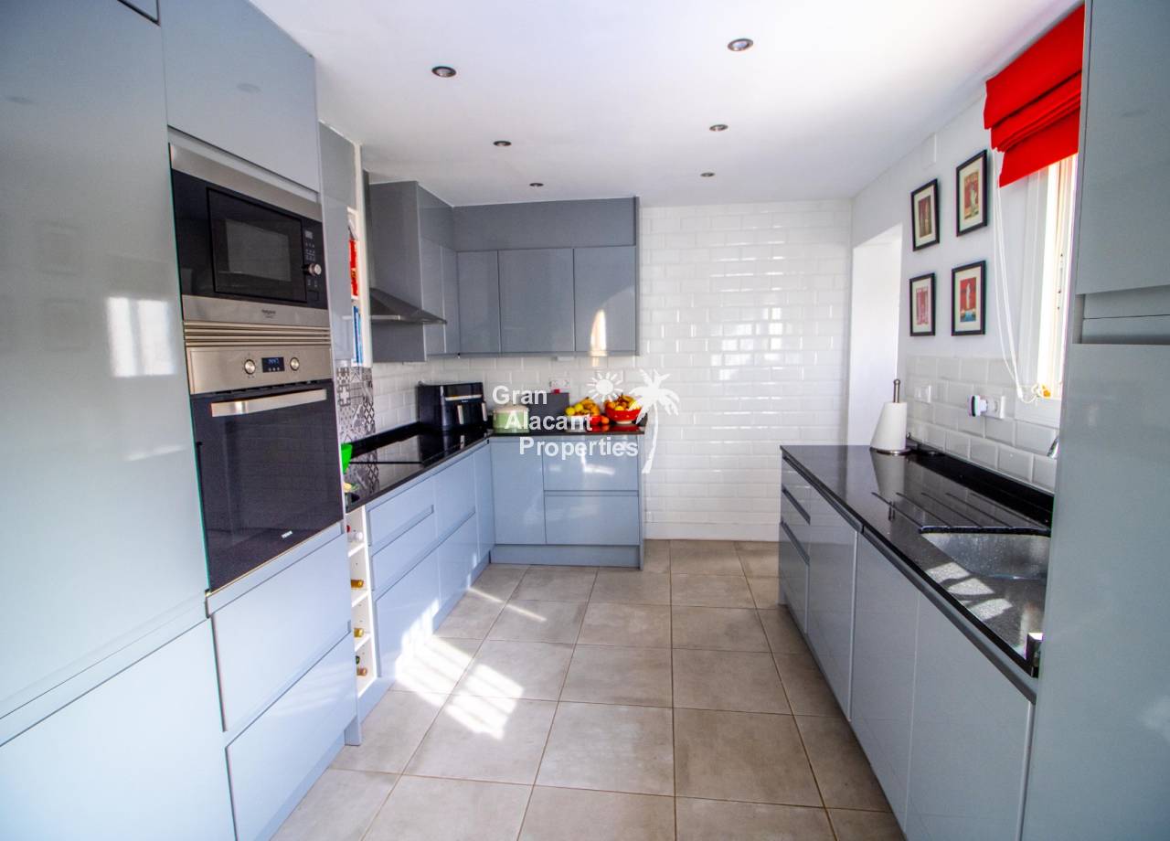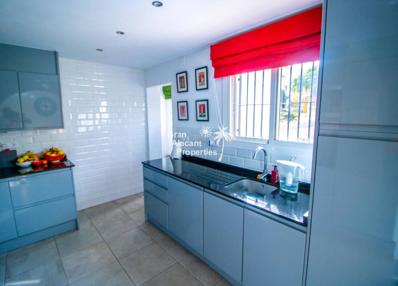 Junto al comedor se encuentra la cocina, completamente renovada, con armarios modernos de acabado gris brillo, encimera de cuarzo, panel decorativo hidráulico detrás de la placa y un elegante salpicadero de azulejo tipo metro. Mucha superficie de trabajo, gran capacidad de almacenaje y electrodomésticos nuevos hacen de esta cocina un verdadero sueño para quien disfruta cocinando. La ventana sobre el fregadero da al jardín y la piscina, perfecta para vigilar a niños o mascotas. Además, tiene acceso directo al exterior, muy cómodo para las comidas al aire libre.