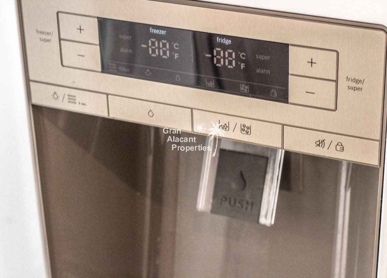 A través del arco se encuentra la cocina actualizada. Un segundo arco funciona como una práctica barra o pasaplatos que mantiene al cocinero conectado con el salón y los invitados. La cocina ha sido renovada con acabados pensados para hacer la vida diaria más agradable como muebles modernos en blanco brillo, encimeras de cuarzo y un frente de vidrio que refleja la luz y hace que el espacio parezca más grande, más luminoso y muy fácil de mantener. Un frigorífico americano de gran capacidad que dispensa agua filtrada y hielo, horno y microondas integrados, lavavajillas, encimera de gas, iluminación LED bajo los muebles, abundante almacenamiento y amplias superficies de trabajo harán feliz a cualquier cocinero. La lavadora está inteligentemente oculta tras una puerta. Una puerta acristalada desde la cocina permite acceder al exterior, ideal para entrar la compra o sacar bebidas al jardín. Además, un trastero junto a la cocina sirve como un espacio muy útil para guardar aspiradoras, fregonas, escobas y similares, así como un lugar para abrigos y botas, y podría convertirse fácilmente en una despensa.