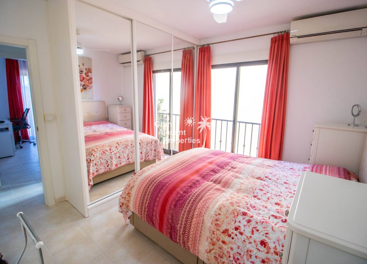 El dormitorio principal es amplio, con espacio para una cama grande, armario empotrado, aire acondicionado por split y calefacción mediante radiador eléctrico. Una ventana de suelo a techo con balcón francés da al lateral de la casa y llena la habitación de luz natural. El baño ensuite ha sido renovado con muy buen gusto e incluye un moderno mueble de lavabo, espejo LED, ducha con mampara de cristal y azulejos contemporáneos.