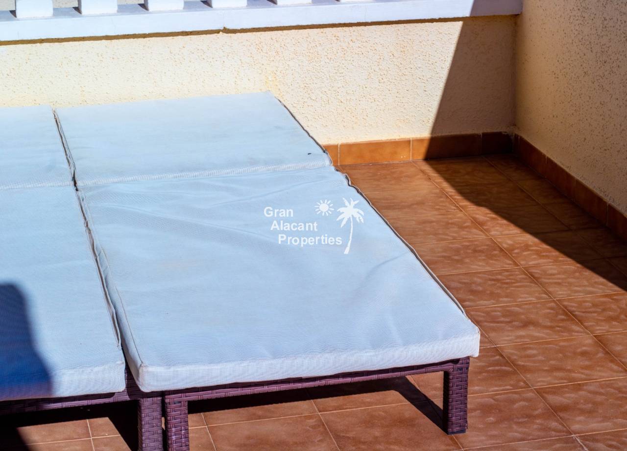 Además, el gran solárium ofrece otro espacio exterior privado, un lugar soleado para pasar las horas con una preciosa vista del Mediterráneo azul. En días despejados incluso puedes ver el Peñón de Calpe y Benidorm a lo lejos. Al estar en lo alto del acantilado también se disfrutan vistas ocasionales de los coloridos parapentistas que despegan desde el mirador junto a la urbanización y que se han convertido en una imagen icónica del cielo de Gran Alacant. Sería un lugar excelente para instalar una cocina de verano. El solárium se accede por la escalera interior.