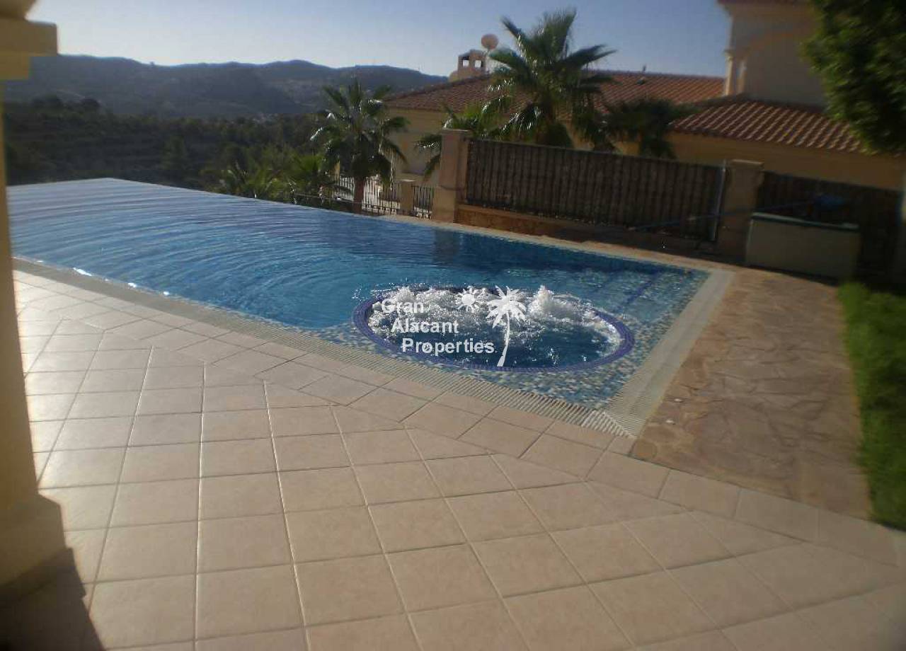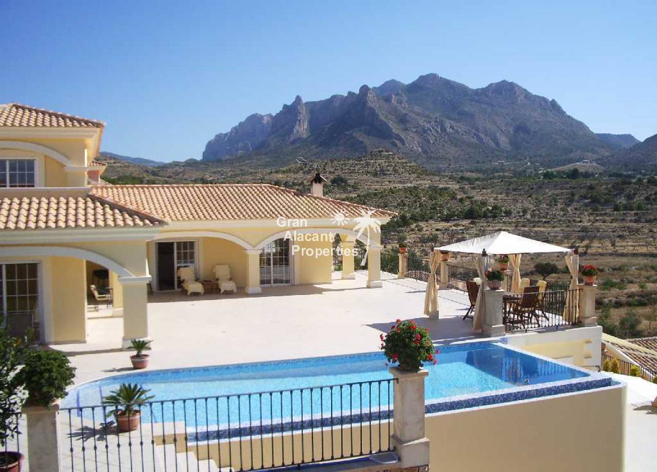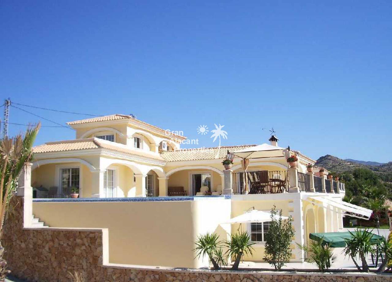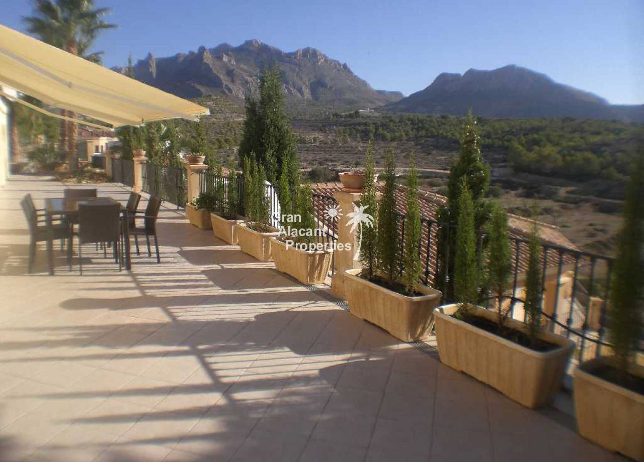 Gran chalet independiente en venta en Busot en la soleada Costa Blanca de España. Esta casa de lujo disfruta de increíbles vistas de las montañas, espacios verdes, el Mediterráneo, Playa San Juan, El Campello y más. La propiedad ofrece 554 m2 de espacio habitable con más de 200 m2 de espacio exterior en varias terrazas, todas con impresionantes vistas.
