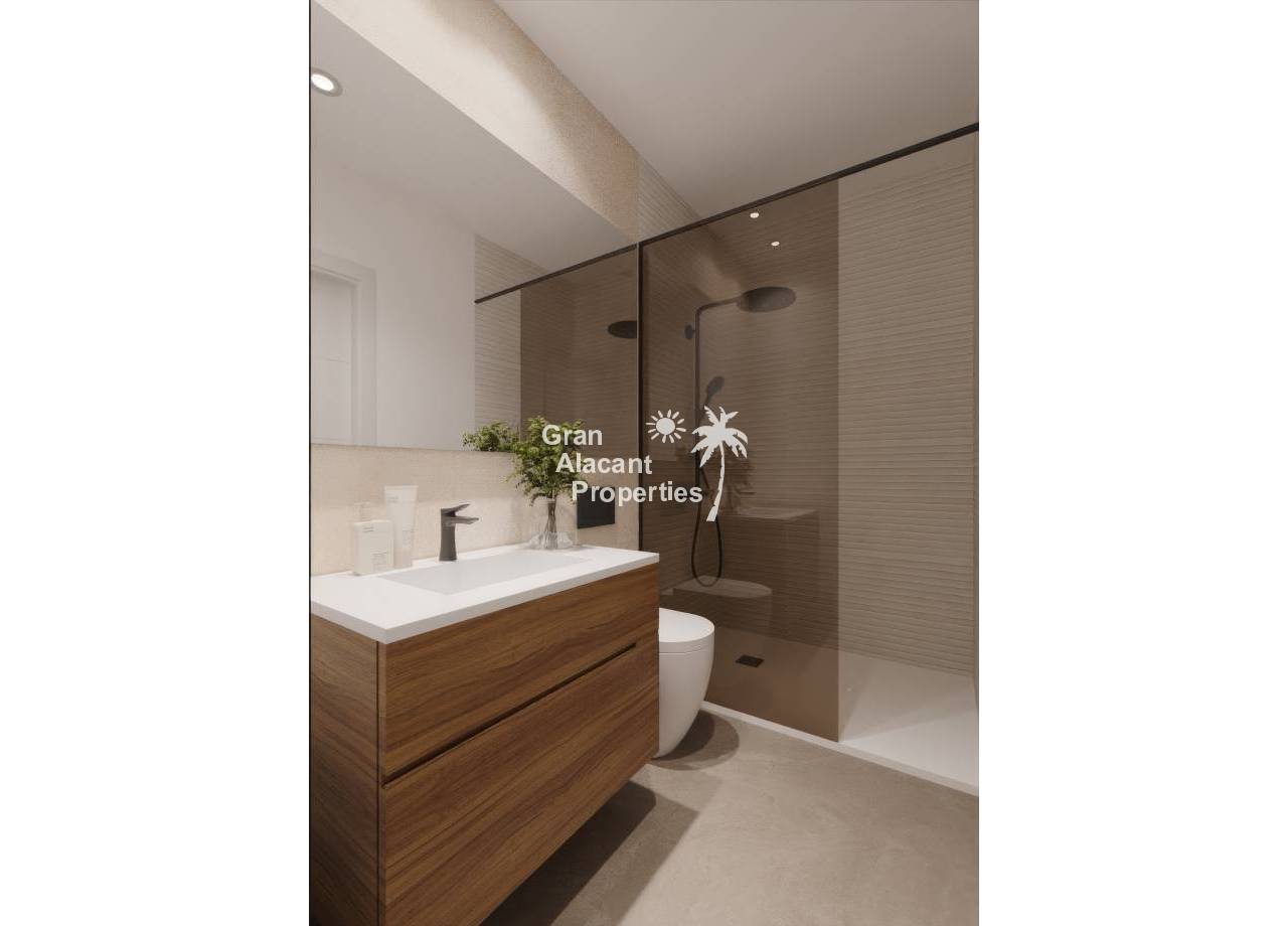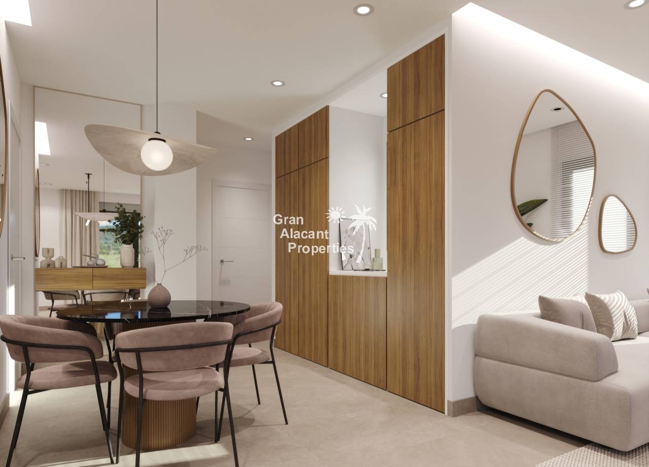 El interior de las viviendas está cuidadosamente diseñado para ofrecer comodidad y estilo. Los suelos de gres porcelánico aportan un toque moderno y son fáciles de mantener. Cada propiedad está equipada con un videoportero, garantizando seguridad y comodidad. Los armarios empotrados proporcionan un amplio espacio de almacenamiento, manteniendo los espacios ordenados y funcionales. Además, la preinstalación de aire acondicionado asegura que los residentes puedan disfrutar de un ambiente agradable durante todo el año. Las viviendas cuentan con dos dormitorios y dos baños, ofreciendo un espacio adecuado para familias o parejas.