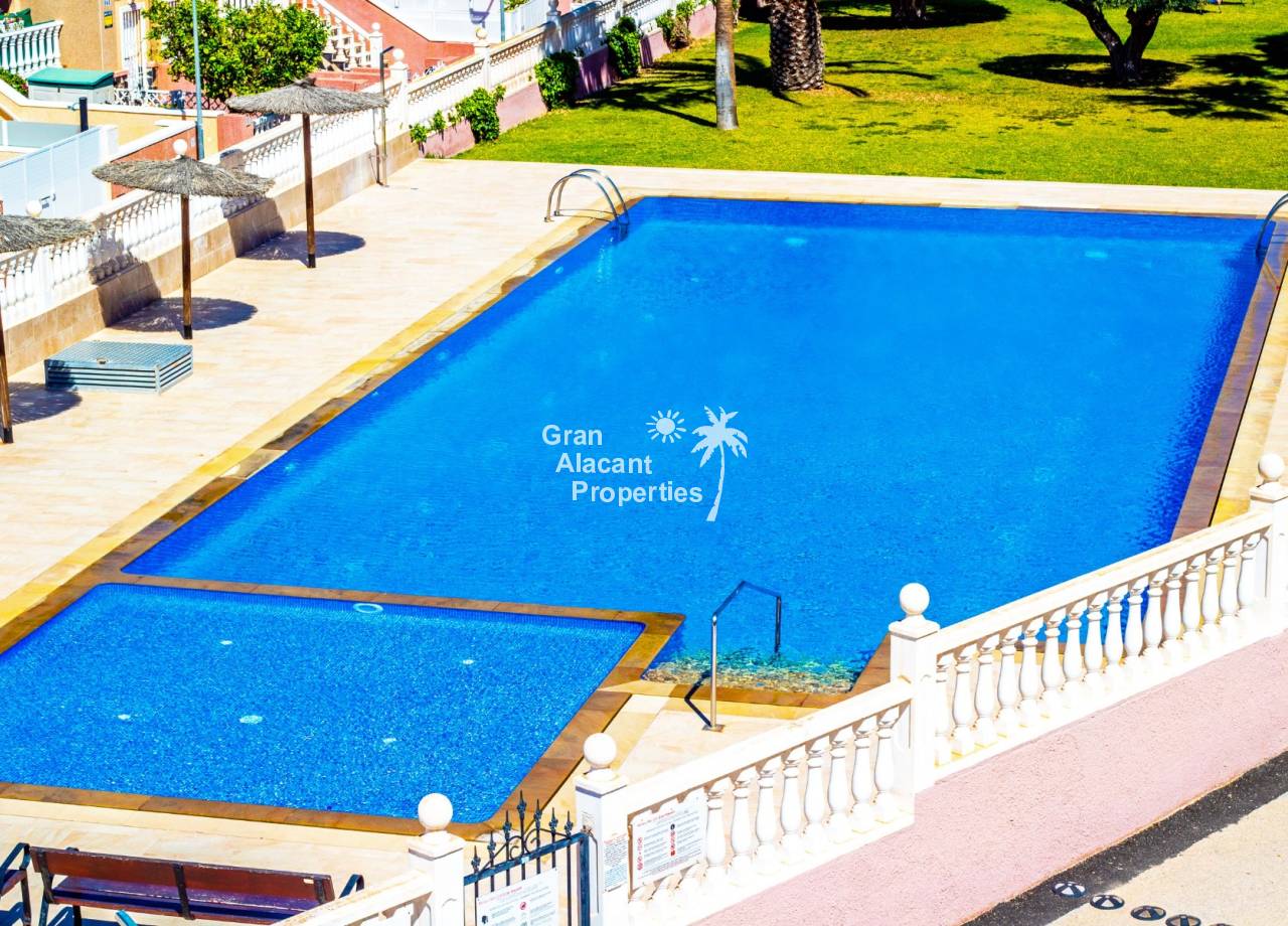 Ubicada en una comunidad muy demandada, junto a los barrancos arbolados de la parte alta de Gran Alacant, la vivienda cuenta con acceso a una piscina comunitaria recientemente renovada con sistema de agua salada, más suave para la piel y el cabello, además de aseos y una zona de césped bien cuidada. También hay una pista de petanca a pocos pasos. La ubicación es inmejorable, con cafeterías, bancos, restaurantes, peluquerías y supermercado a poca distancia a pie. El parque natural del Clot de Galvany, con zonas de observación de aves y búnkeres de la Guerra Civil, se encuentra cerca, y las playas de arena de Los Arenales y Carabassi están a un corto paseo o a pocos minutos en coche. Las opciones de transporte público incluyen autobuses a Alicante y Santa Pola, el bus circular de Gran Alacant, conexión directa al aeropuerto y enlaces desde Arenales a Elche, lo que facilita desplazarse sin necesidad de coche.