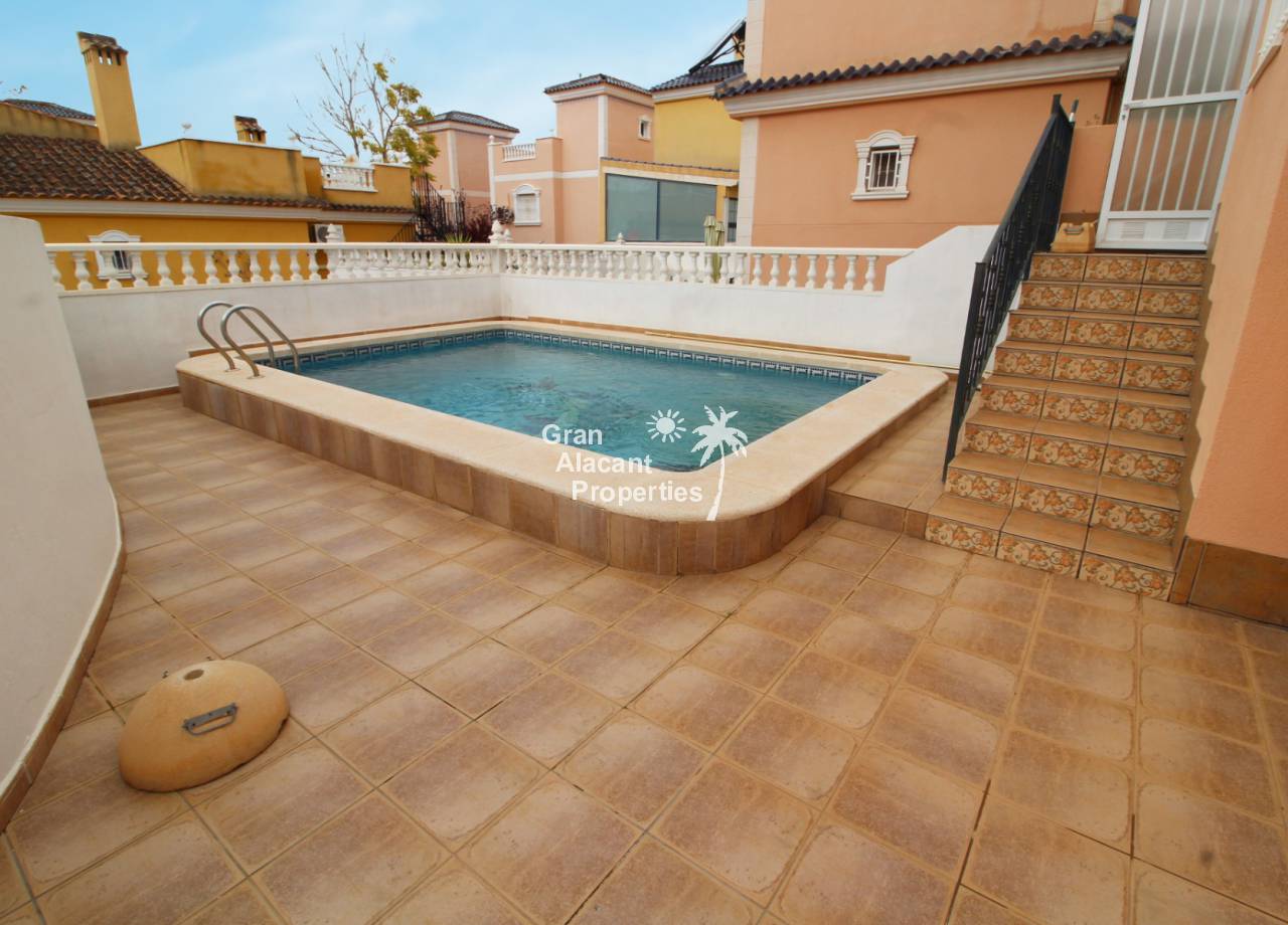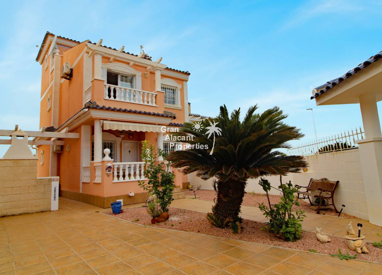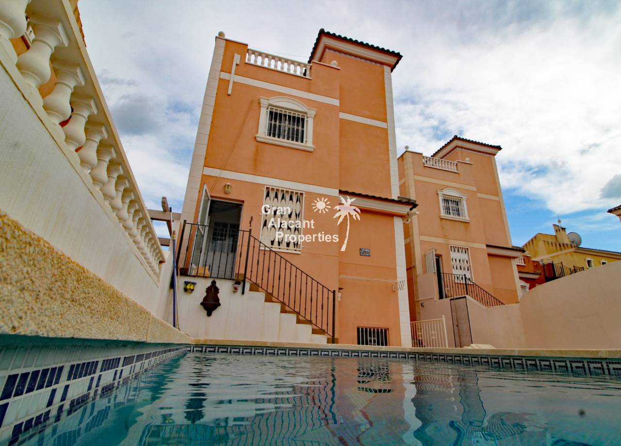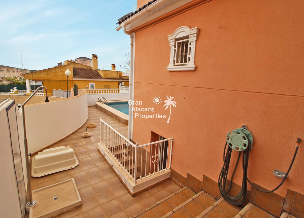 Villa independiente bien presentada ubicada en la codiciada comunidad de Puerto Marino en Gran Alacant en la soleada Costa Blanca de España. Esta villa cuenta con 3 habitaciones dobles con aire acondicionado y armarios empotrados (1 en suite), 2 baños y un aseo de invitados, salón comedor con aire acondicionado y chimenea abierta, un gran jardín de bajo mantenimiento (parte delantera, lateral y trasera de la casa). ) con una piscina privada en el lado sur de la casa, un porche delantero cubierto, un balcón en el dormitorio principal, un solárium soleado con excelentes vistas al campo y una cocina independiente con lavadero. Hay doble acristalamiento junto con sombrillas (toldos), un sótano para almacenamiento, rejas de seguridad, ventiladores de techo, aire acondicionado. La casa está construida con un buen estándar y viene con muchas características agradables. Se vende amueblado y equipado, por lo que está listo para entrar a vivir y empezar a vivir el sueño.