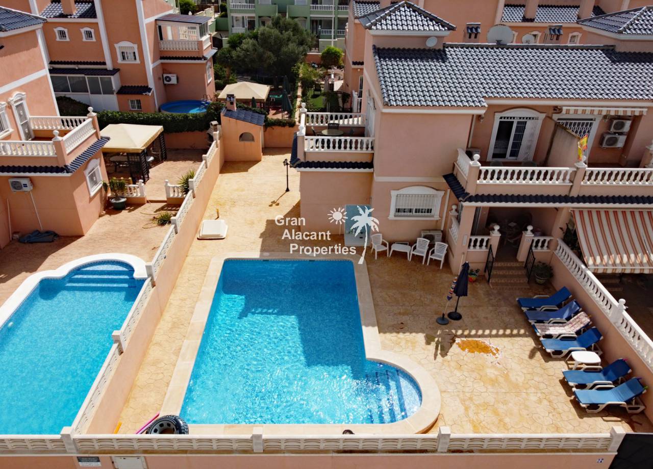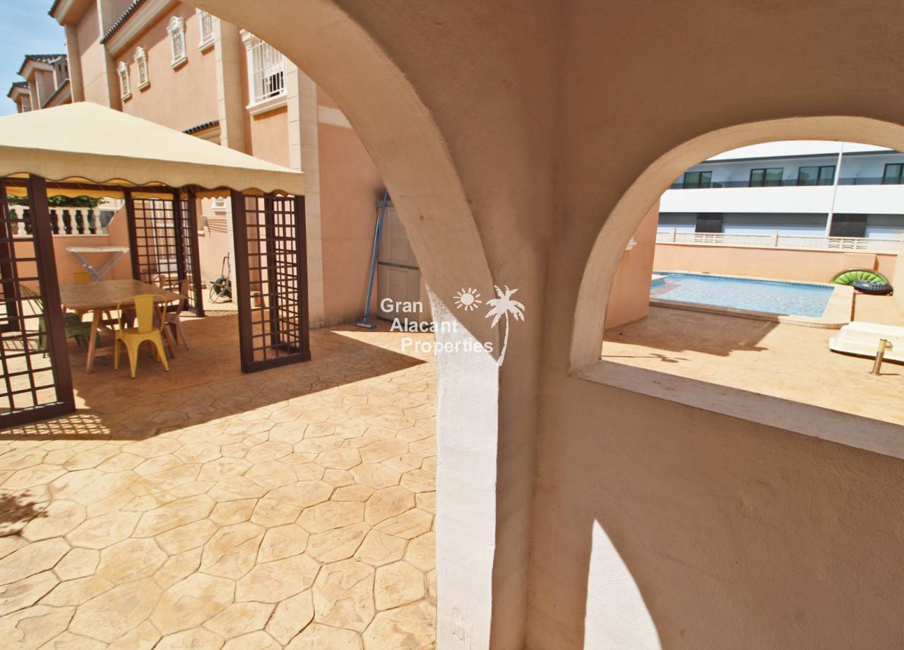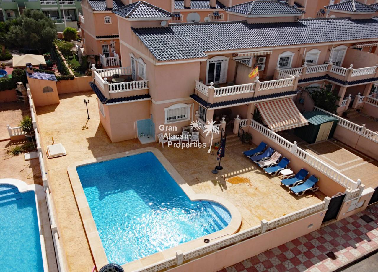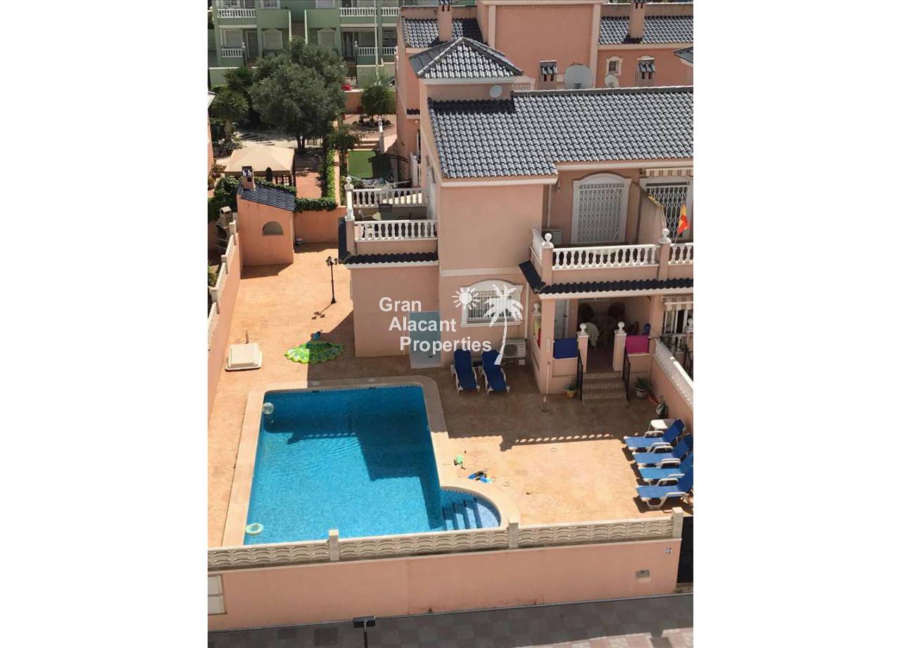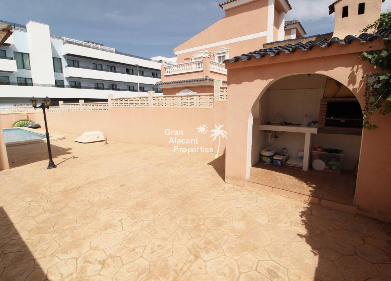 Casa adosada bien presentada ubicada en la codiciada comunidad de Puerto Marino en Gran Alacant en la soleada Costa Blanca de España. Esta casa cuenta con 3 dormitorios dobles con aire acondicionado y armarios (1 en suite y 1 dormitorio en la planta baja), 2 baños familiares, una sala de estar y comedor combinados con aire acondicionado, un gran jardín de bajo mantenimiento (parte delantera, lateral y trasera de la casa) con una piscina privada en el lado oeste de la casa, una cocina de verano/barbacoa, un porche delantero techado, un balcón en el dormitorio principal, un segundo balcón y cocina independiente con lavadero. Tiene doble acristalamiento, TV satelitte, rejas de seguridad, ventilador de techo, aire acondicionado. La casa está construida con un buen estándar y viene con muchas características agradables. También hay acceso a 2 piscinas comunitarias y una zona de juegos para niños. La casa se vende amueblada y equipada, lista para entrar a vivir y empezar a vivir el sueño.