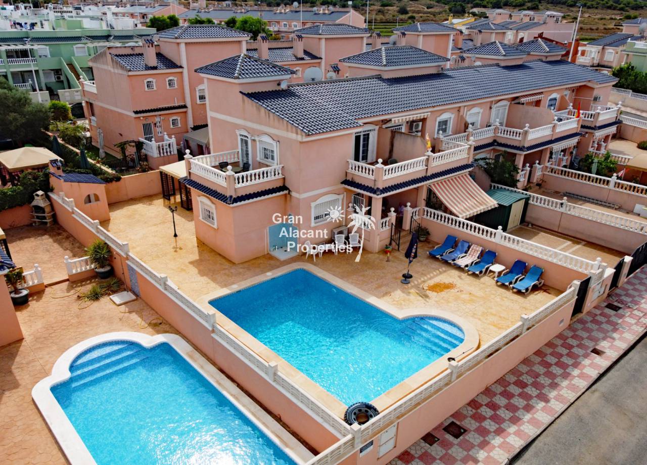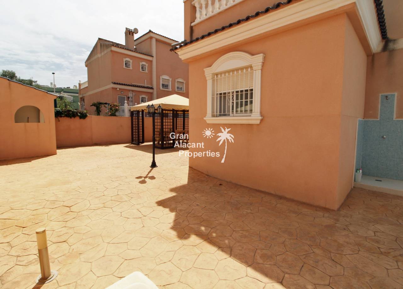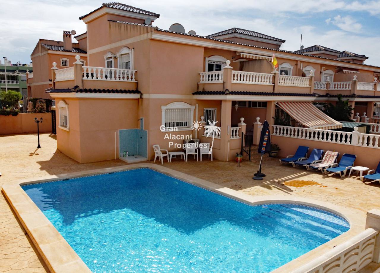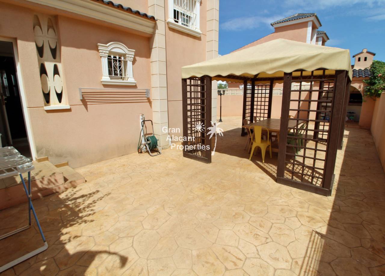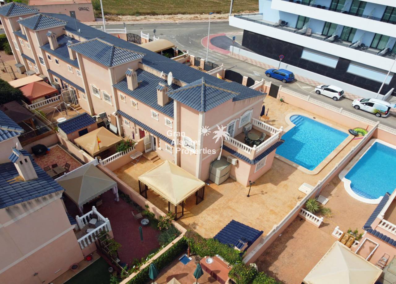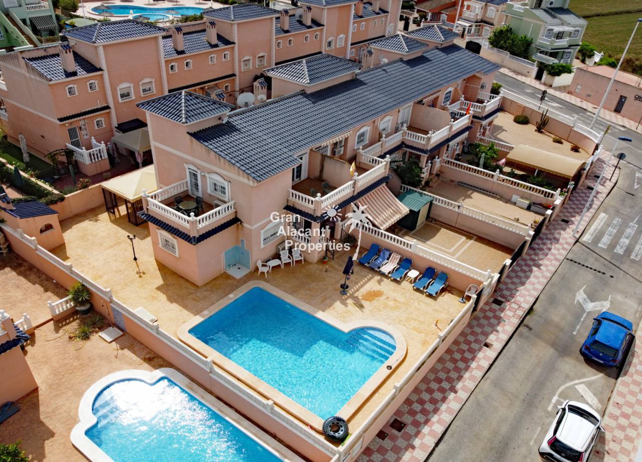 Casa adosada bien presentada ubicada en la codiciada comunidad de Puerto Marino en Gran Alacant en la soleada Costa Blanca de España. Esta casa cuenta con 3 dormitorios dobles con aire acondicionado y armarios (1 en suite y 1 dormitorio en la planta baja), 2 baños familiares, una sala de estar y comedor combinados con aire acondicionado, un gran jardín de bajo mantenimiento (parte delantera, lateral y trasera de la casa) con una piscina privada en el lado oeste de la casa, una cocina de verano/barbacoa, un porche delantero techado, un balcón en el dormitorio principal, un segundo balcón y cocina independiente con lavadero. Tiene doble acristalamiento, TV satelitte, rejas de seguridad, ventilador de techo, aire acondicionado. La casa está construida con un buen estándar y viene con muchas características agradables. También hay acceso a 2 piscinas comunitarias y una zona de juegos para niños. La casa se vende amueblada y equipada, lista para entrar a vivir y empezar a vivir el sueño.