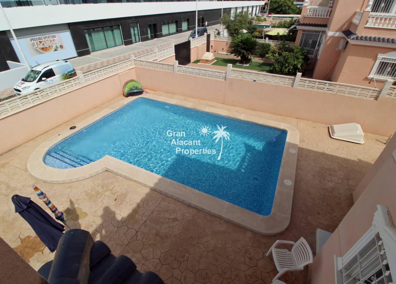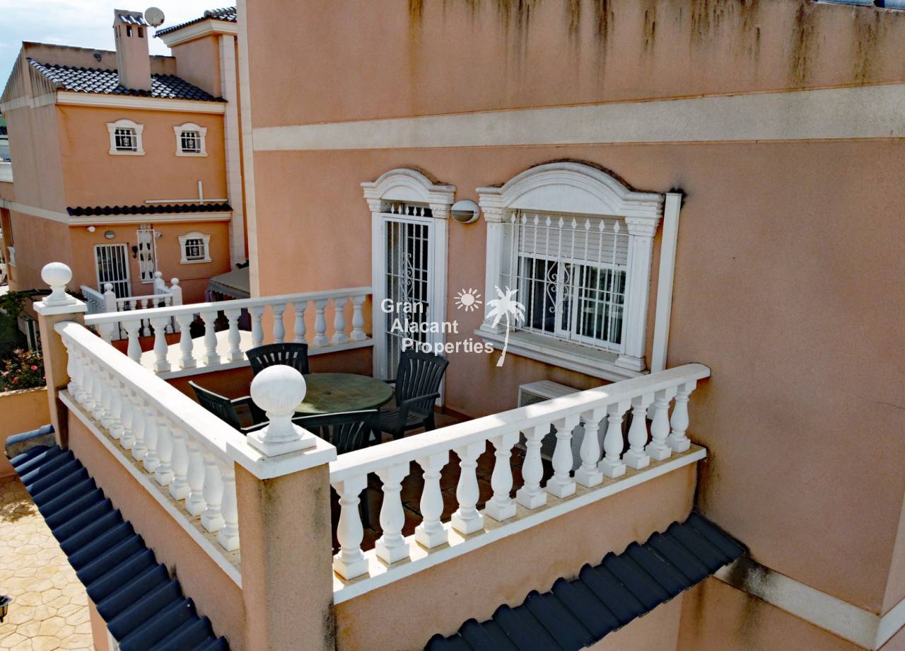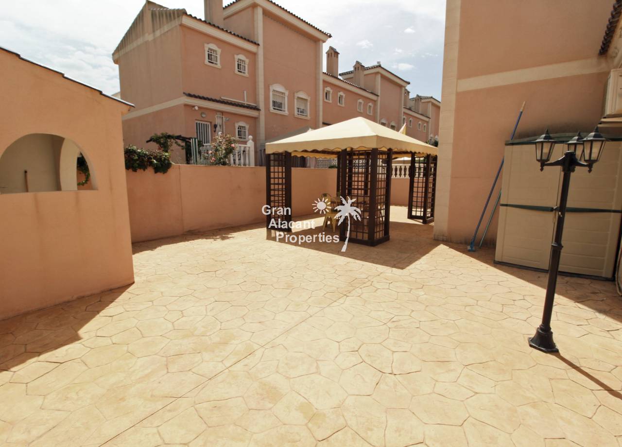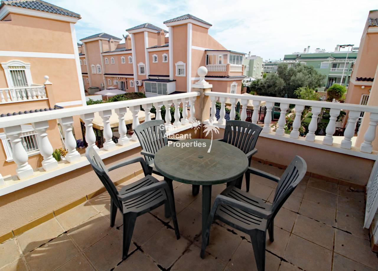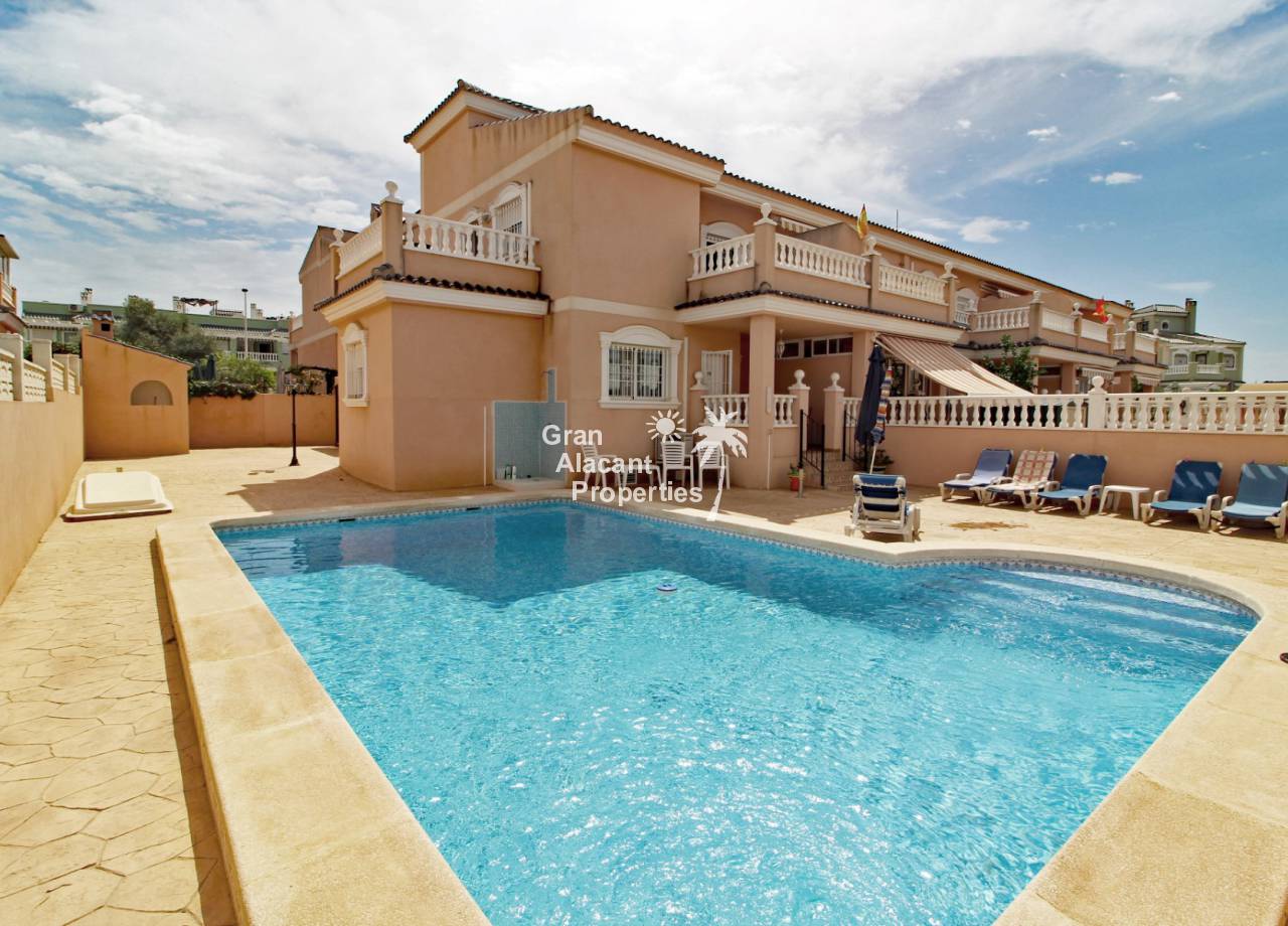 Casa adosada bien presentada ubicada en la codiciada comunidad de Puerto Marino en Gran Alacant en la soleada Costa Blanca de España. Esta casa cuenta con 3 dormitorios dobles con aire acondicionado y armarios (1 en suite y 1 dormitorio en la planta baja), 2 baños familiares, una sala de estar y comedor combinados con aire acondicionado, un gran jardín de bajo mantenimiento (parte delantera, lateral y trasera de la casa) con una piscina privada en el lado oeste de la casa, una cocina de verano/barbacoa, un porche delantero techado, un balcón en el dormitorio principal, un segundo balcón y cocina independiente con lavadero. Tiene doble acristalamiento, TV satelitte, rejas de seguridad, ventilador de techo, aire acondicionado. La casa está construida con un buen estándar y viene con muchas características agradables. También hay acceso a 2 piscinas comunitarias y una zona de juegos para niños. La casa se vende amueblada y equipada, lista para entrar a vivir y empezar a vivir el sueño.
