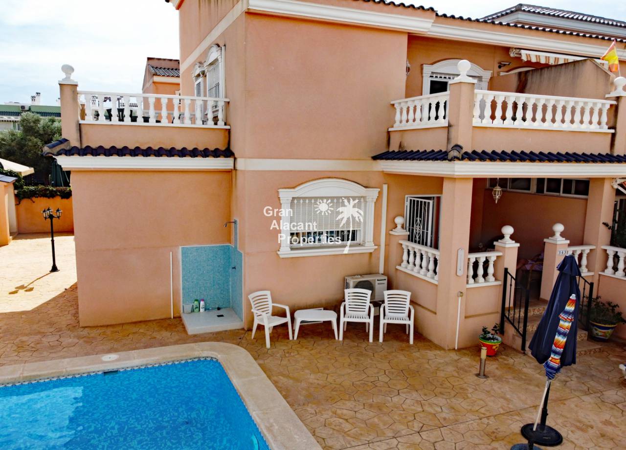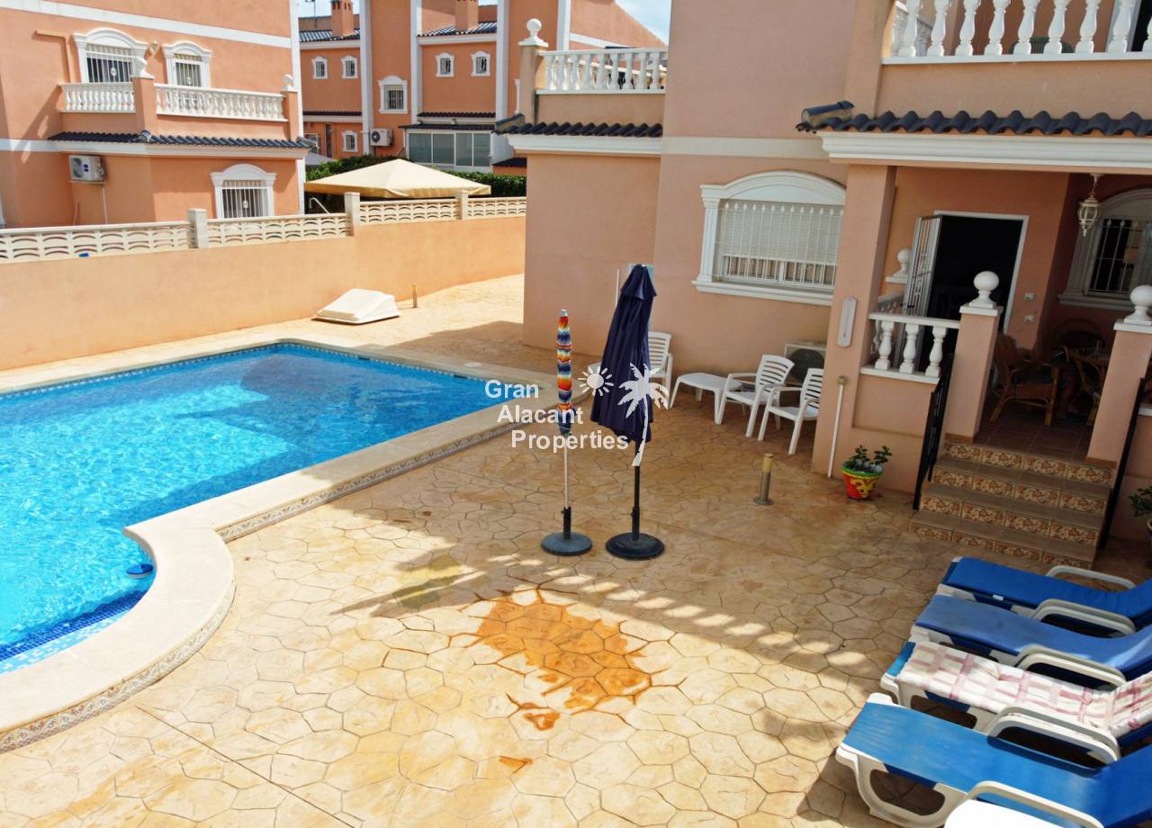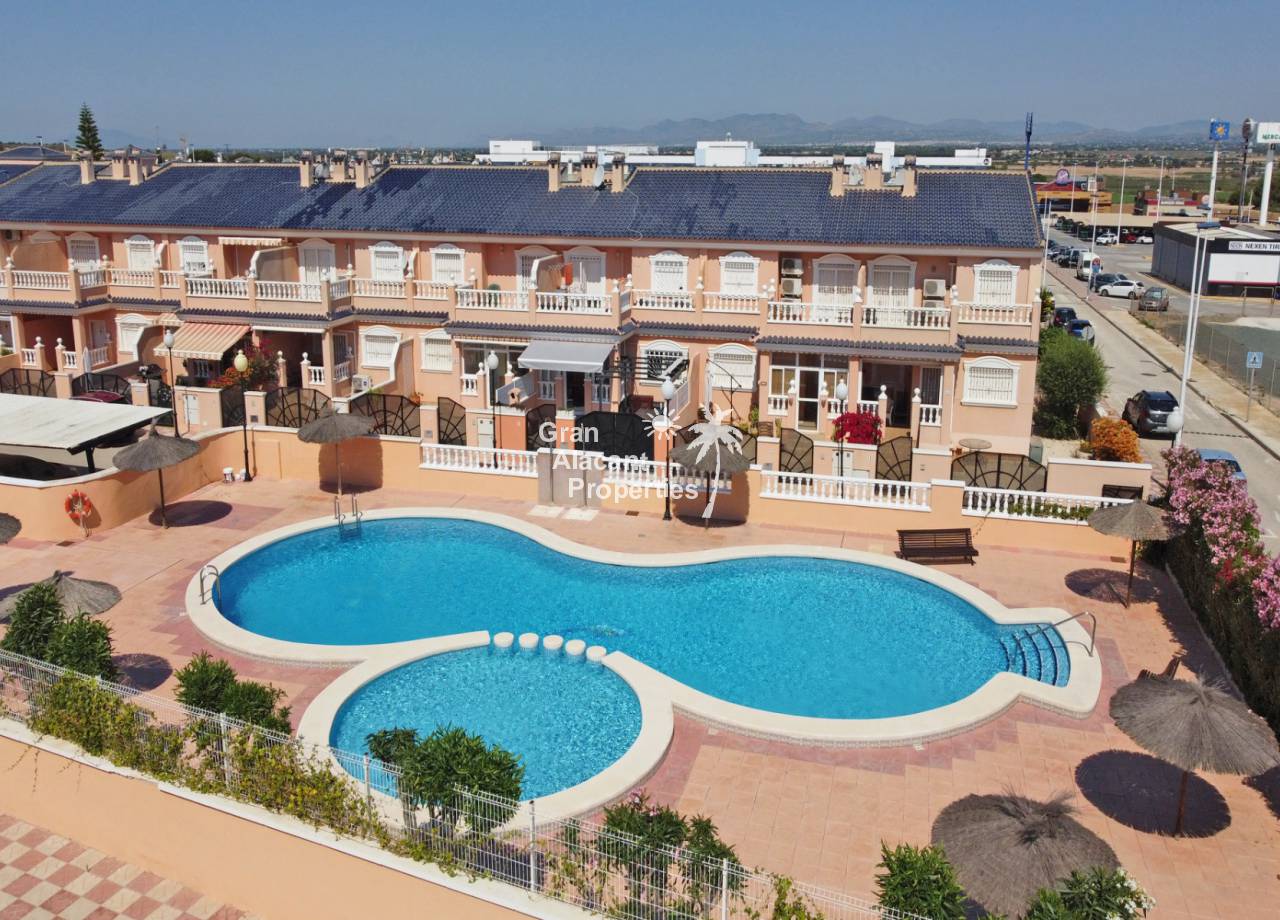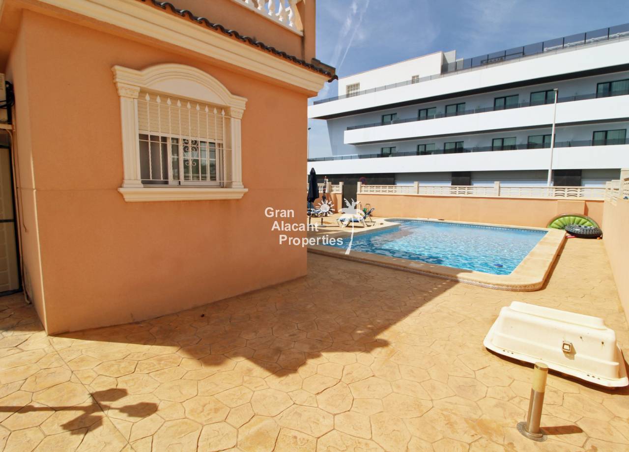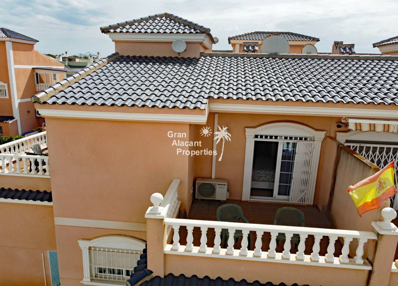 Casa adosada bien presentada ubicada en la codiciada comunidad de Puerto Marino en Gran Alacant en la soleada Costa Blanca de España. Esta casa cuenta con 3 dormitorios dobles con aire acondicionado y armarios (1 en suite y 1 dormitorio en la planta baja), 2 baños familiares, una sala de estar y comedor combinados con aire acondicionado, un gran jardín de bajo mantenimiento (parte delantera, lateral y trasera de la casa) con una piscina privada en el lado oeste de la casa, una cocina de verano/barbacoa, un porche delantero techado, un balcón en el dormitorio principal, un segundo balcón y cocina independiente con lavadero. Tiene doble acristalamiento, TV satelitte, rejas de seguridad, ventilador de techo, aire acondicionado. La casa está construida con un buen estándar y viene con muchas características agradables. También hay acceso a 2 piscinas comunitarias y una zona de juegos para niños. La casa se vende amueblada y equipada, lista para entrar a vivir y empezar a vivir el sueño.