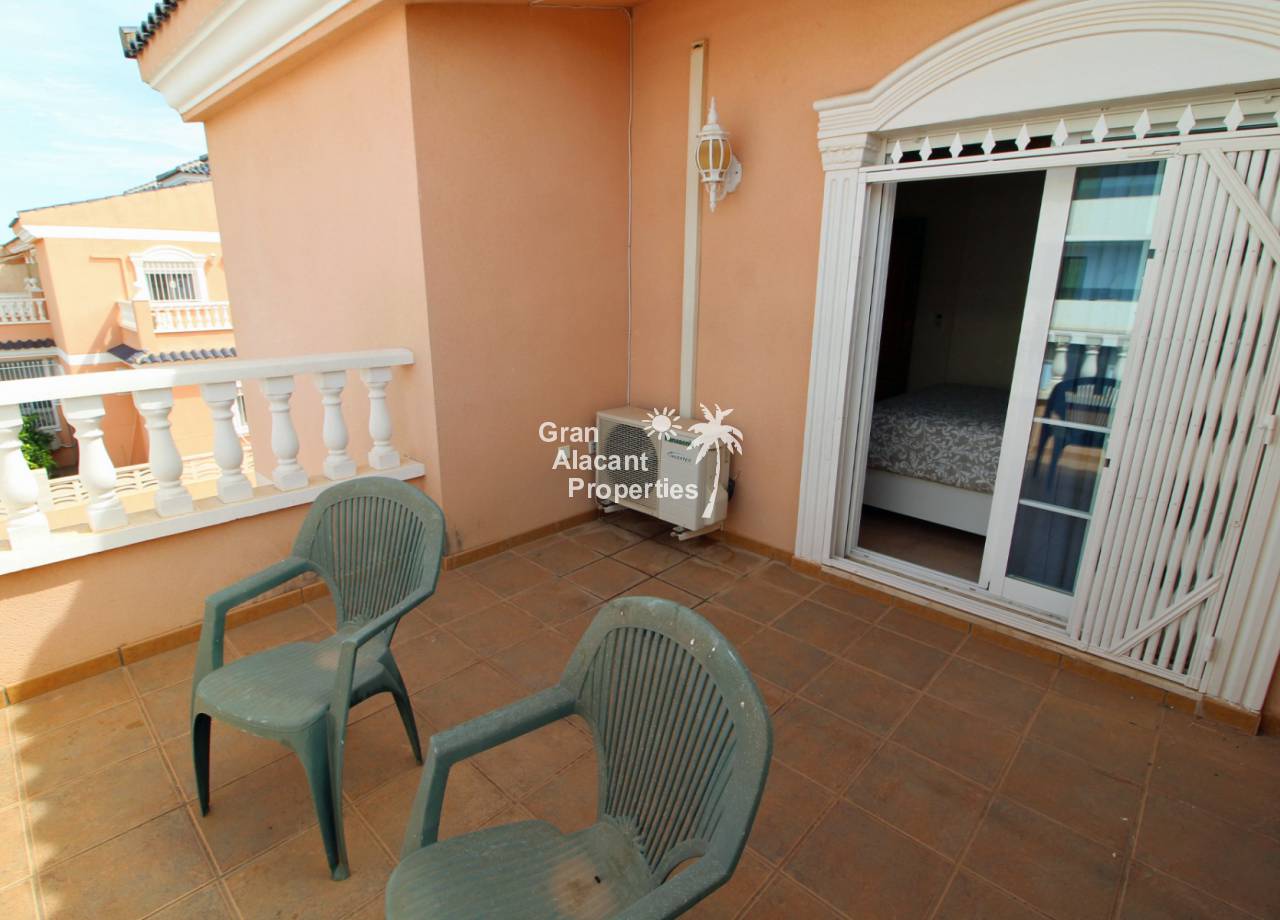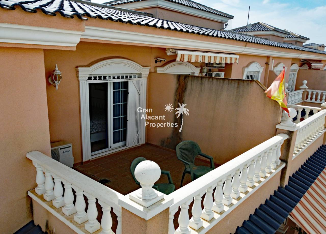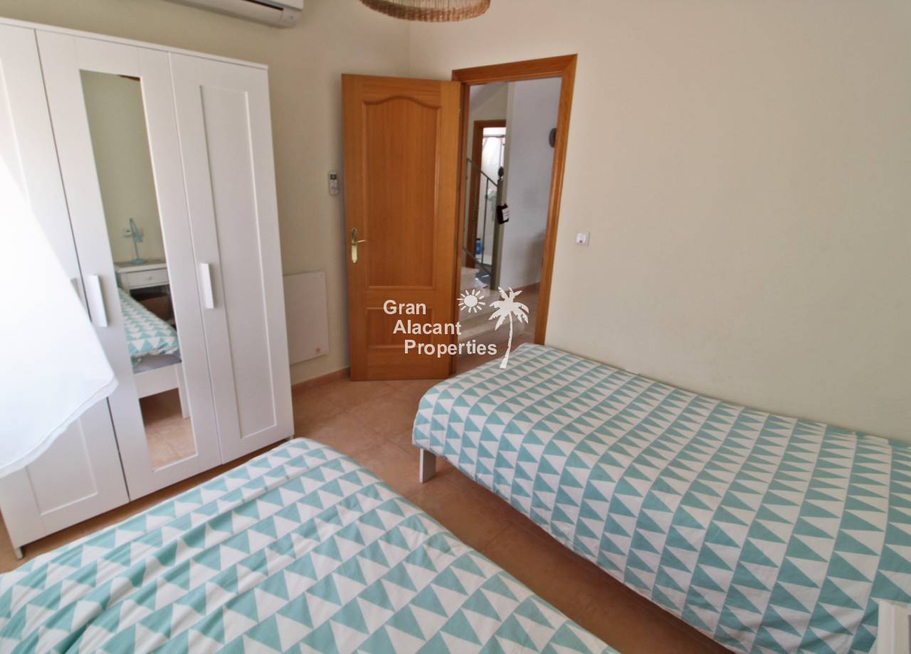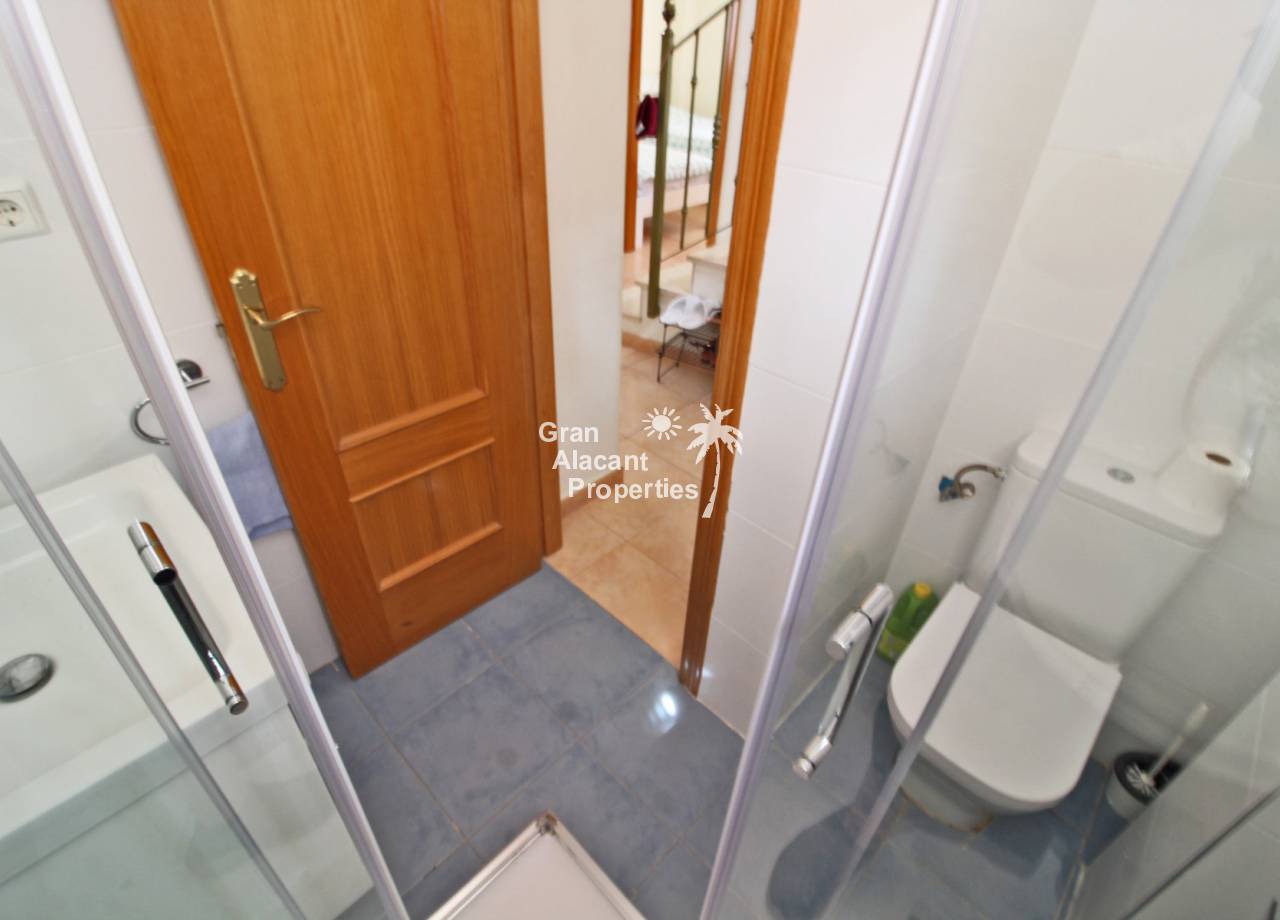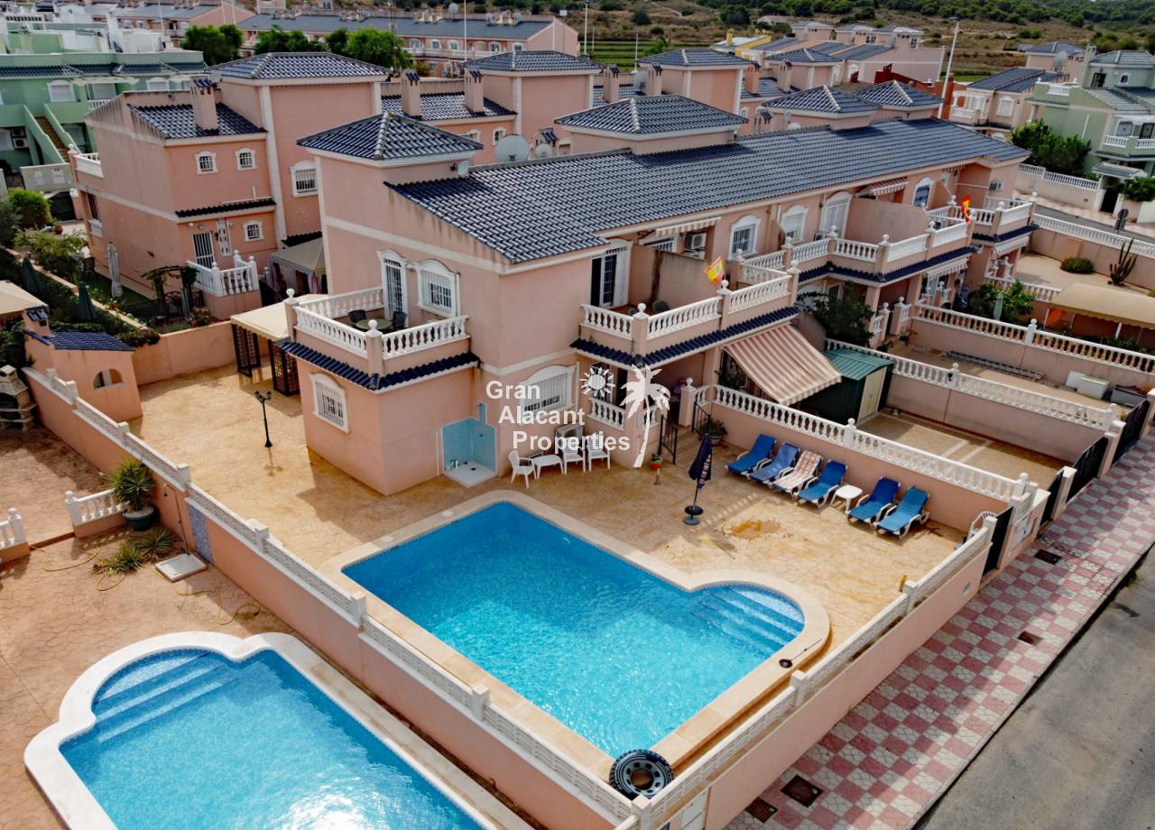 Casa adosada bien presentada ubicada en la codiciada comunidad de Puerto Marino en Gran Alacant en la soleada Costa Blanca de España. Esta casa cuenta con 3 dormitorios dobles con aire acondicionado y armarios (1 en suite y 1 dormitorio en la planta baja), 2 baños familiares, una sala de estar y comedor combinados con aire acondicionado, un gran jardín de bajo mantenimiento (parte delantera, lateral y trasera de la casa) con una piscina privada en el lado oeste de la casa, una cocina de verano/barbacoa, un porche delantero techado, un balcón en el dormitorio principal, un segundo balcón y cocina independiente con lavadero. Tiene doble acristalamiento, TV satelitte, rejas de seguridad, ventilador de techo, aire acondicionado. La casa está construida con un buen estándar y viene con muchas características agradables. También hay acceso a 2 piscinas comunitarias y una zona de juegos para niños. La casa se vende amueblada y equipada, lista para entrar a vivir y empezar a vivir el sueño.