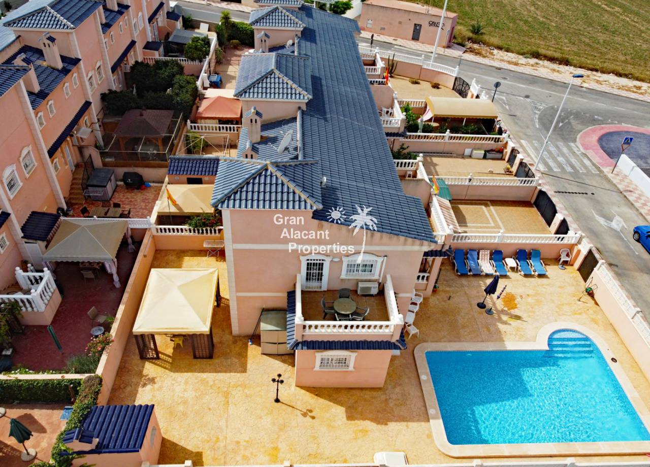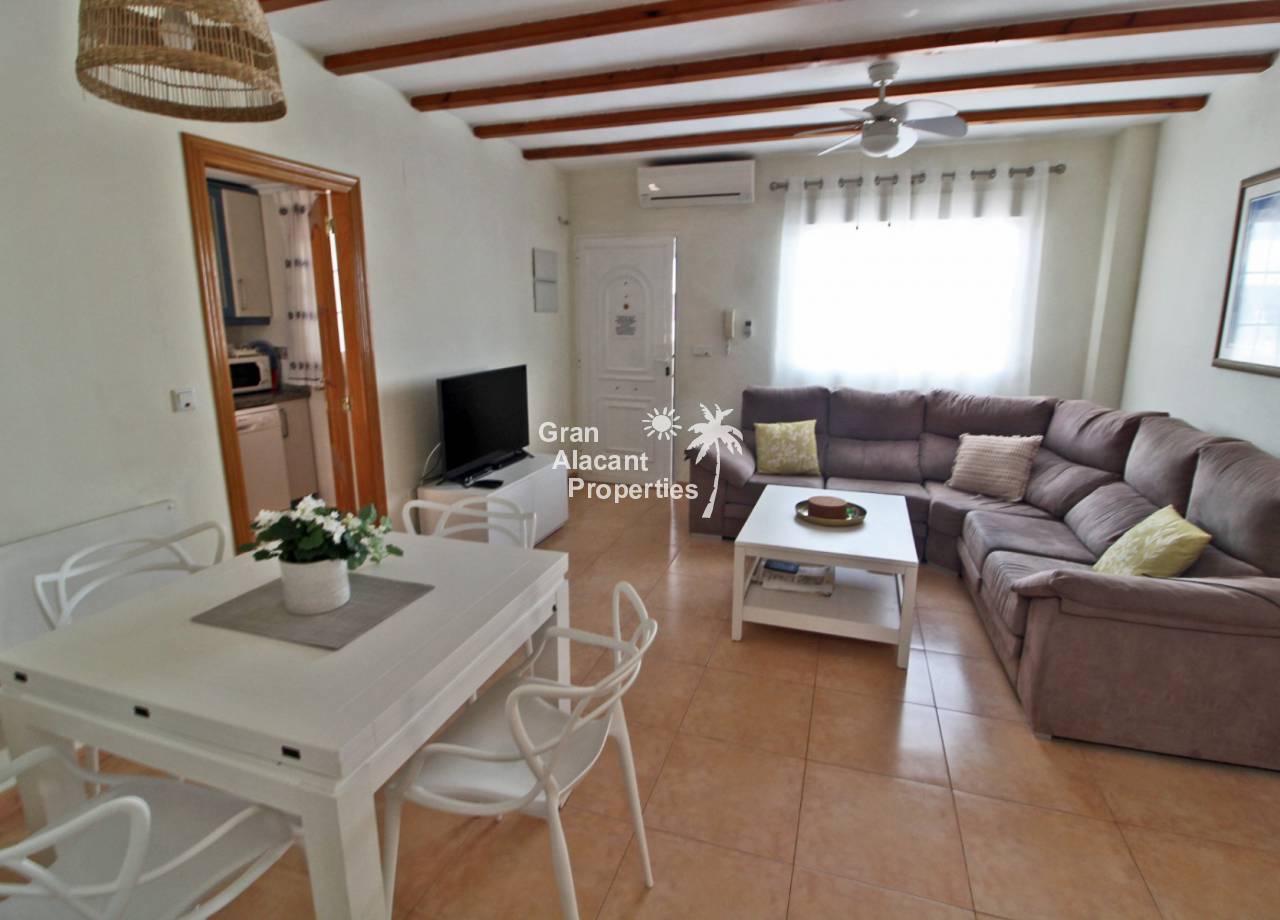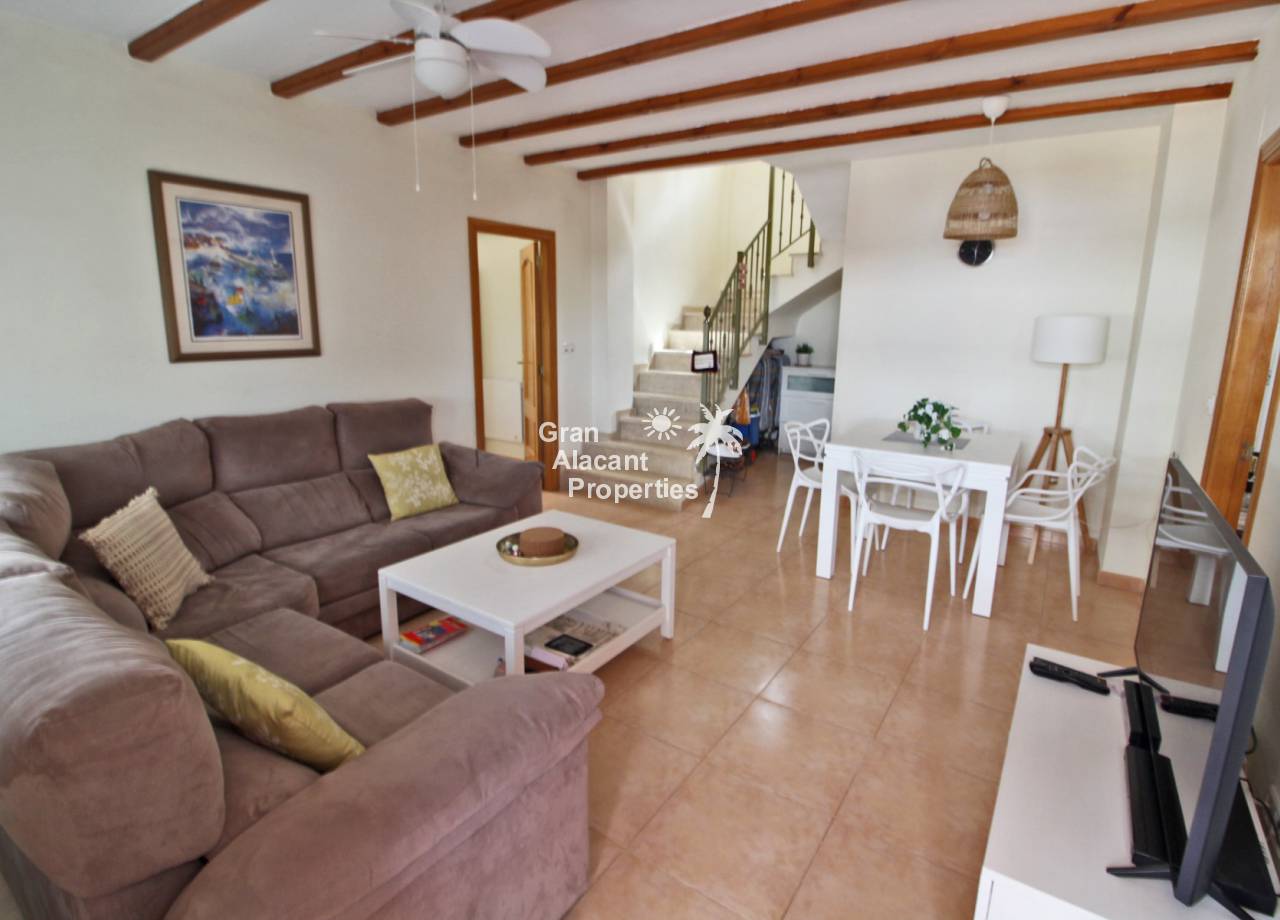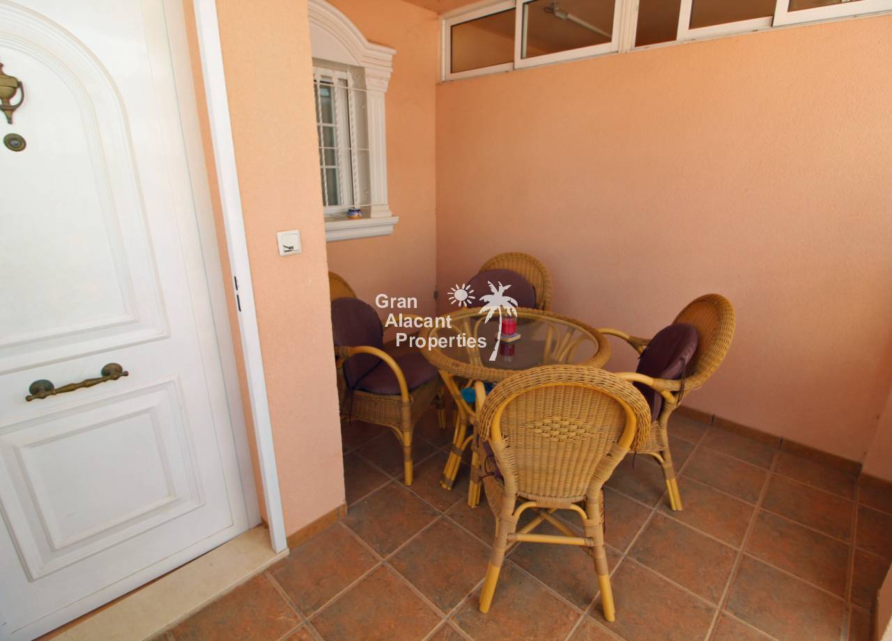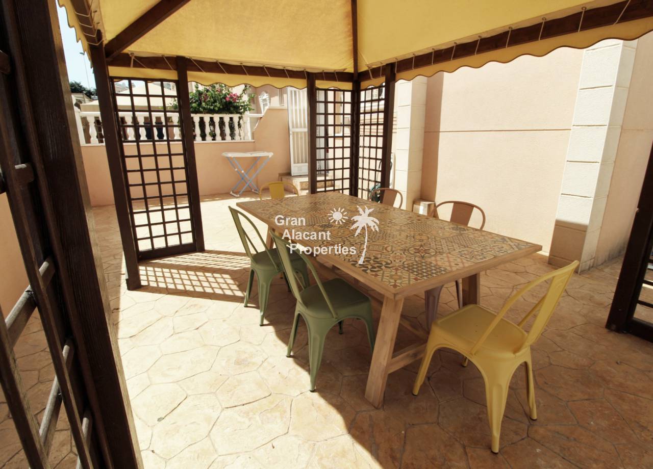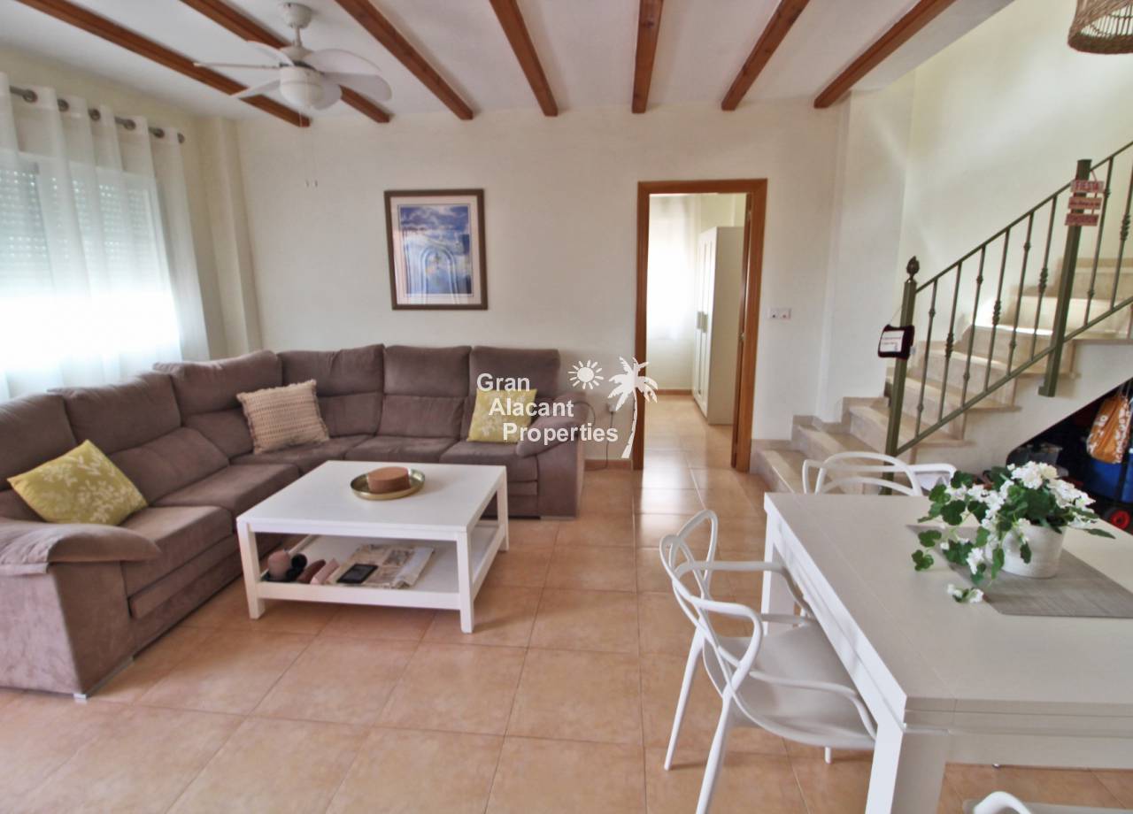 Casa adosada bien presentada ubicada en la codiciada comunidad de Puerto Marino en Gran Alacant en la soleada Costa Blanca de España. Esta casa cuenta con 3 dormitorios dobles con aire acondicionado y armarios (1 en suite y 1 dormitorio en la planta baja), 2 baños familiares, una sala de estar y comedor combinados con aire acondicionado, un gran jardín de bajo mantenimiento (parte delantera, lateral y trasera de la casa) con una piscina privada en el lado oeste de la casa, una cocina de verano/barbacoa, un porche delantero techado, un balcón en el dormitorio principal, un segundo balcón y cocina independiente con lavadero. Tiene doble acristalamiento, TV satelitte, rejas de seguridad, ventilador de techo, aire acondicionado. La casa está construida con un buen estándar y viene con muchas características agradables. También hay acceso a 2 piscinas comunitarias y una zona de juegos para niños. La casa se vende amueblada y equipada, lista para entrar a vivir y empezar a vivir el sueño.