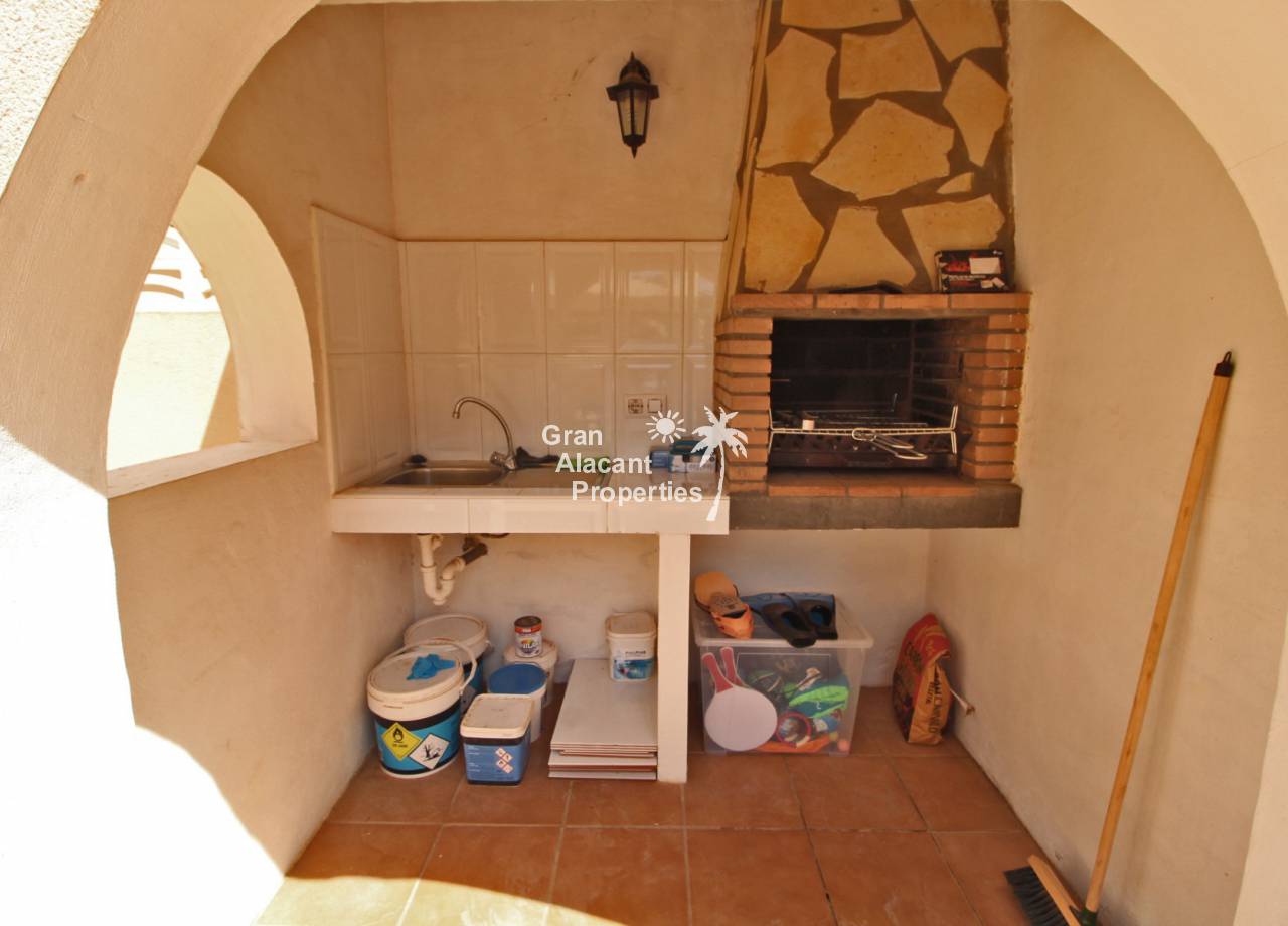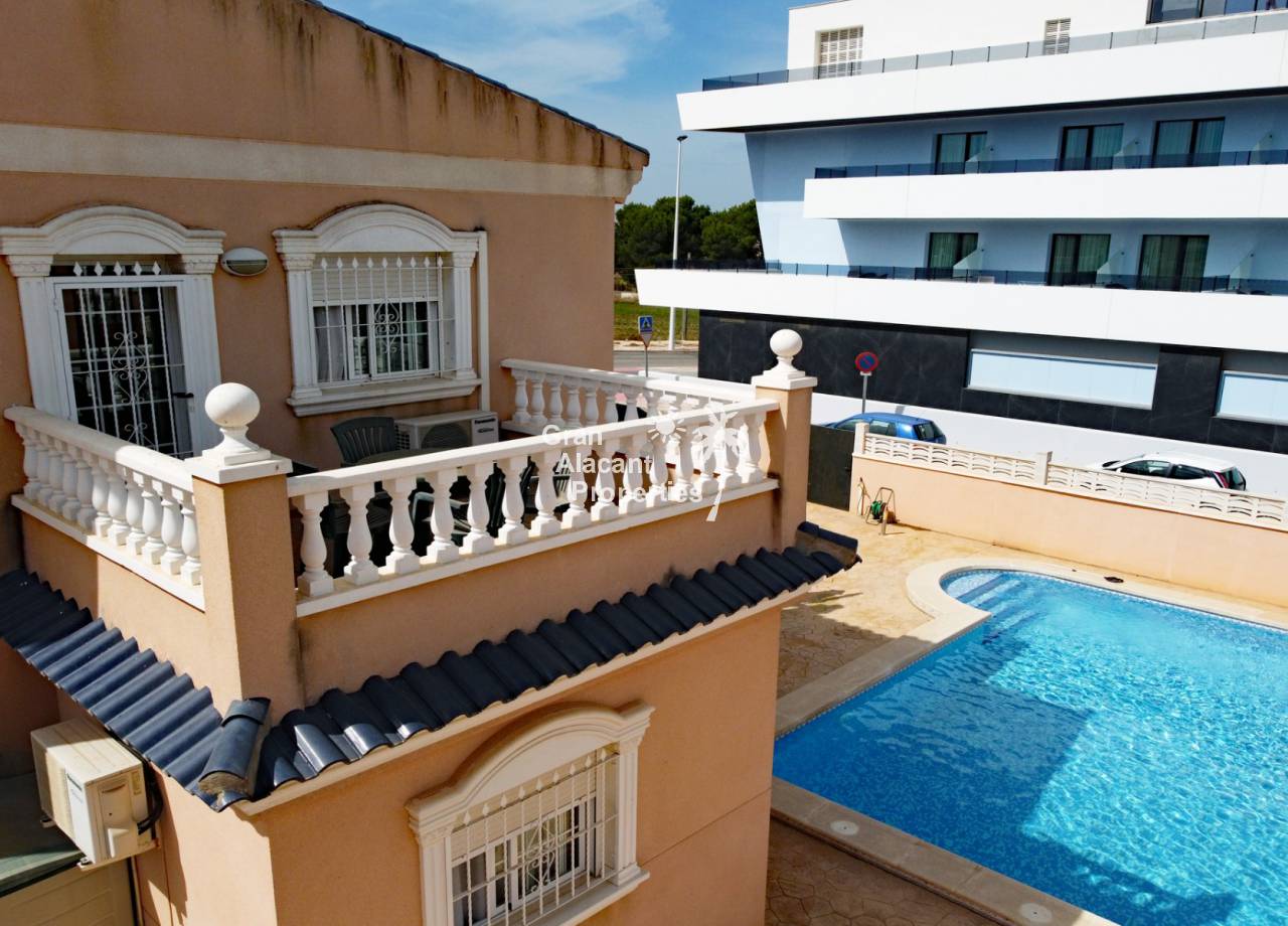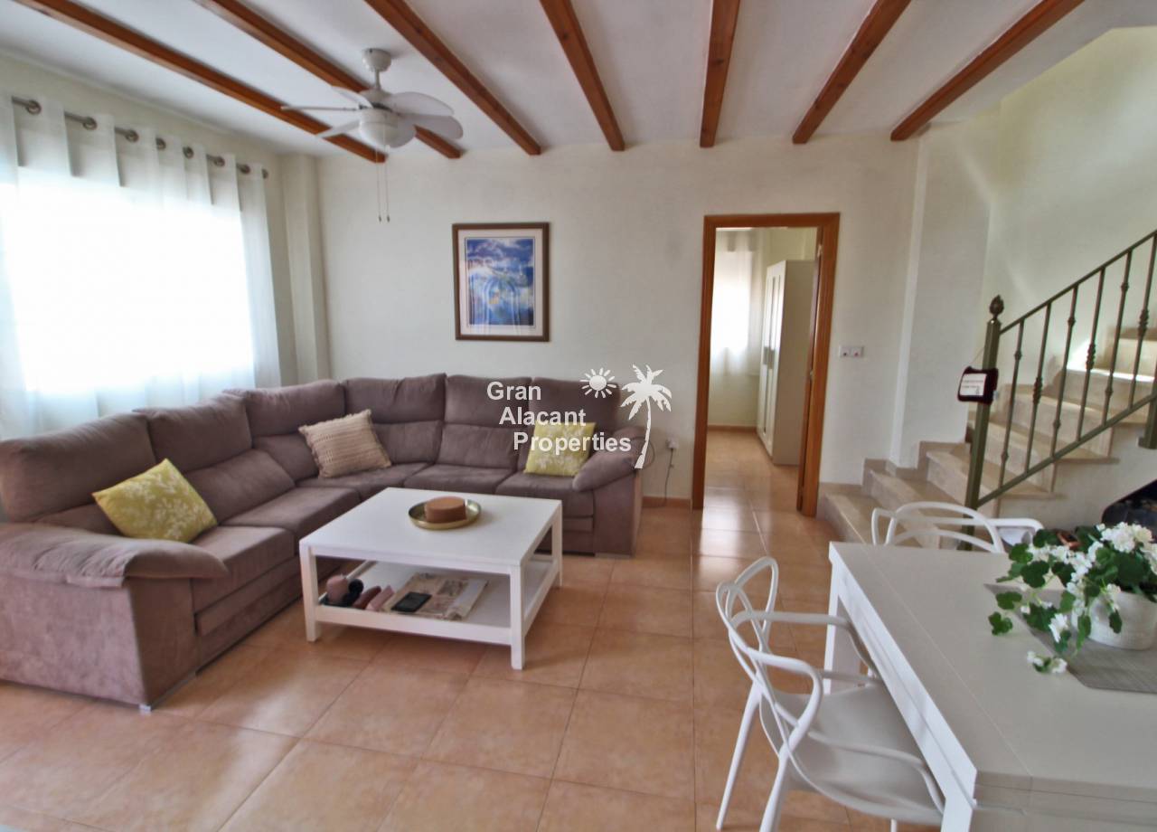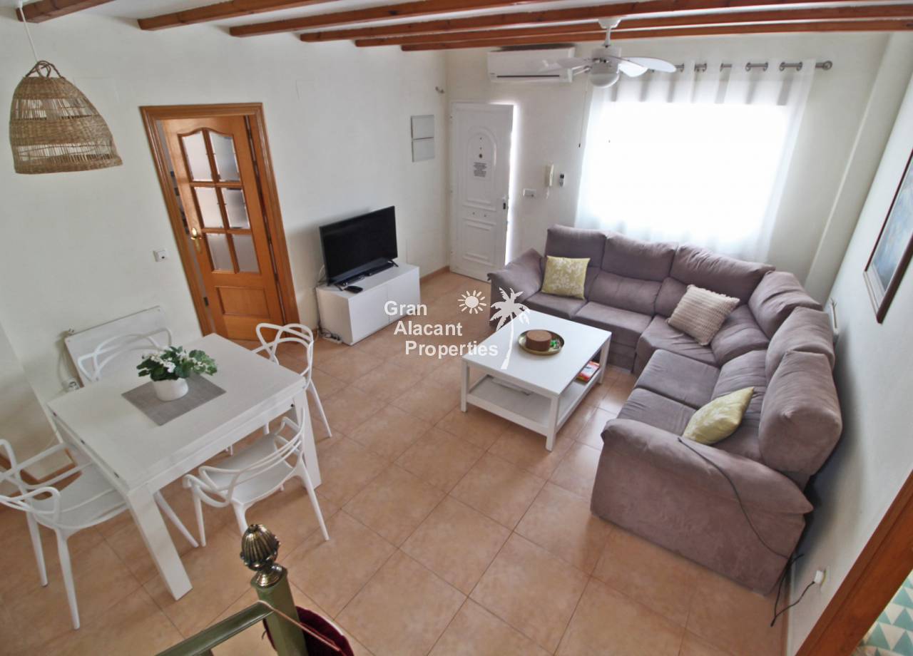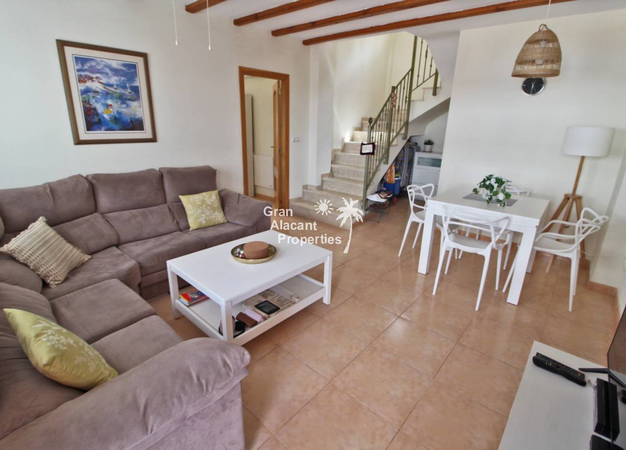 Casa adosada bien presentada ubicada en la codiciada comunidad de Puerto Marino en Gran Alacant en la soleada Costa Blanca de España. Esta casa cuenta con 3 dormitorios dobles con aire acondicionado y armarios (1 en suite y 1 dormitorio en la planta baja), 2 baños familiares, una sala de estar y comedor combinados con aire acondicionado, un gran jardín de bajo mantenimiento (parte delantera, lateral y trasera de la casa) con una piscina privada en el lado oeste de la casa, una cocina de verano/barbacoa, un porche delantero techado, un balcón en el dormitorio principal, un segundo balcón y cocina independiente con lavadero. Tiene doble acristalamiento, TV satelitte, rejas de seguridad, ventilador de techo, aire acondicionado. La casa está construida con un buen estándar y viene con muchas características agradables. También hay acceso a 2 piscinas comunitarias y una zona de juegos para niños. La casa se vende amueblada y equipada, lista para entrar a vivir y empezar a vivir el sueño.