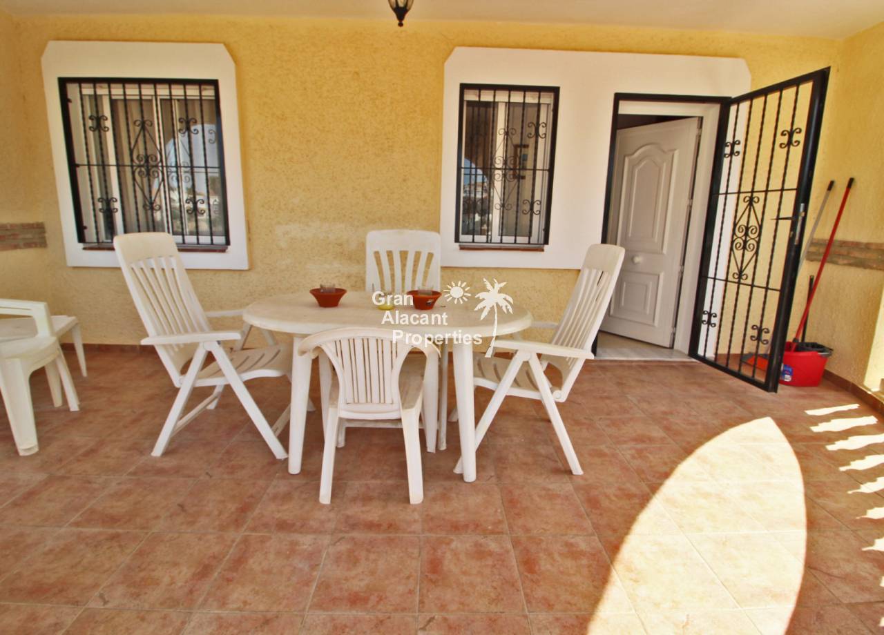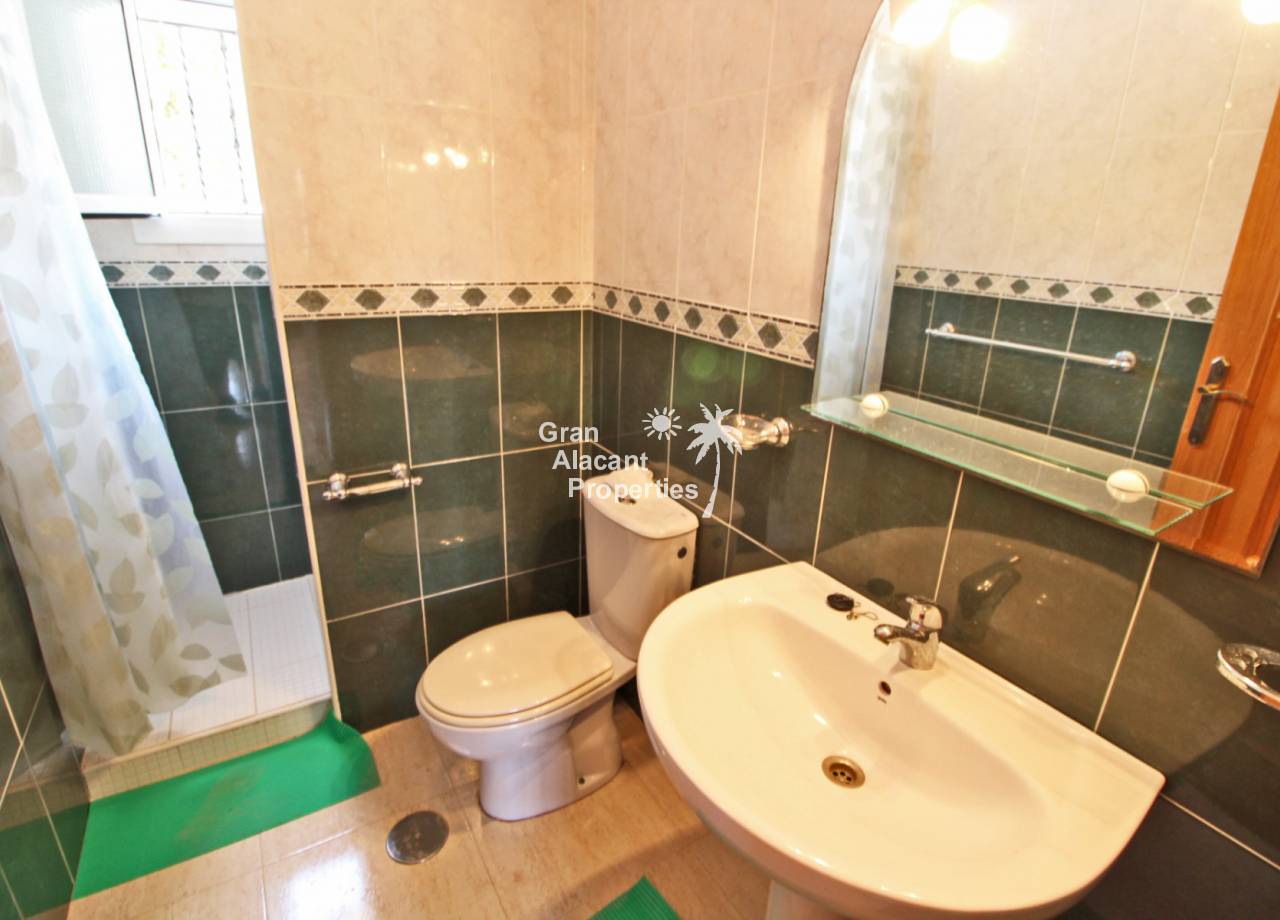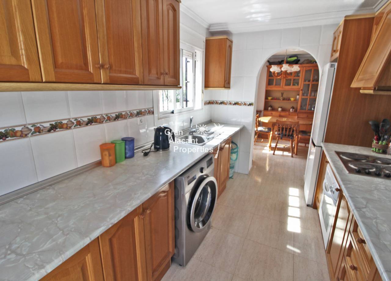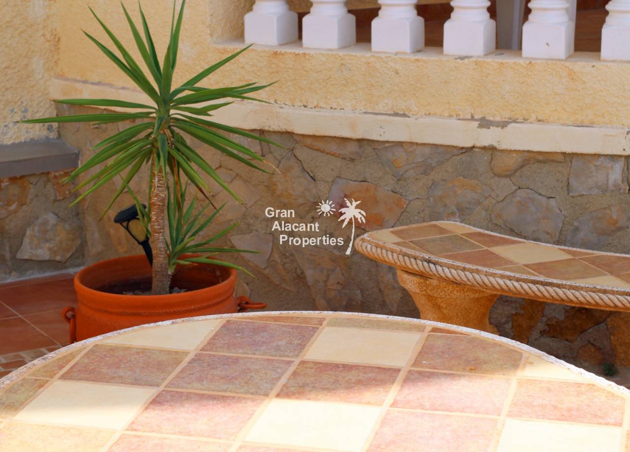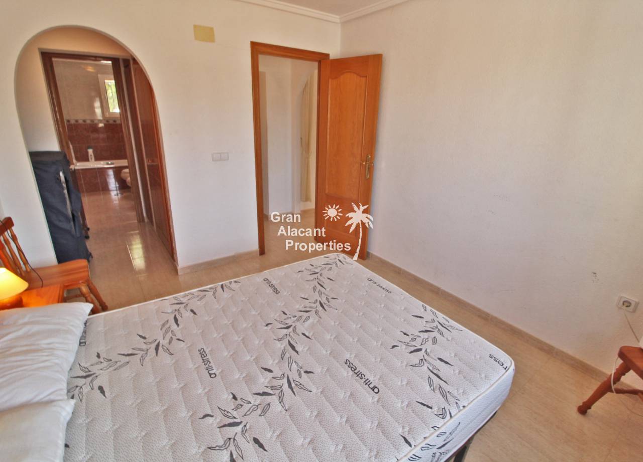 En la planta baja, esta villa de estilo "Bellavista" cuenta con una amplia sala de estar con chimenea y comedor, una práctica cocina estilo galera con acceso directo al jardín y al área de la piscina, un dormitorio en suite, un dormitorio de invitados y baño de invitados, además de un porche cubierto que ofrece un respiro del calor del día y hermosas vistas. Arriba, hay otro dormitorio en suite con armarios empotrados y acceso directo a un gran solárium con vistas panorámicas al campo e incluso un pequeño vistazo de Alicante, el castillo y el mar.