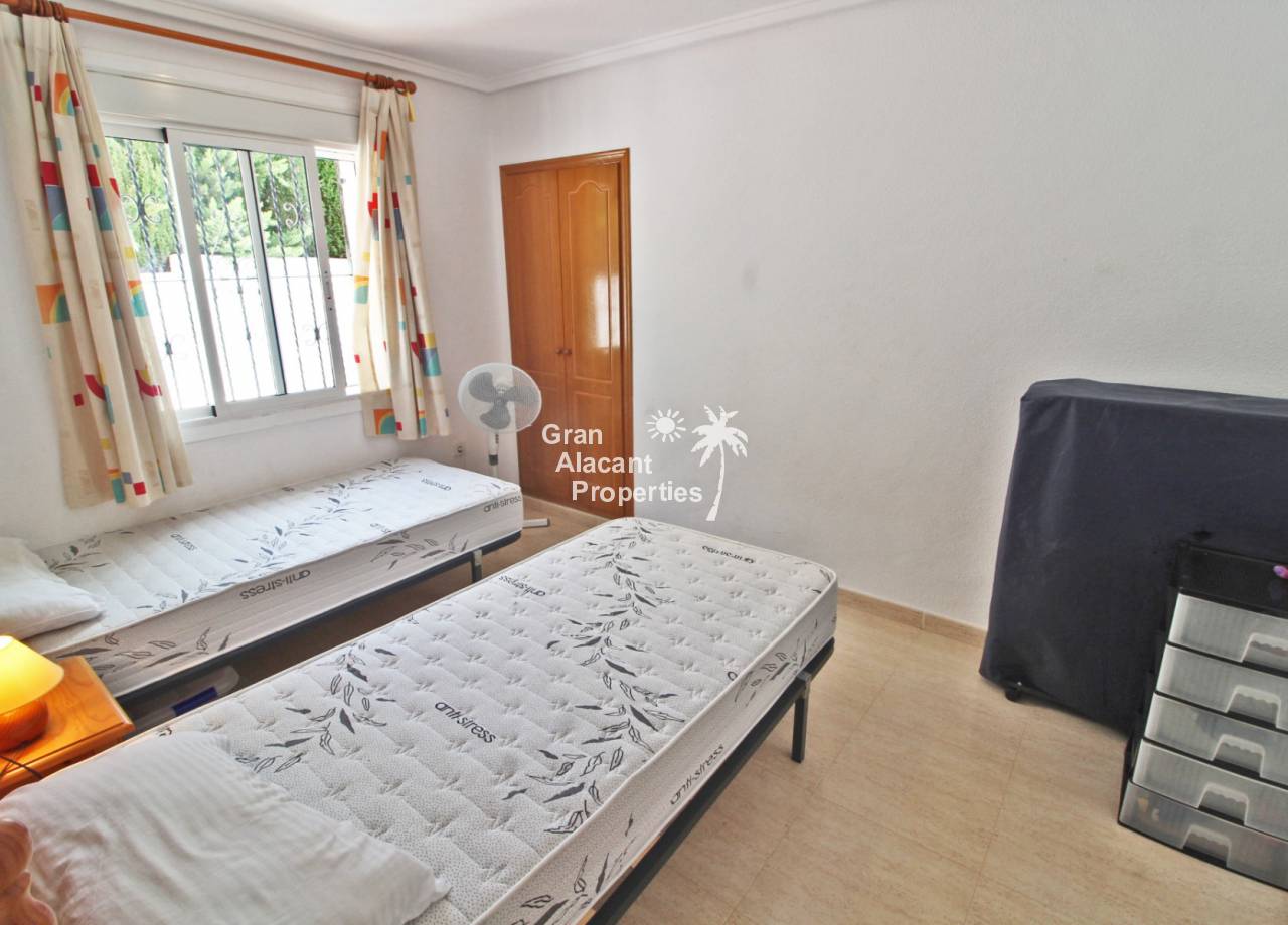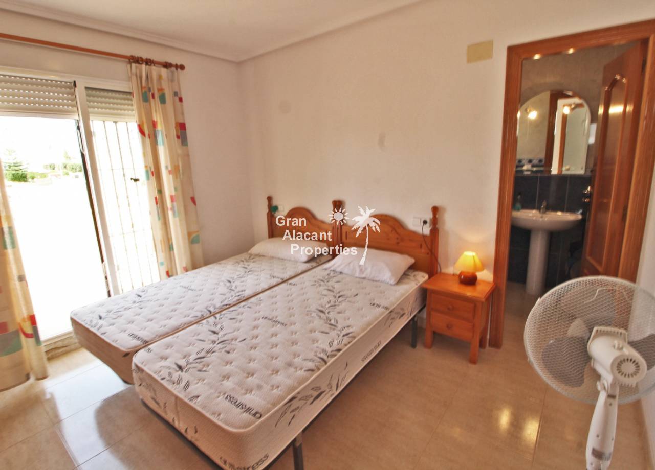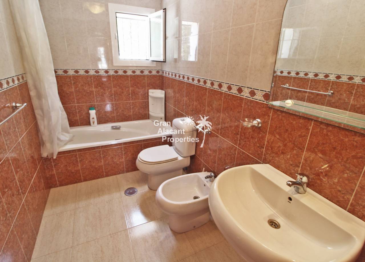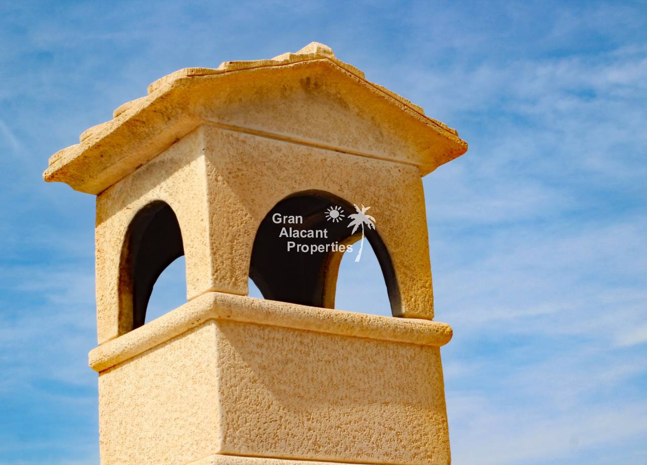 En la planta baja, esta villa de estilo "Bellavista" cuenta con una amplia sala de estar con chimenea y comedor, una práctica cocina estilo galera con acceso directo al jardín y al área de la piscina, un dormitorio en suite, un dormitorio de invitados y baño de invitados, además de un porche cubierto que ofrece un respiro del calor del día y hermosas vistas. Arriba, hay otro dormitorio en suite con armarios empotrados y acceso directo a un gran solárium con vistas panorámicas al campo e incluso un pequeño vistazo de Alicante, el castillo y el mar.