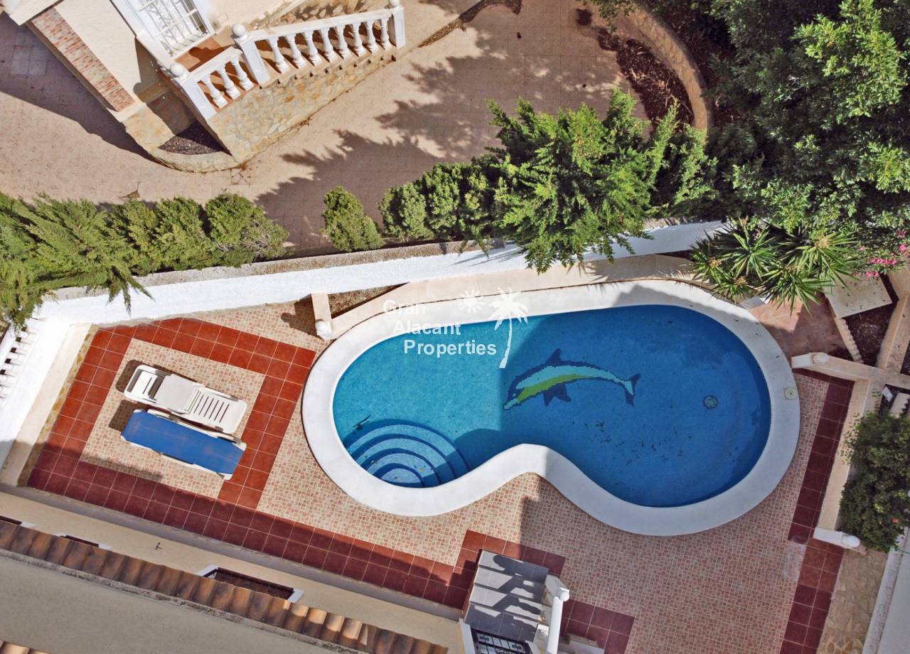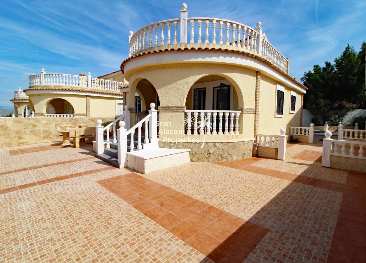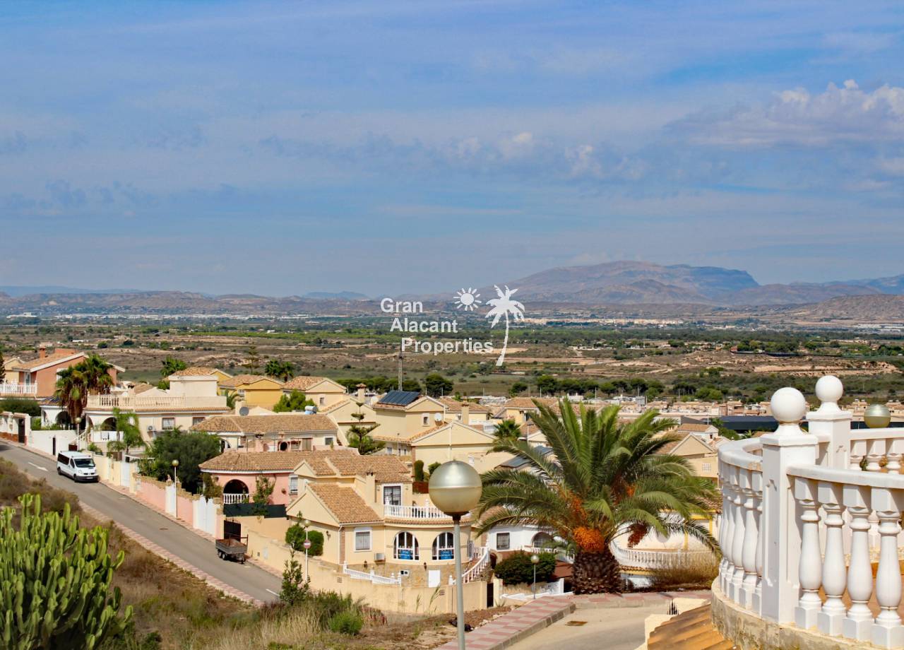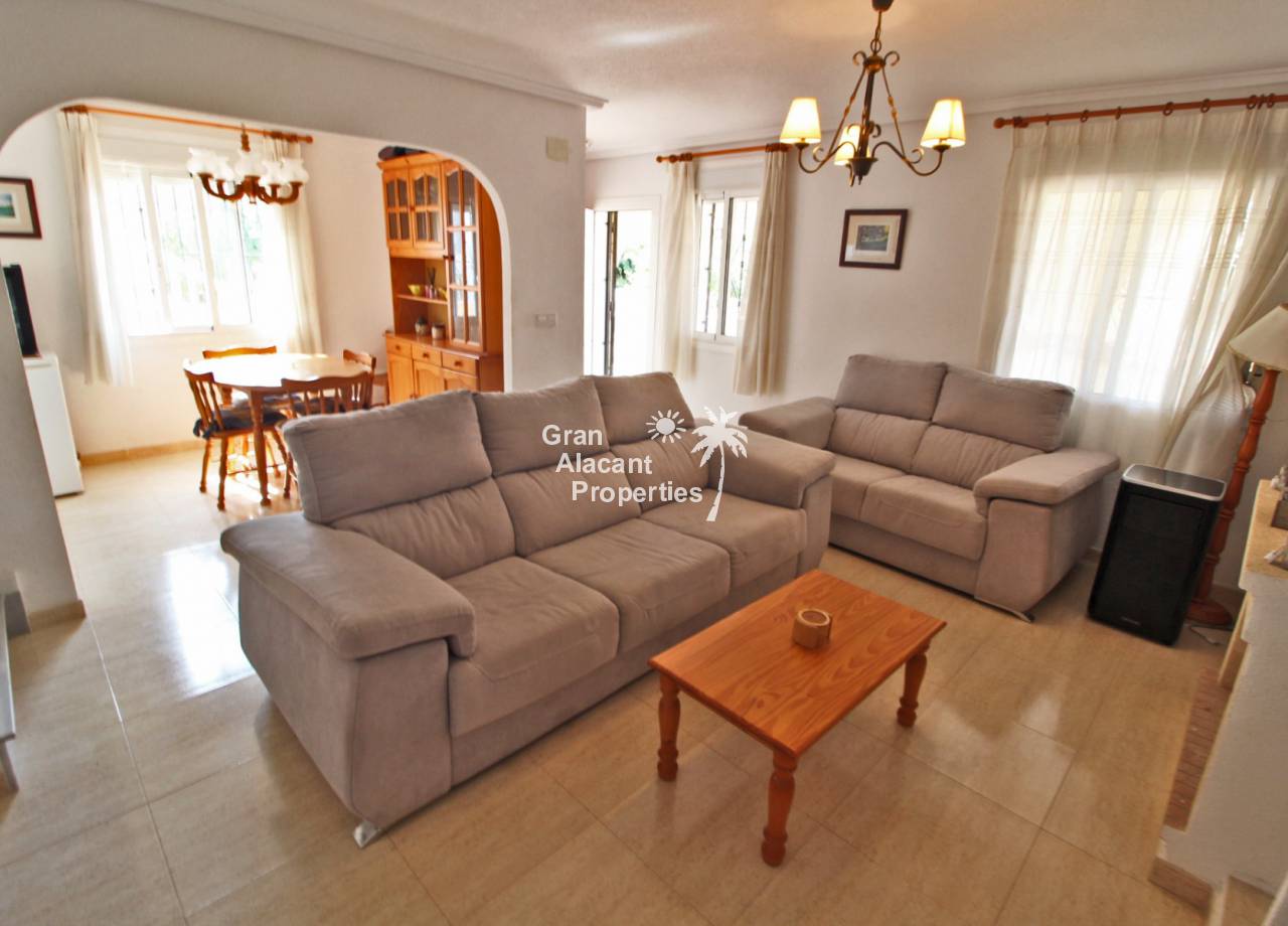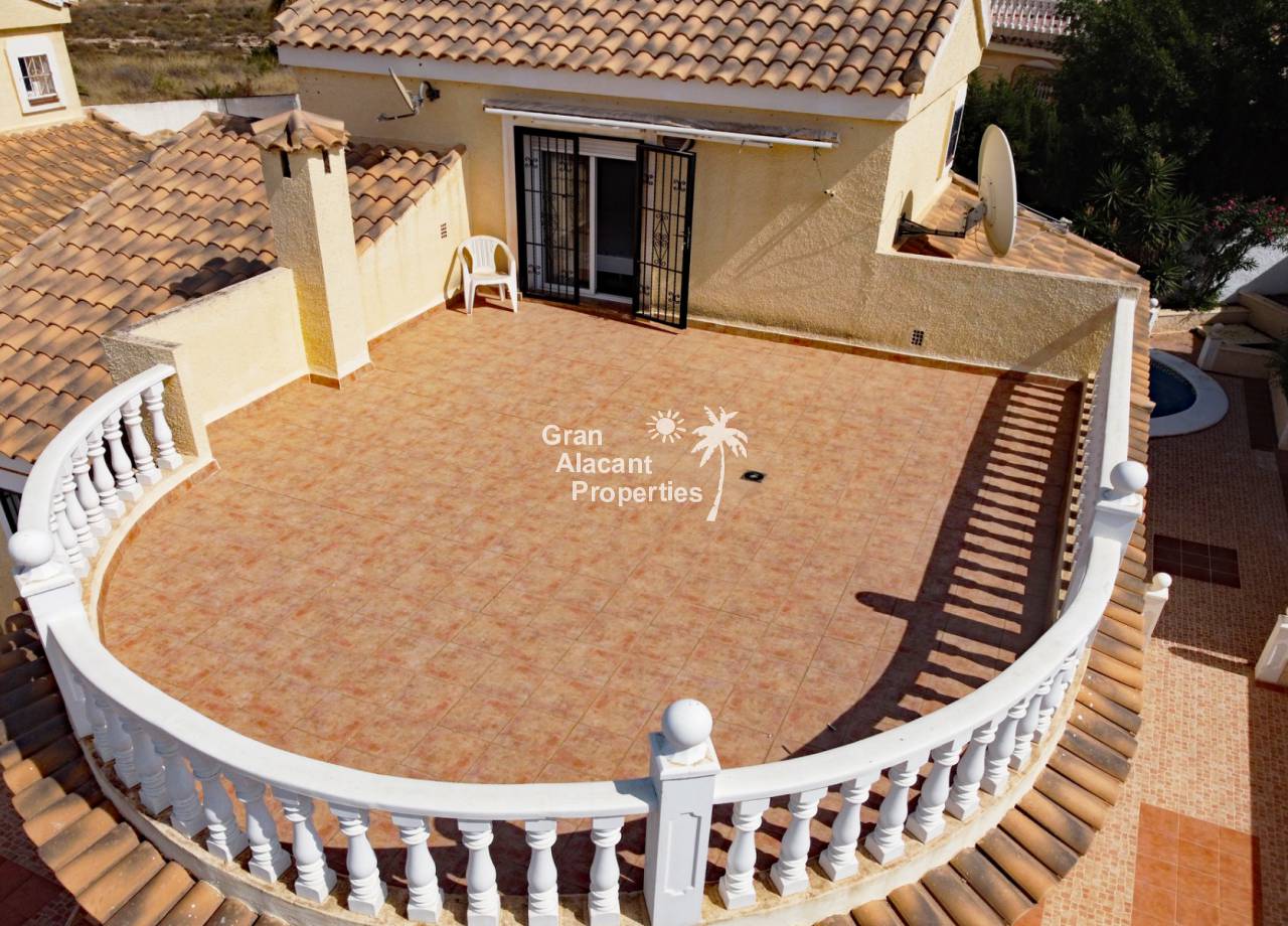 En la planta baja, esta villa de estilo "Bellavista" cuenta con una amplia sala de estar con chimenea y comedor, una práctica cocina estilo galera con acceso directo al jardín y al área de la piscina, un dormitorio en suite, un dormitorio de invitados y baño de invitados, además de un porche cubierto que ofrece un respiro del calor del día y hermosas vistas. Arriba, hay otro dormitorio en suite con armarios empotrados y acceso directo a un gran solárium con vistas panorámicas al campo e incluso un pequeño vistazo de Alicante, el castillo y el mar.