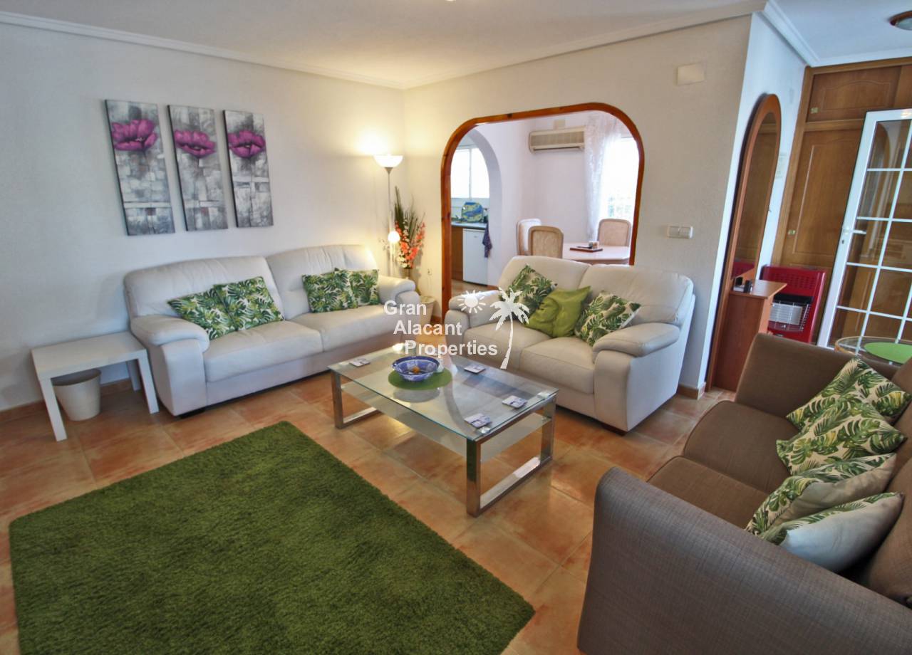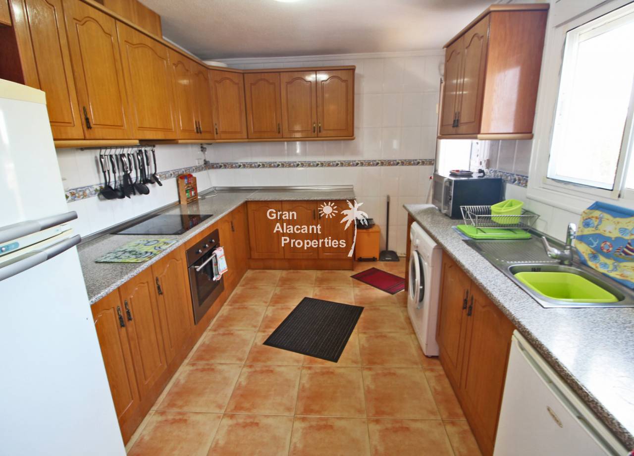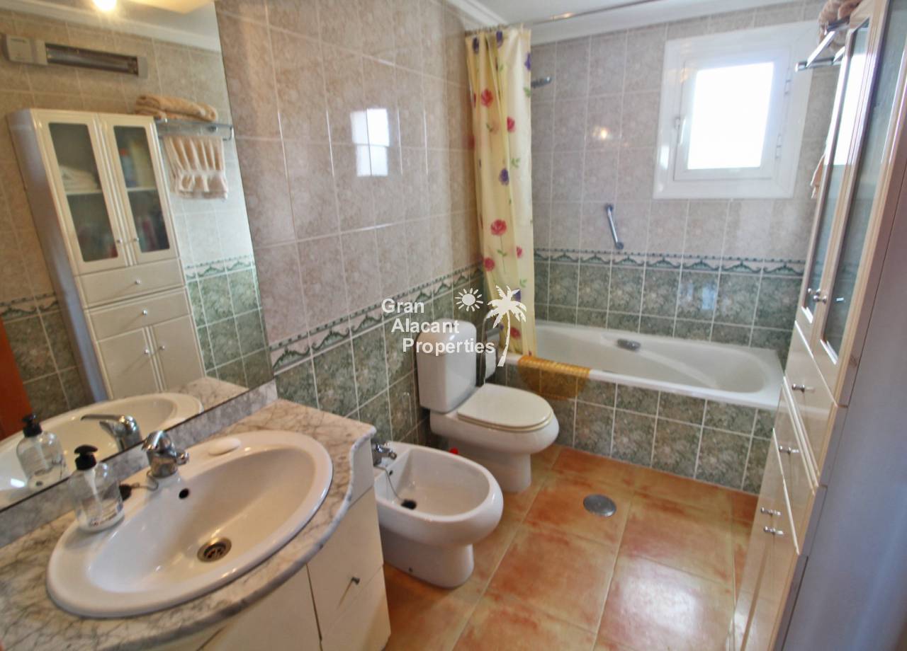 En el exterior, el jardín de bajo mantenimiento (375 m²) ofrece mucho espacio para el entretenimiento o para disfrutar del sol español. Arriba, hay un solárium con vistas panorámicas al campo, las montañas, Alicante, el castillo y el mar. La piscina privada es perfecta para refrescarse en los calurosos días de verano.