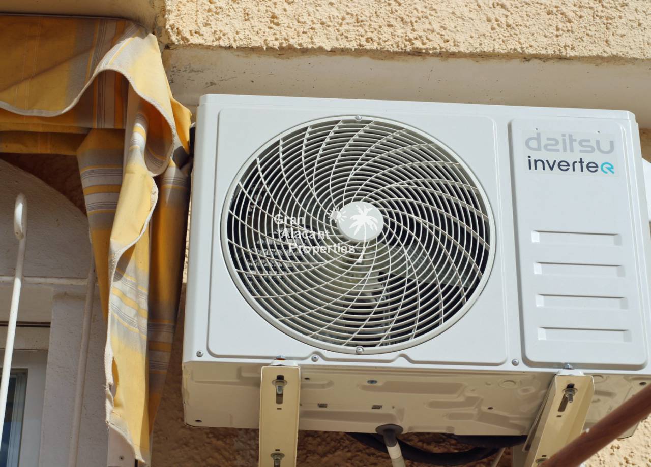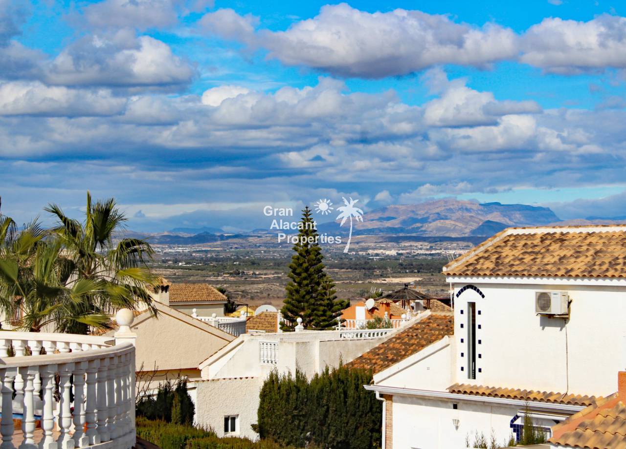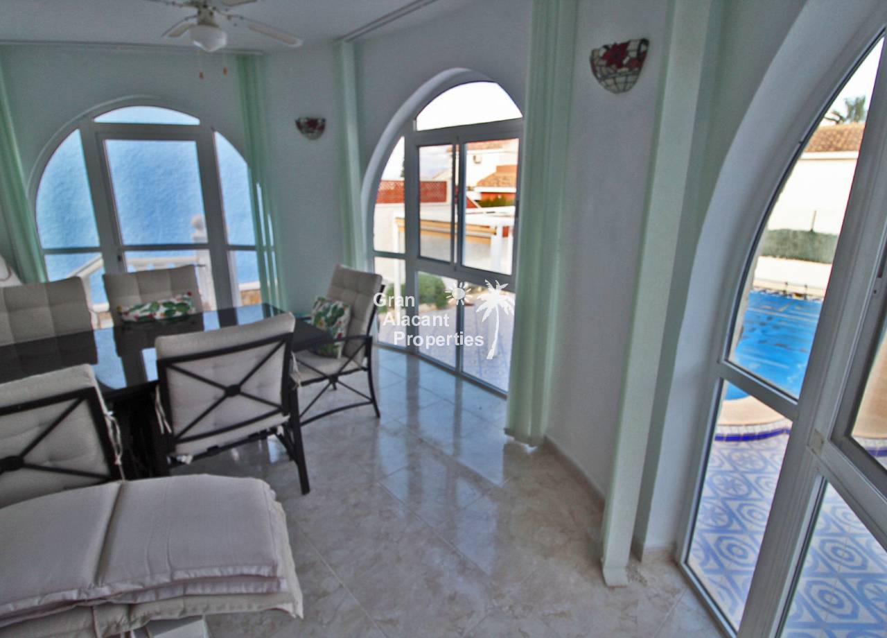 En el exterior, el jardín de bajo mantenimiento (375 m²) ofrece mucho espacio para el entretenimiento o para disfrutar del sol español. Arriba, hay un solárium con vistas panorámicas al campo, las montañas, Alicante, el castillo y el mar. La piscina privada es perfecta para refrescarse en los calurosos días de verano.