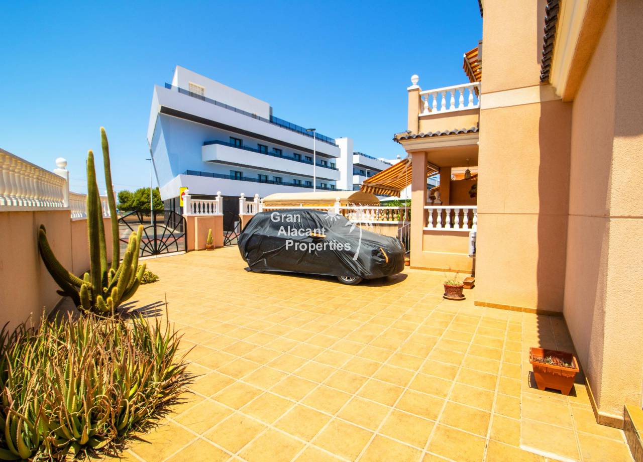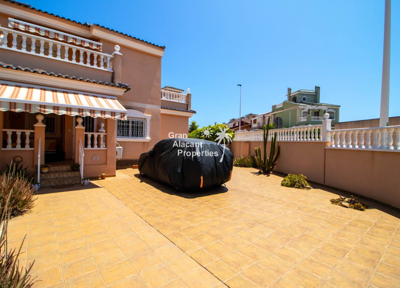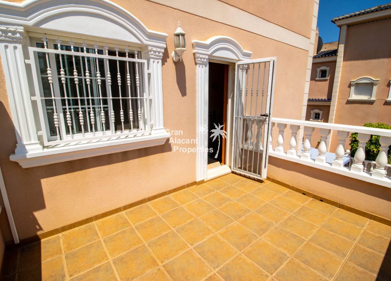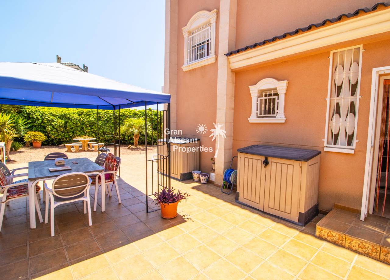 Casa semi adosada bien presentada con orientación suroeste ubicada en la codiciada comunidad de Puerto Marino en Gran Alacant en la soleada Costa Blanca de España. Esta casa cuenta con 3 habitaciones dobles (1 habitación en la planta baja que actualmente se usa como comedor), 1 baño en suite y 2 baños familiares, una sala de estar y comedor combinados, un gran jardín de bajo mantenimiento (frente, costado y parte trasera de la casa) con espacio para una alberca privada en el costado de la casa en caso de que el nuevo propietario decida instalar una, un asador, un porche delantero techado, un balcón en el dormitorio principal, un segundo balcón y una cocina independiente con lavadero. Hay doble acristalamiento, toldos, aire acondicionado frío y calor (x 3 máquinas), rejas de seguridad, ventiladores de techo y mosquiteros. La casa está construida con un buen estándar y viene con muchas características agradables. También hay acceso a 2 piscinas comunitarias y una zona de juegos para niños. La casa se vende amueblada y equipada, lista para entrar a vivir y empezar a vivir el sueño.