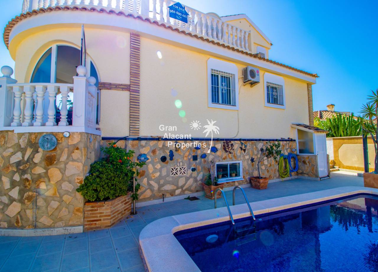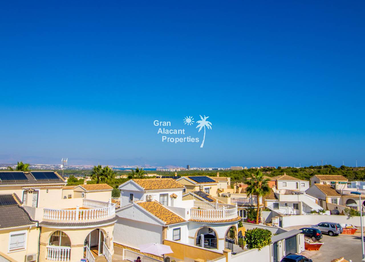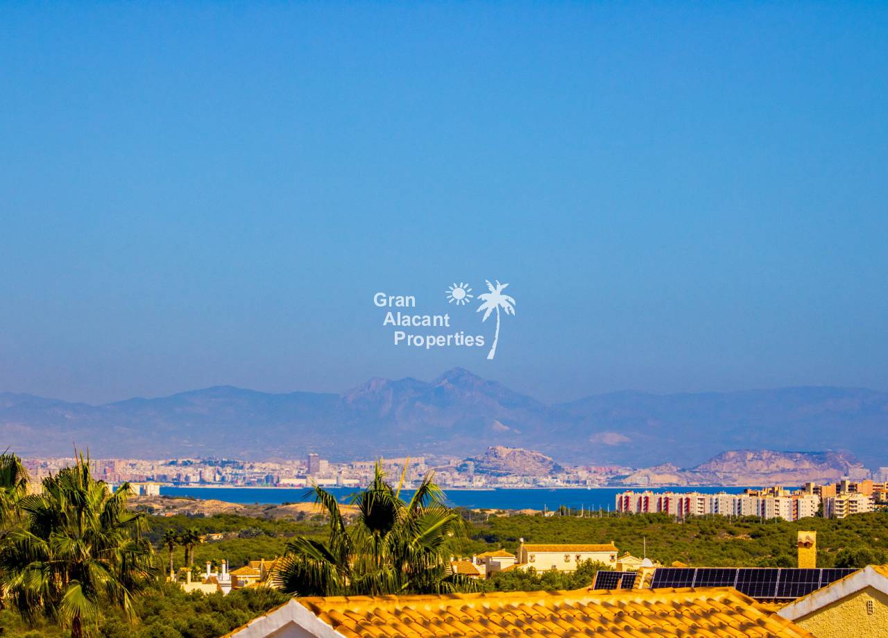 Gran Alacant Properties se complacen en ofrecer esta villa independiente de estilo "Bellavista" ubicada en una parcela de esquina con piscina privada, sótano y garaje en Gran Alacant con impresionantes vistas de Alicante, el campo y el Mediterráneo.