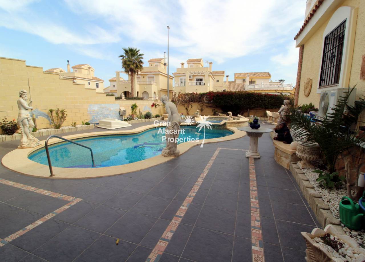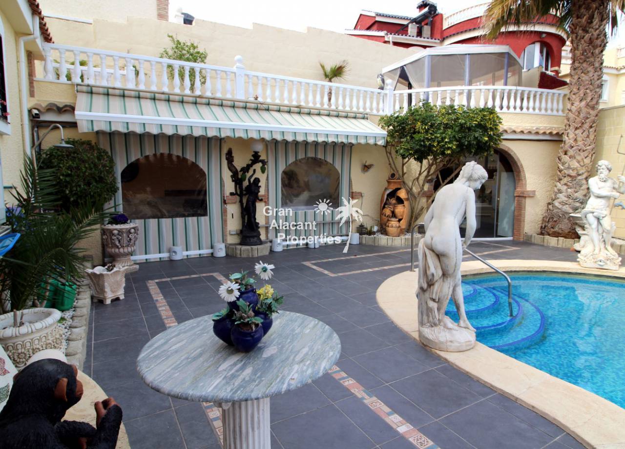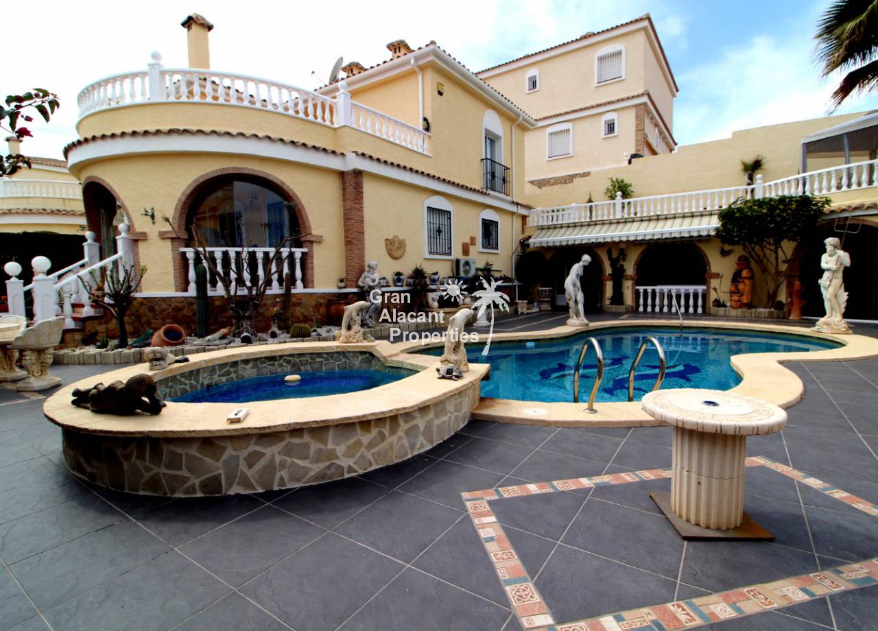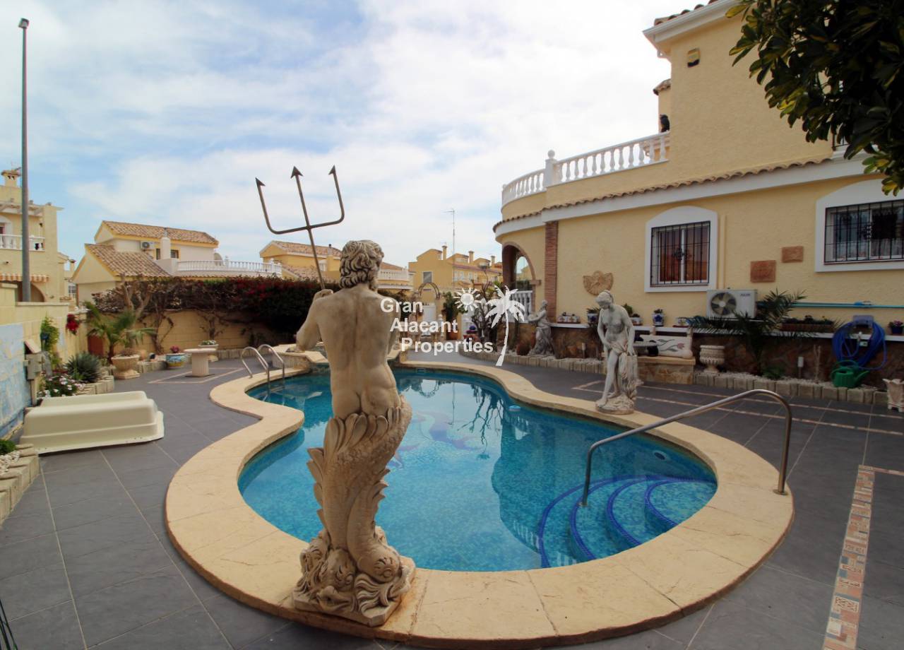 Outside, the low maintenance mature garden (410 m²) offers off road parking, plenty of space for entertaining or enjoying the Spanish sunshine. Best of all is the designer private swimming pool with seperate jacuzzi and waterfall perfect for cooling off on hot summer days. There is a large curved front covered bar area complete with satellite TV, beer pumps, pool table and dart board, perfect for hosting parties or just enjoying yourself. Upstairs, there is another large solarium with views over the garden and pool. There is also storage and a WC so that you do not have to go into the house to use the facilities when in the garden or pool.