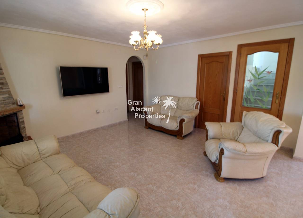 On the ground floor, you enter the house through a covered porch with glass curtains into a large living and dining room with feature fireplace, a convenient recently modernised galley style kitchen with pantry / utility room, an en-suite master bedroom with built-in wardrobes and modernised bathroom, an additional double bedroom and WC. Upstairs, there is another en-suite bedroom with built-in wardrobes, a family bathroom, 2 double bedrooms (one with a Juliet balcony overlooking the swimming pool) and direct access to a large solarium.