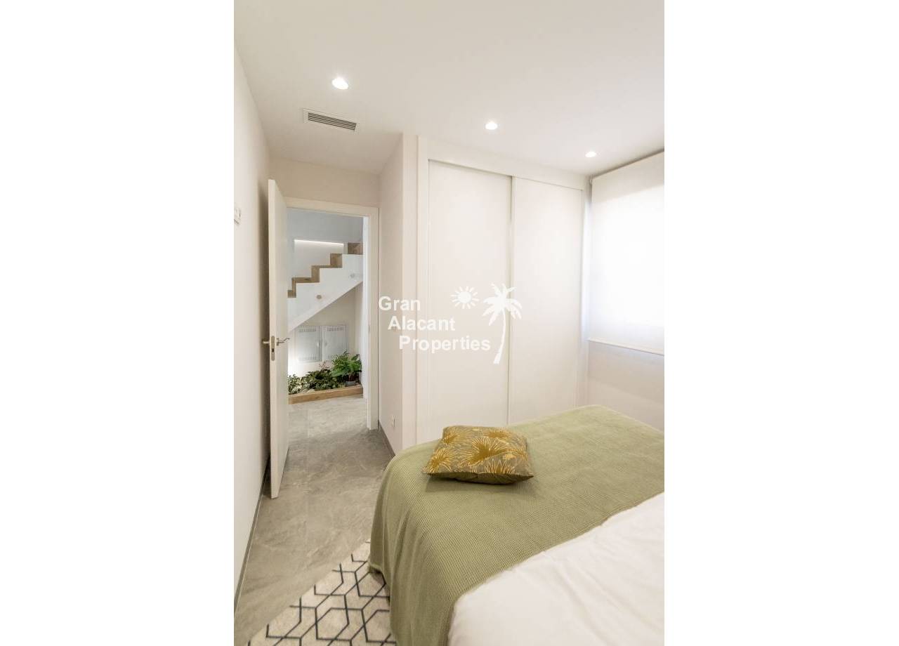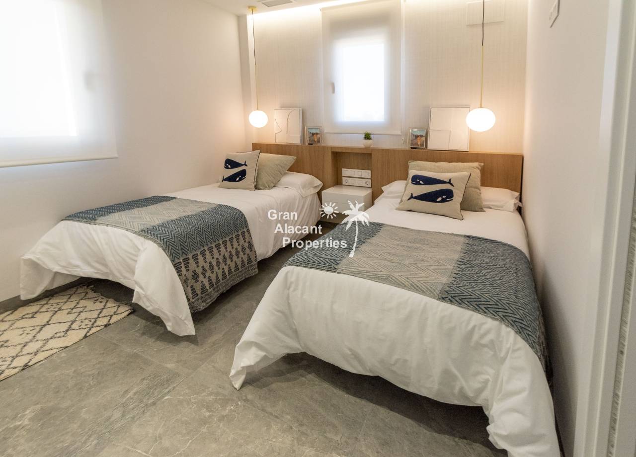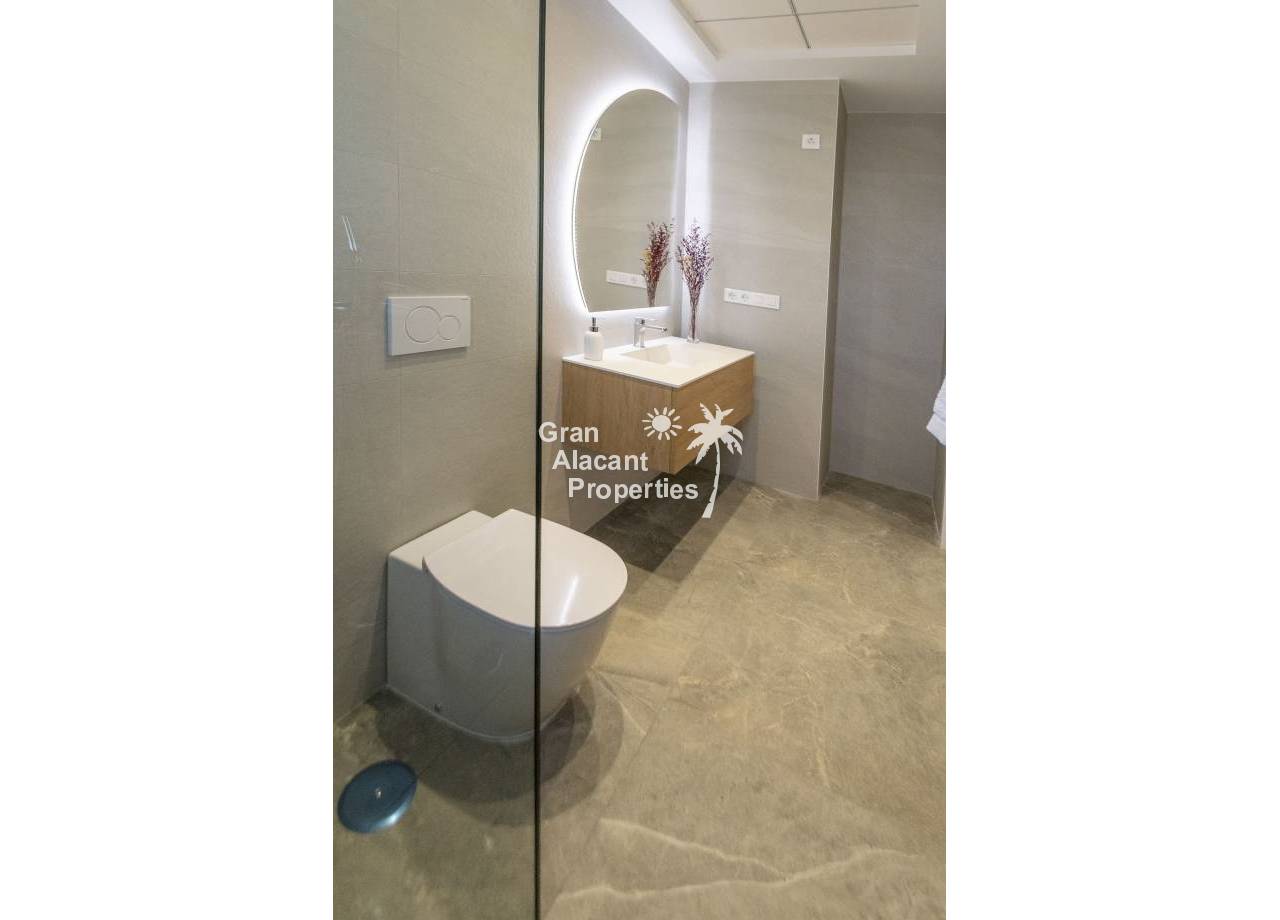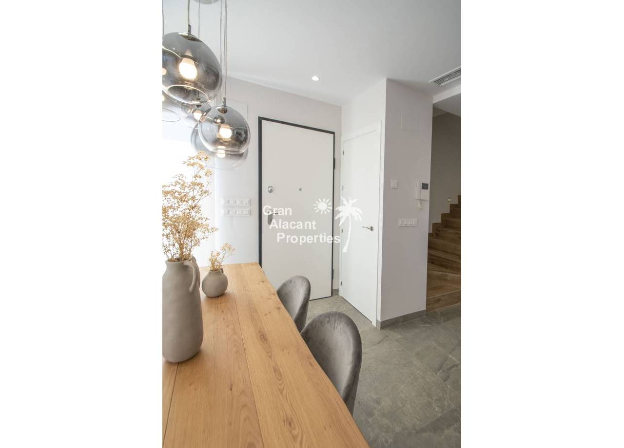 The interior of the new build villas in Pilar de la Horadada is designed to offer bright, modern and comfortable spaces. With a constructed area of 127 m² and 105 m² usable area, each villa has 3 double bedrooms and 3 complete bathrooms, equipped with high quality finishes. The open plan kitchen, integrated with the living room, is designed to be functional and elegant, facilitating daily living and entertaining. The large windows let in plenty of natural light, creating a cosy atmosphere and connecting the interior with the exterior. Built-in wardrobes provide ample storage space, while pre-installation for air conditioning ensures a comfortable environment all year round. Every detail has been carefully considered to offer a home that combines style and functionality.