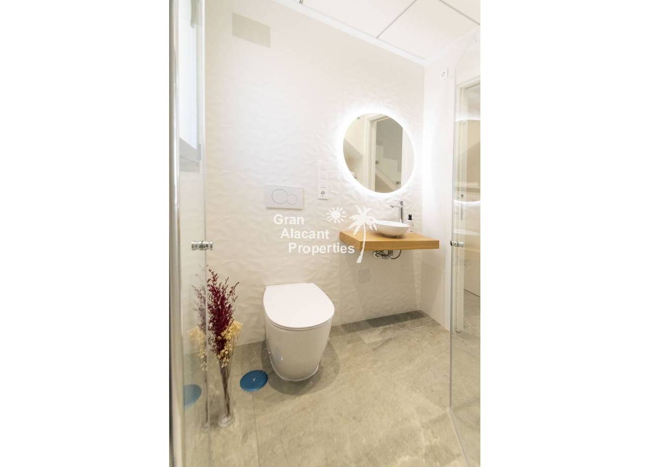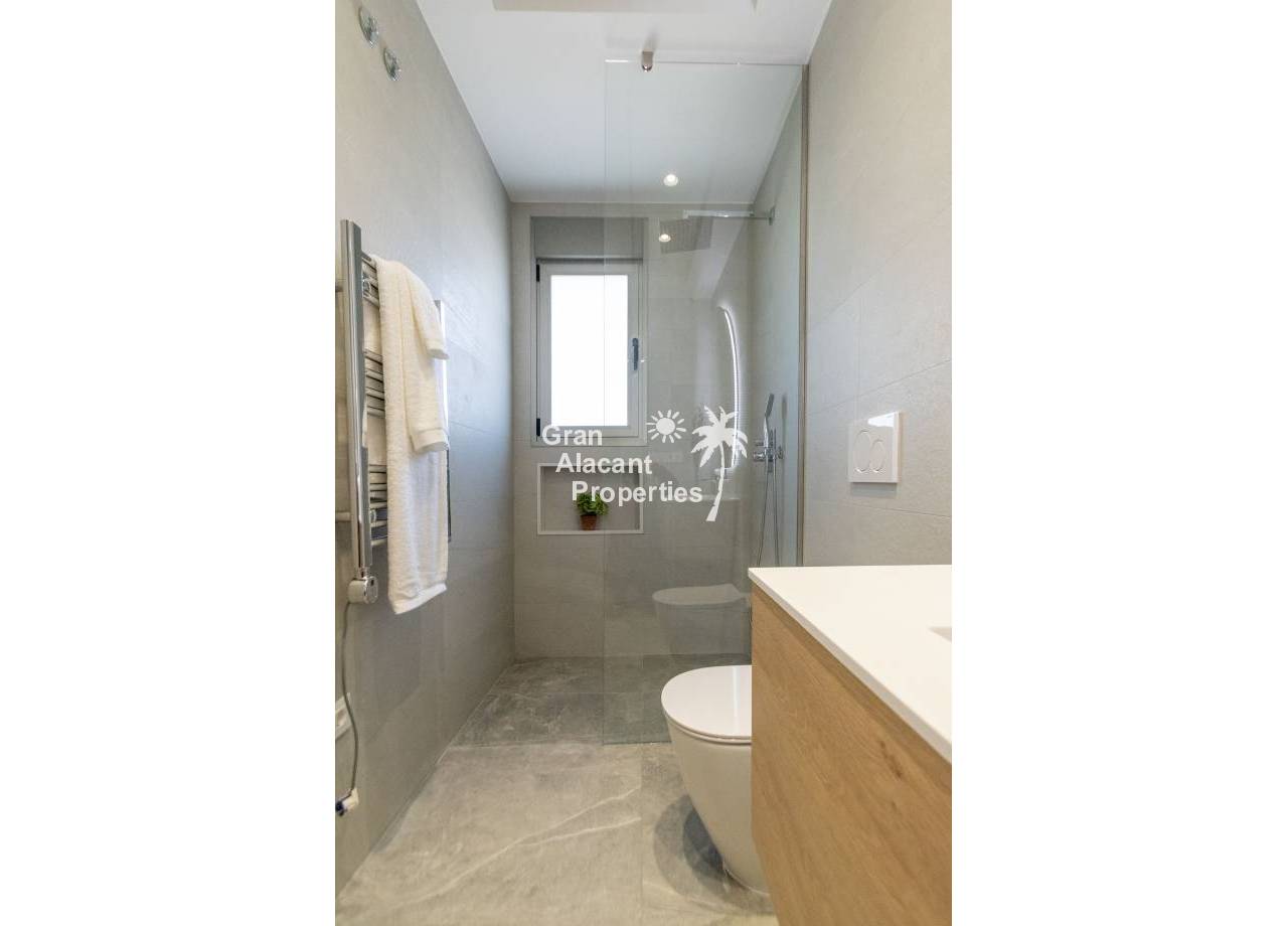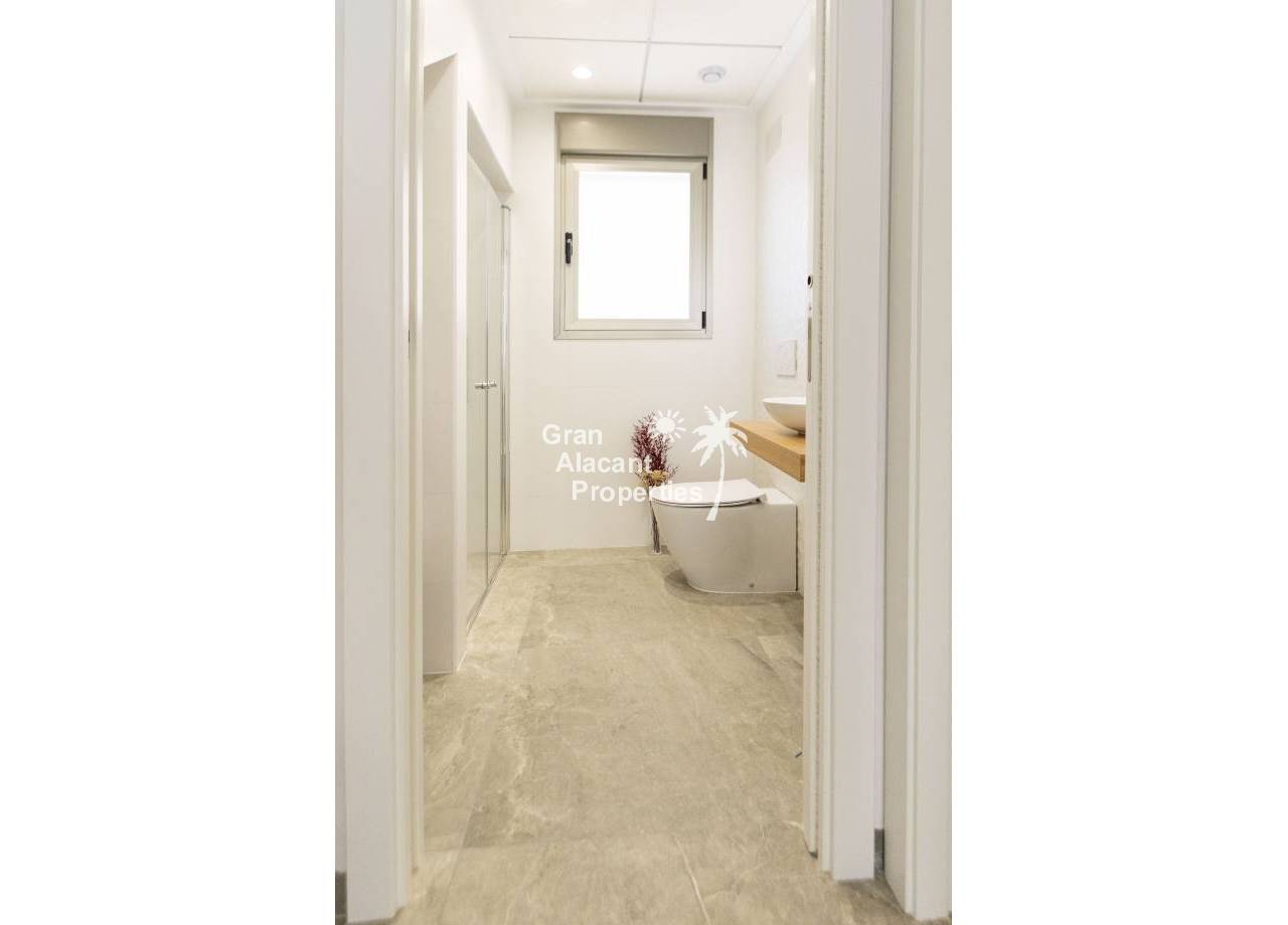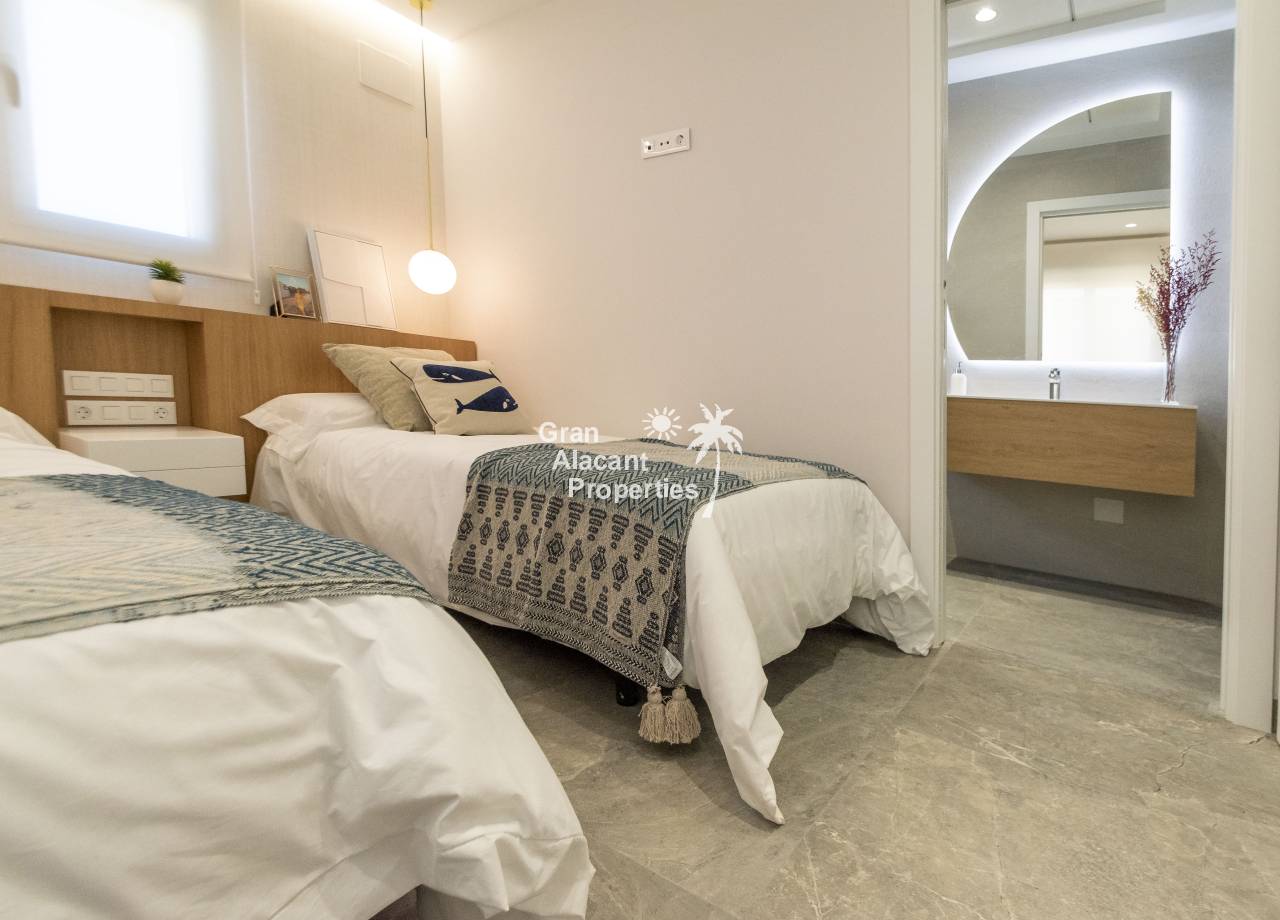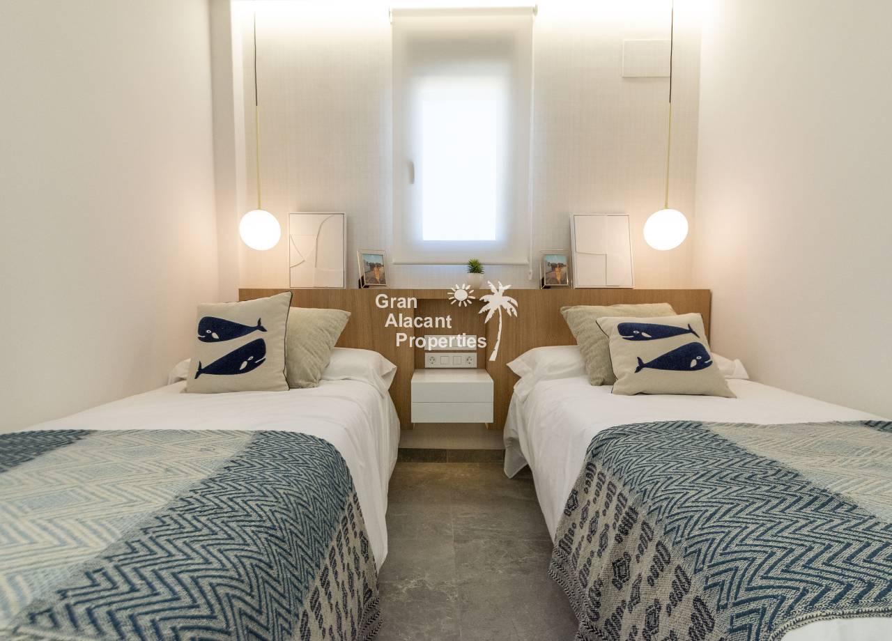 The interior of the new build villas in Pilar de la Horadada is designed to offer bright, modern and comfortable spaces. With a constructed area of 127 m² and 105 m² usable area, each villa has 3 double bedrooms and 3 complete bathrooms, equipped with high quality finishes. The open plan kitchen, integrated with the living room, is designed to be functional and elegant, facilitating daily living and entertaining. The large windows let in plenty of natural light, creating a cosy atmosphere and connecting the interior with the exterior. Built-in wardrobes provide ample storage space, while pre-installation for air conditioning ensures a comfortable environment all year round. Every detail has been carefully considered to offer a home that combines style and functionality.