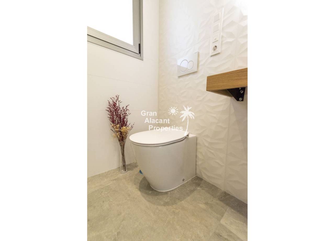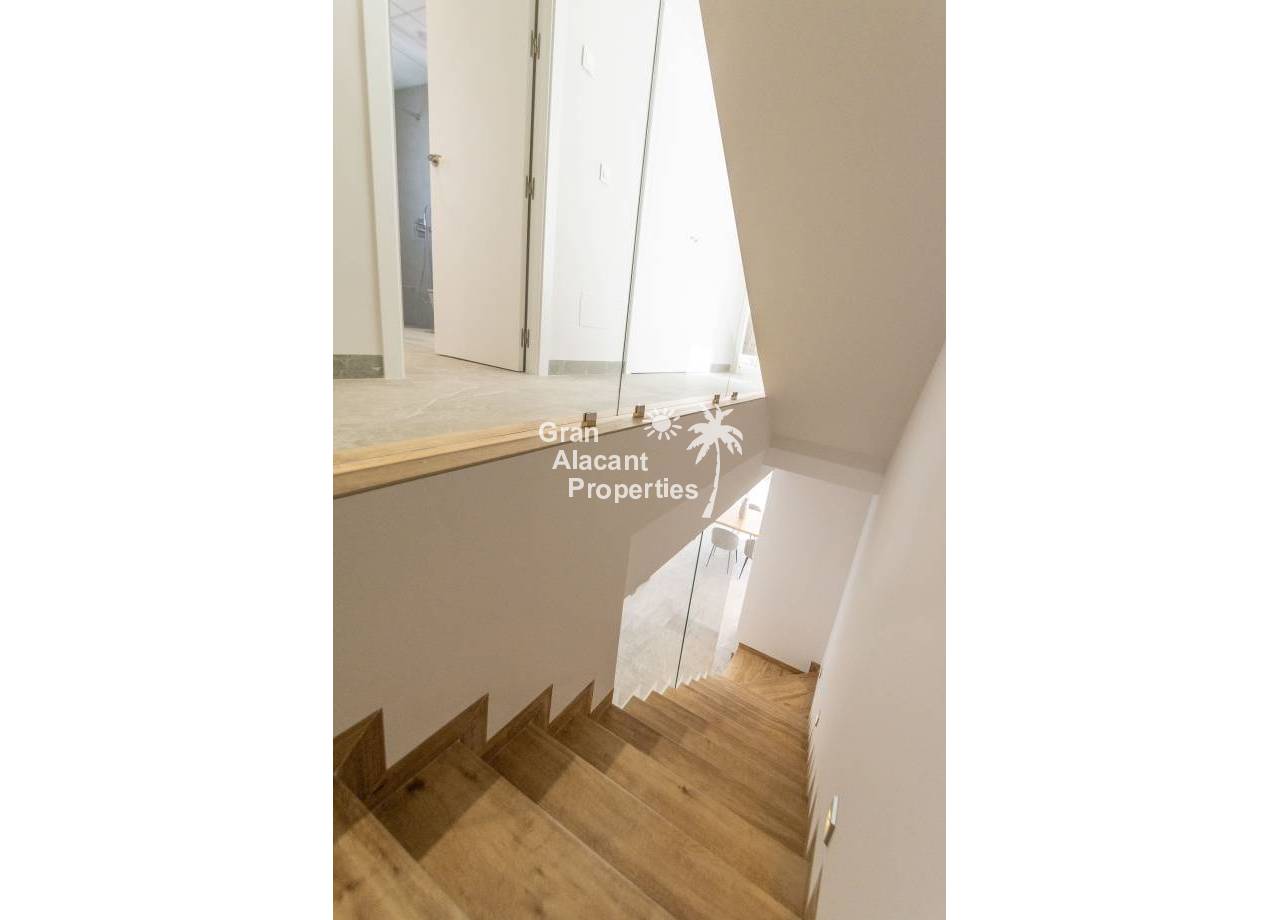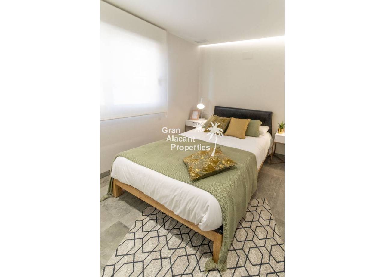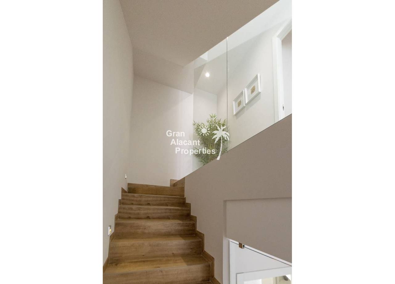 The interior of the new build villas in Pilar de la Horadada is designed to offer bright, modern and comfortable spaces. With a constructed area of 127 m² and 105 m² usable area, each villa has 3 double bedrooms and 3 complete bathrooms, equipped with high quality finishes. The open plan kitchen, integrated with the living room, is designed to be functional and elegant, facilitating daily living and entertaining. The large windows let in plenty of natural light, creating a cosy atmosphere and connecting the interior with the exterior. Built-in wardrobes provide ample storage space, while pre-installation for air conditioning ensures a comfortable environment all year round. Every detail has been carefully considered to offer a home that combines style and functionality.