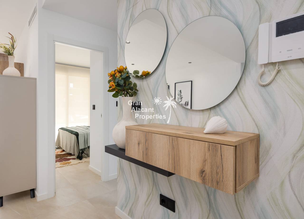 The exterior design of the new residential complex near La Serena Golf stands out for its integration with the natural surroundings and the golf course. The ground floor flats have beautiful private gardens, some of which include a private swimming pool, while the first floor apartments have spacious terraces and private solariums. The properties are east and west facing, providing unrivalled views over the communal areas and golf course. The communal areas include a communal swimming pool surrounded by landscaped gardens, perfect for relaxing and enjoying the Mediterranean climate.
