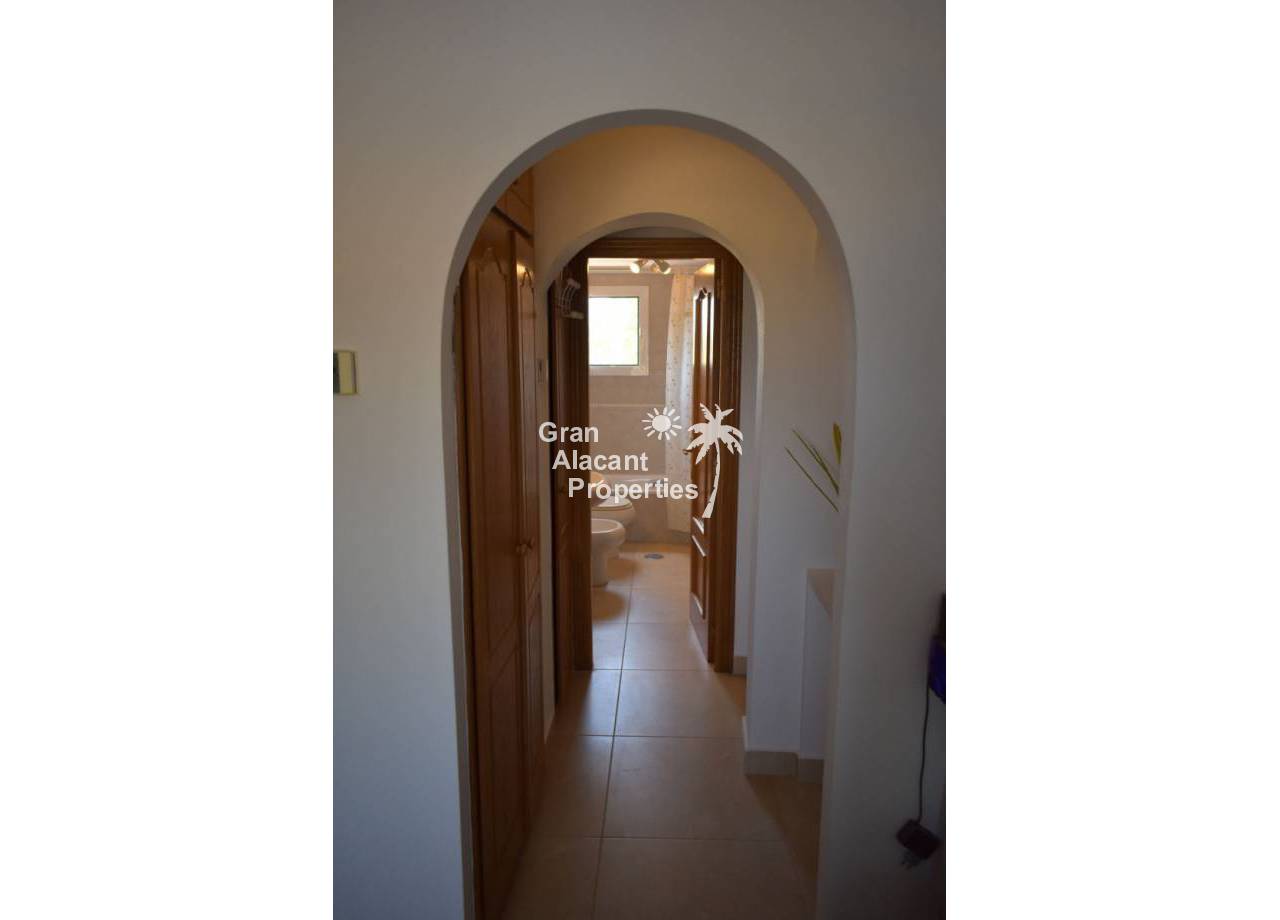Upstairs, there is an en-suite bedroom with an updated bathroom and walk-wardrobe. This room opens onto the solarium and being higher up has even better views. The current owners enlarged the glass door to the terrace so you can enjoy the view of the Mediterranean from bed. The sense of peace and tranquility in this space is enhanced by additional insulation and sound proofing in the roof and exterior walls. There is a separate access to the solarium at the top of the stairs so your guests need not go through the bedroom to enjoy the views.