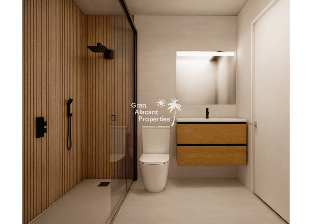 The villas, with a living area of 74 m², are designed to make the most of the natural light and space available. Day area: An open-plan living-dining room of 27 m² connects to the garden through large glazed doors, creating a bright and welcoming atmosphere. Bedrooms: The master bedroom includes a spacious dressing room and ensuite bathroom, with direct access to the garden. The second bedroom has fitted wardrobes and is strategically located close to the additional bathroom. Equipment: The properties include white goods (except washing machine) and LED lights, as well as pre-installation for air conditioning.