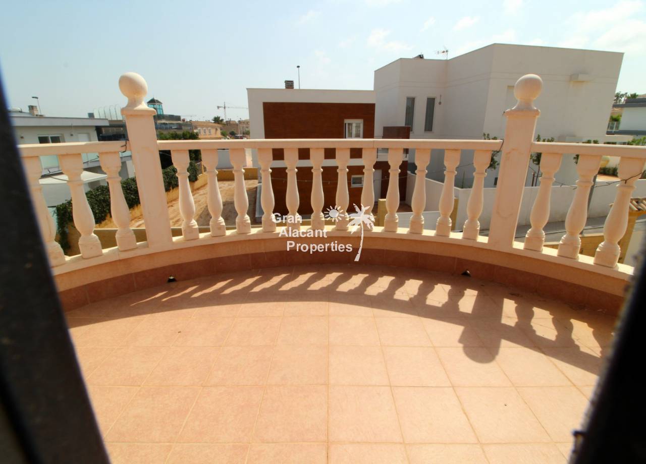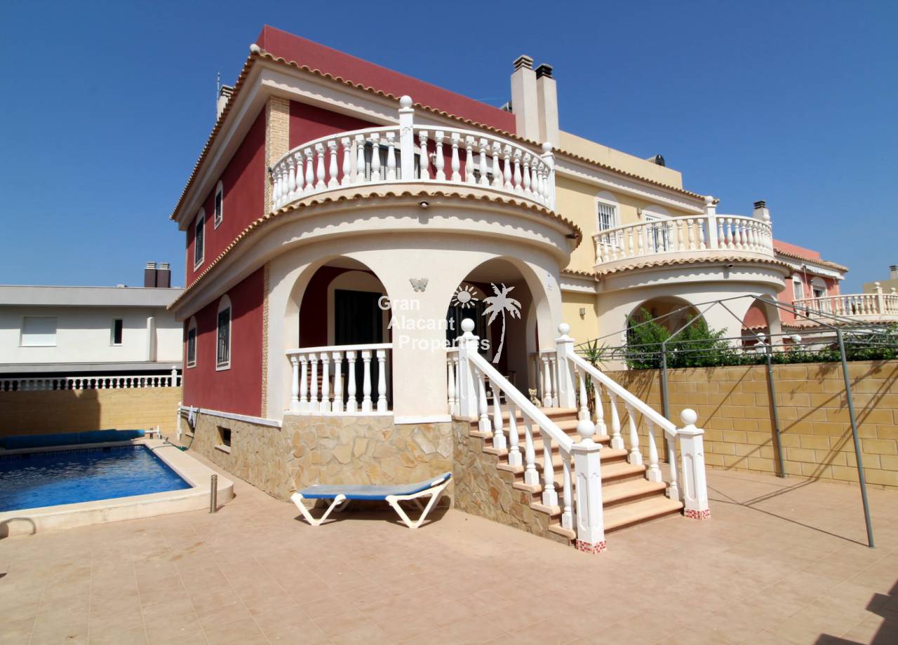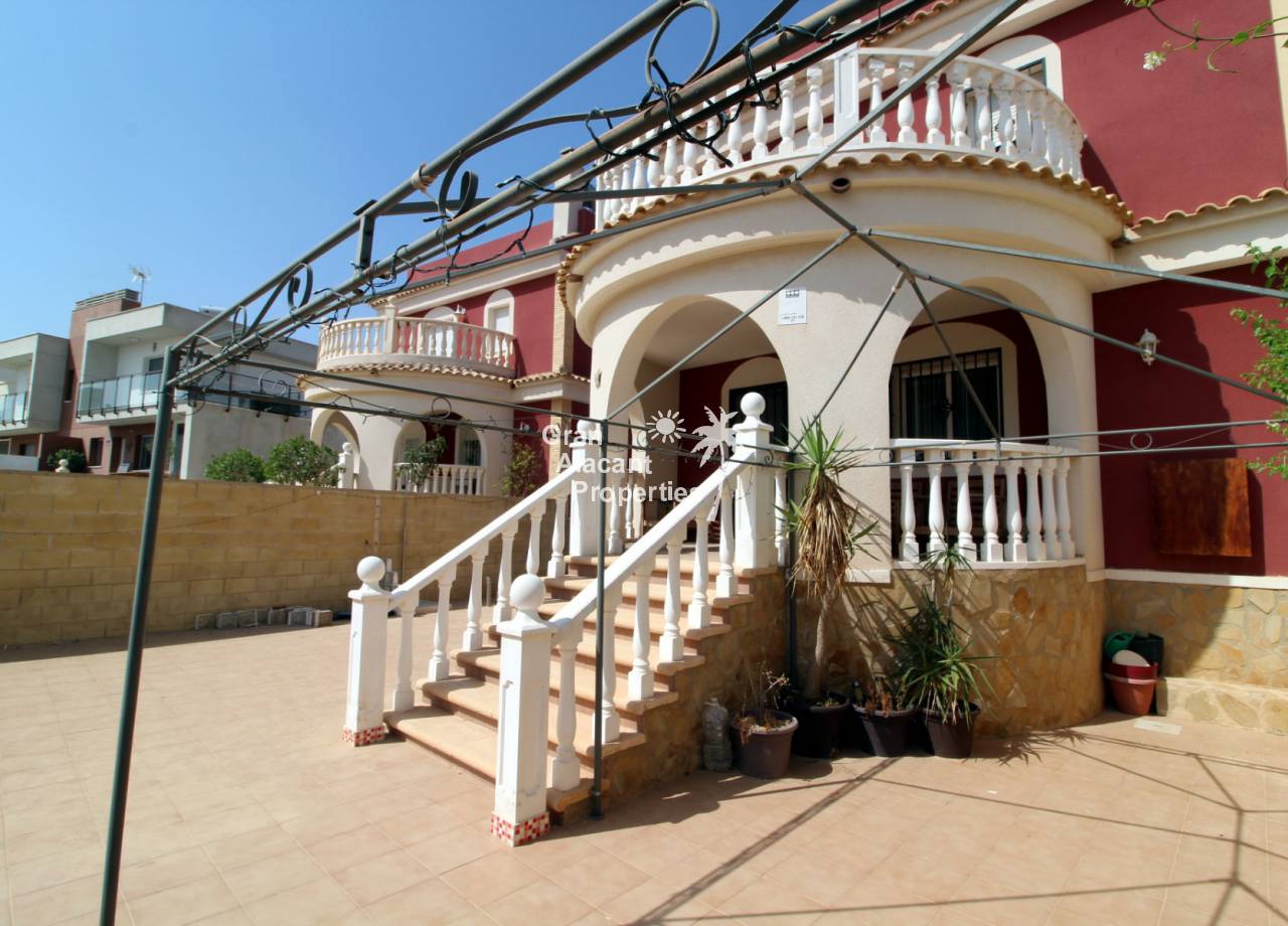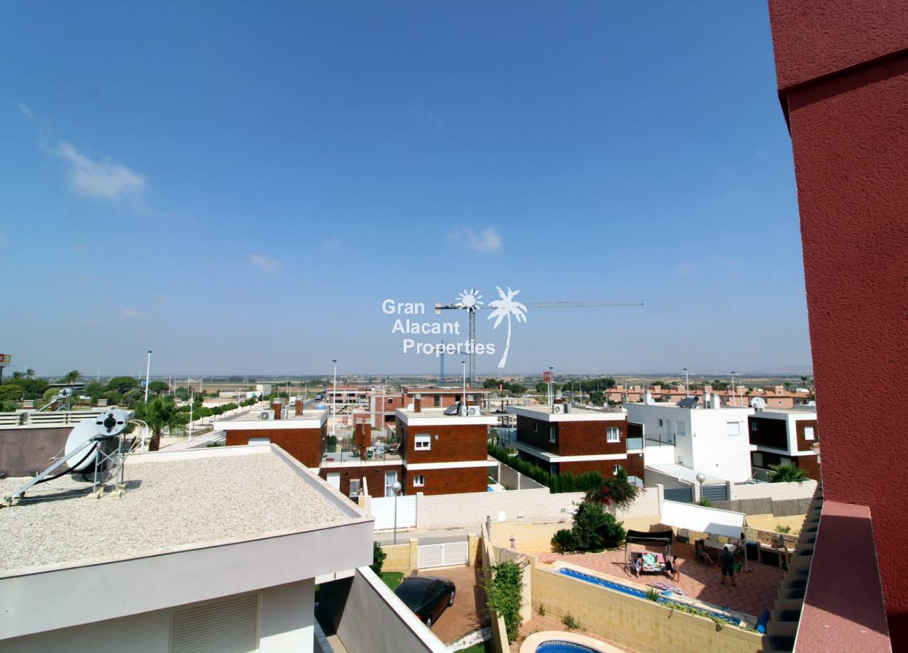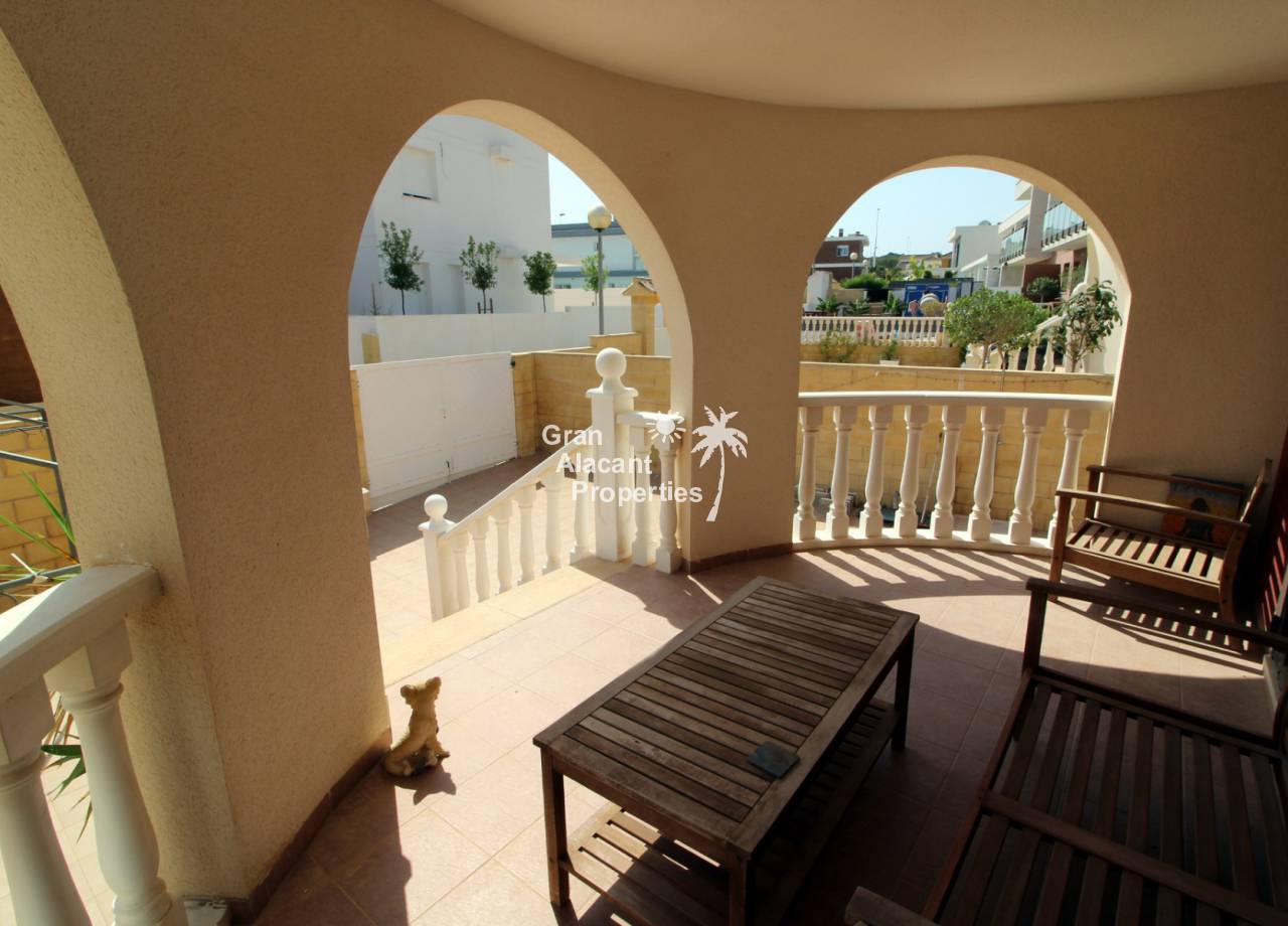 Large south-East facing villa with private swimming pool in prime Gran Alacant location. This semi-detached 228 m² “Zafiro” style villa is located on a 261 m² plot in a quiet area of Monte y Mar, Gran Alacant with commanding views over the countryside and Alicante from the solarium. Sitting in its own low maintenance gardens, this villa offers plenty of outside space for those barbecues and entertaining or just relaxing in the sun. To cool off there is your very own private swimming pool open 24 hours a day every day.