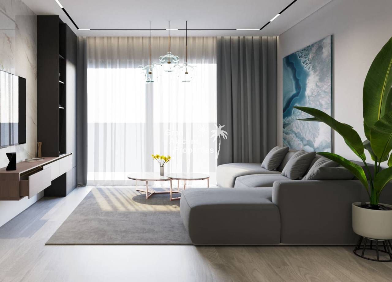 Residents will be able to enjoy a variety of amenities designed for wellbeing and relaxation. The communal swimming pool is perfect for cooling off on warm days, while the rooftop solarium offers an exclusive space for lounging and socialising with panoramic views. In addition, the building has optional underground parking spaces and storage rooms, providing added convenience and security. The privileged location ensures easy access to a wide range of amenities, including supermarkets, restaurants, bars and leisure centres, as well as points of interest such as Alicante airport and nearby golf courses.