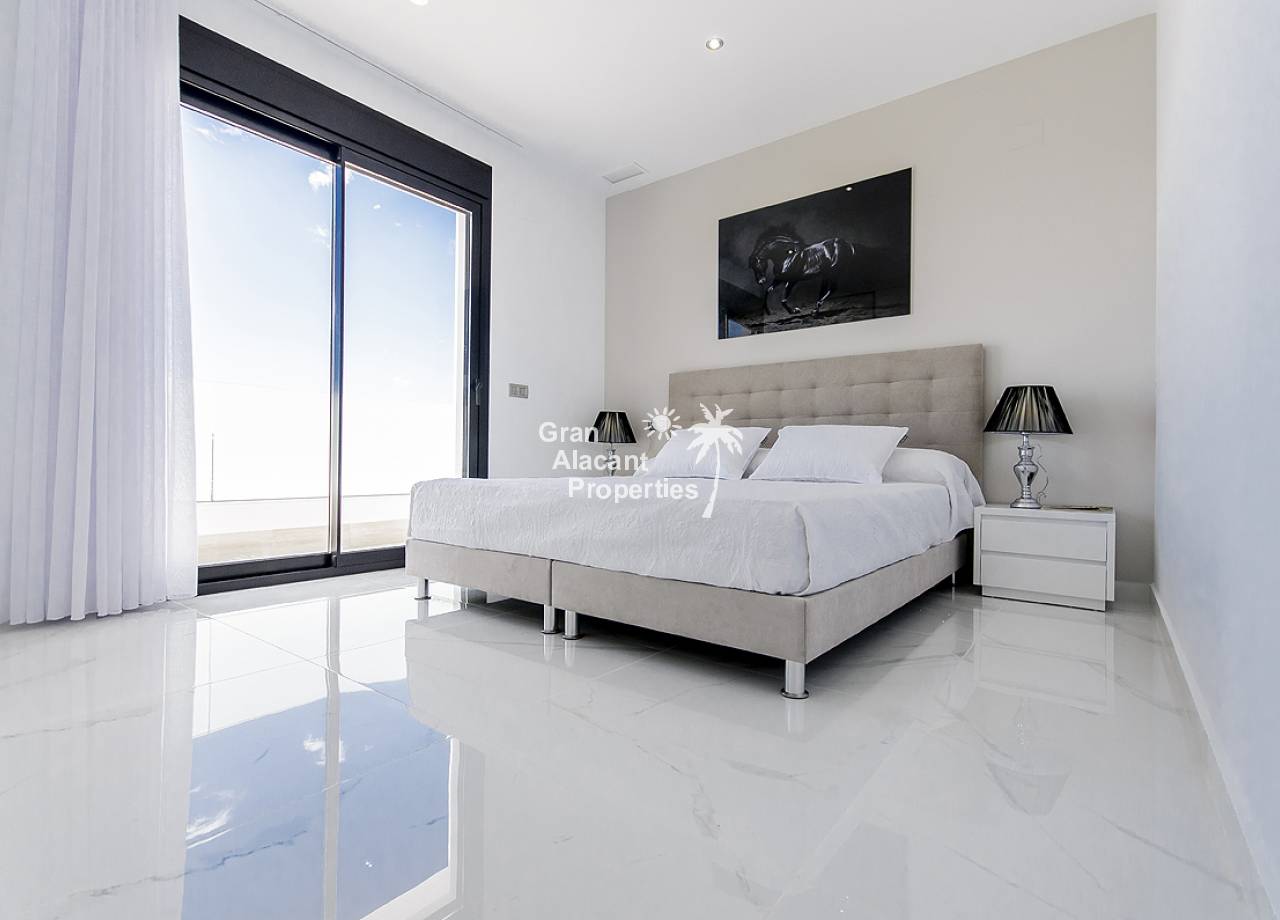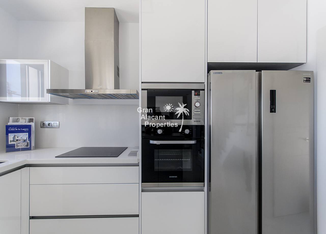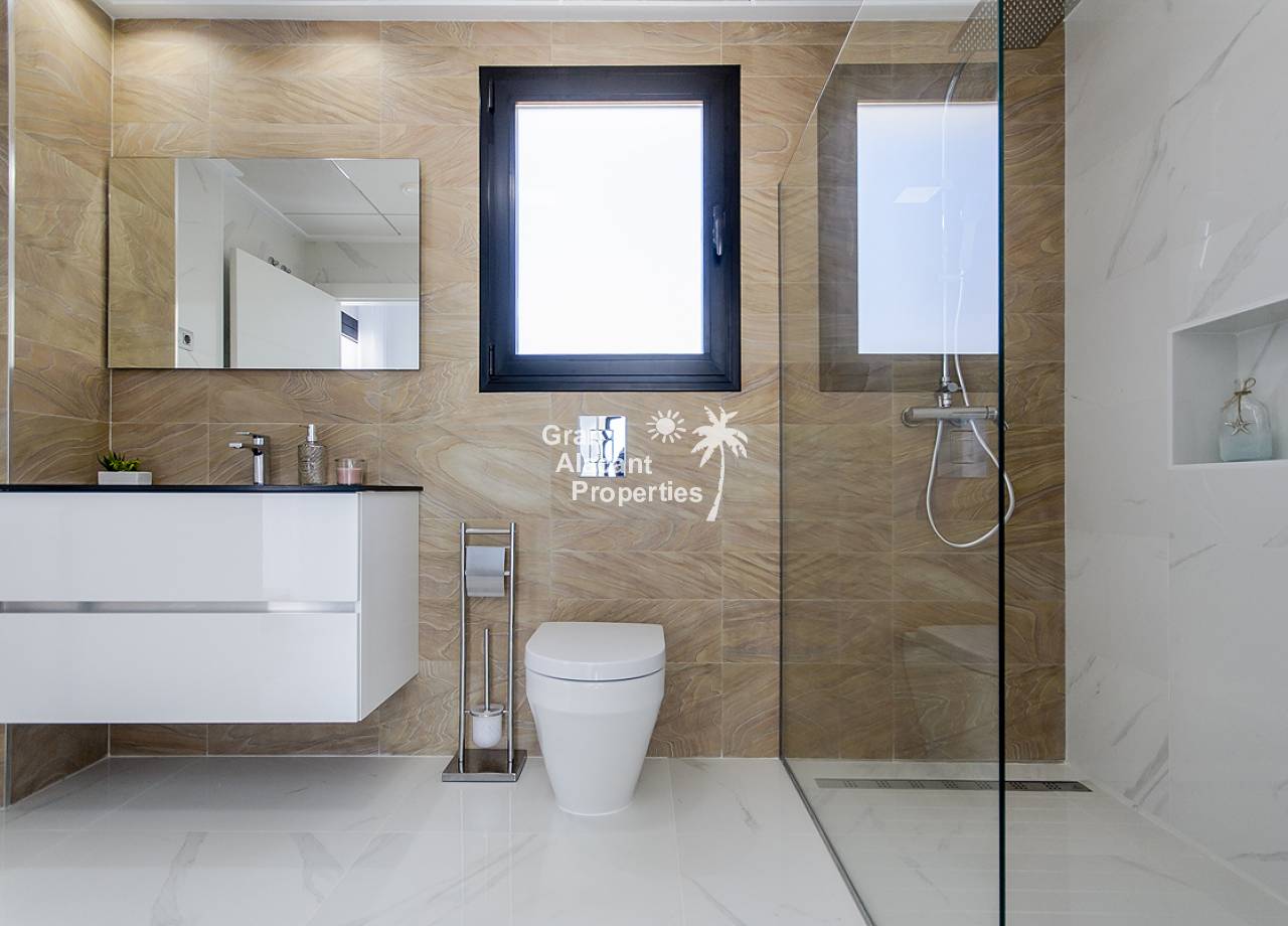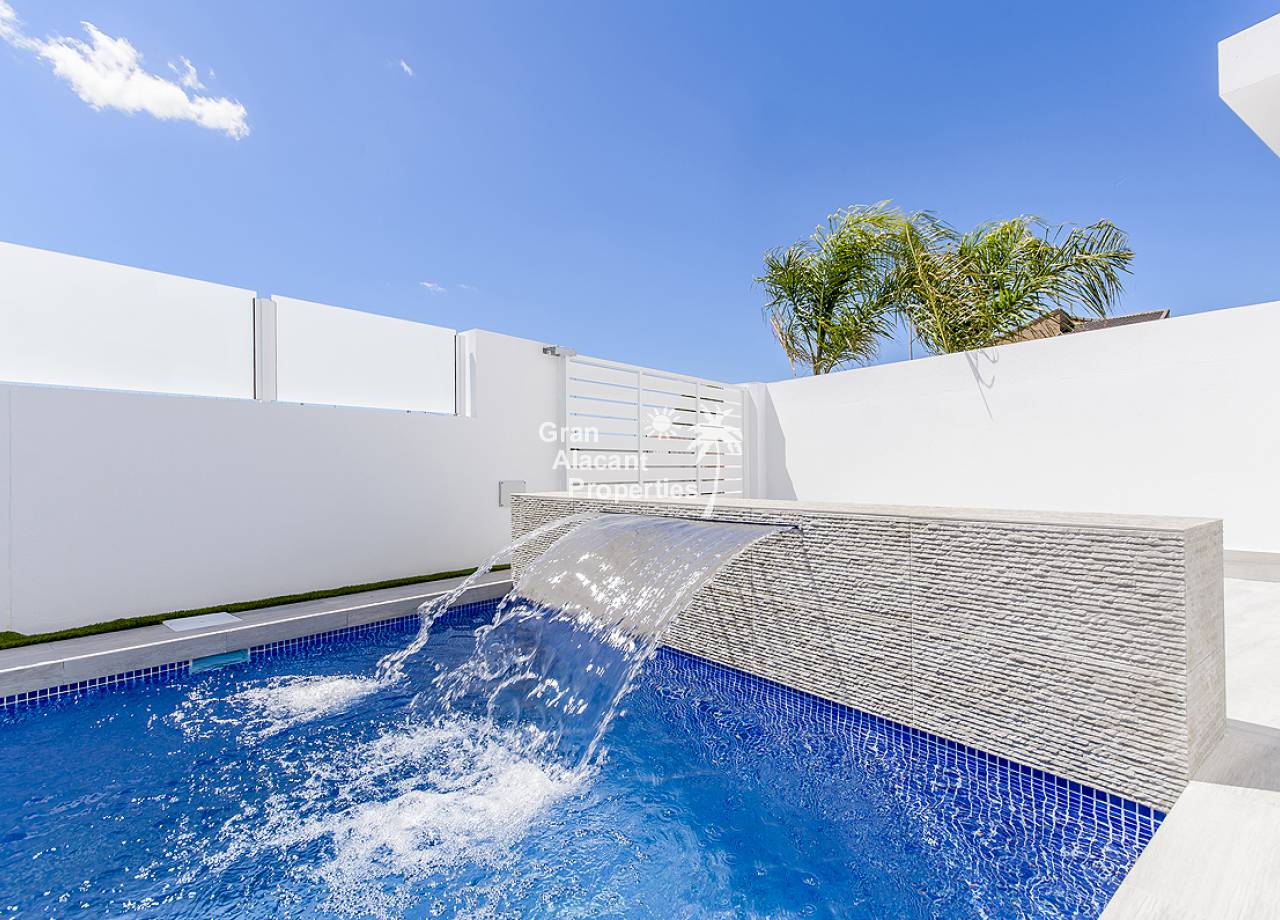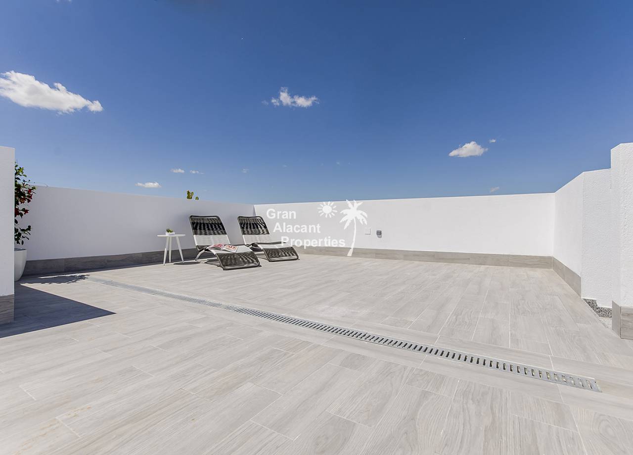 Introducing Loma de la Laguna, a small community of new build luxury villas with pool in the La Herrada area of Los Montesinos on Spain's sunny Costa Blanca. These modern villas feature a large open plan living and dining and kitchen space (35 m2) that is ideal for entertaining or relaxing. Large expanses of glass ensure the space is sunny and bright and offer views of the garden and private pool. There is a ground floor master bedroom with built-in wardrobes and en-suite bathroom. A handy separate laundry/utility space off the kitchen and guest WC complete the ground floor. Up a modern staircase with glass banister to the first floor where you will find a family bathroom and two additional double bedrooms with built-in wardrobes and access to a terrace overlooking the pool.