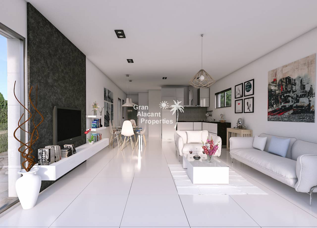 The interior of the new build villas in Los Alcázares is designed to offer bright, modern and welcoming spaces. With a constructed area of 106 m² and 95 m² usable area, the villas have 3 double bedrooms and 2 complete bathrooms, all of them equipped with top quality finishes. The open plan kitchen is fully equipped with Siemens appliances, including fridge, dishwasher, ceramic hob, oven and extractor hood. This kitchen opens onto a spacious and bright living room, creating a perfect space for everyday living and entertaining. Built-in wardrobes in the bedrooms provide ample storage space, while the installation of ducted air conditioning in all rooms ensures a comfortable environment all year round. Large windows let in an abundance of natural light, enhancing the feeling of spaciousness and connection to the outdoors.