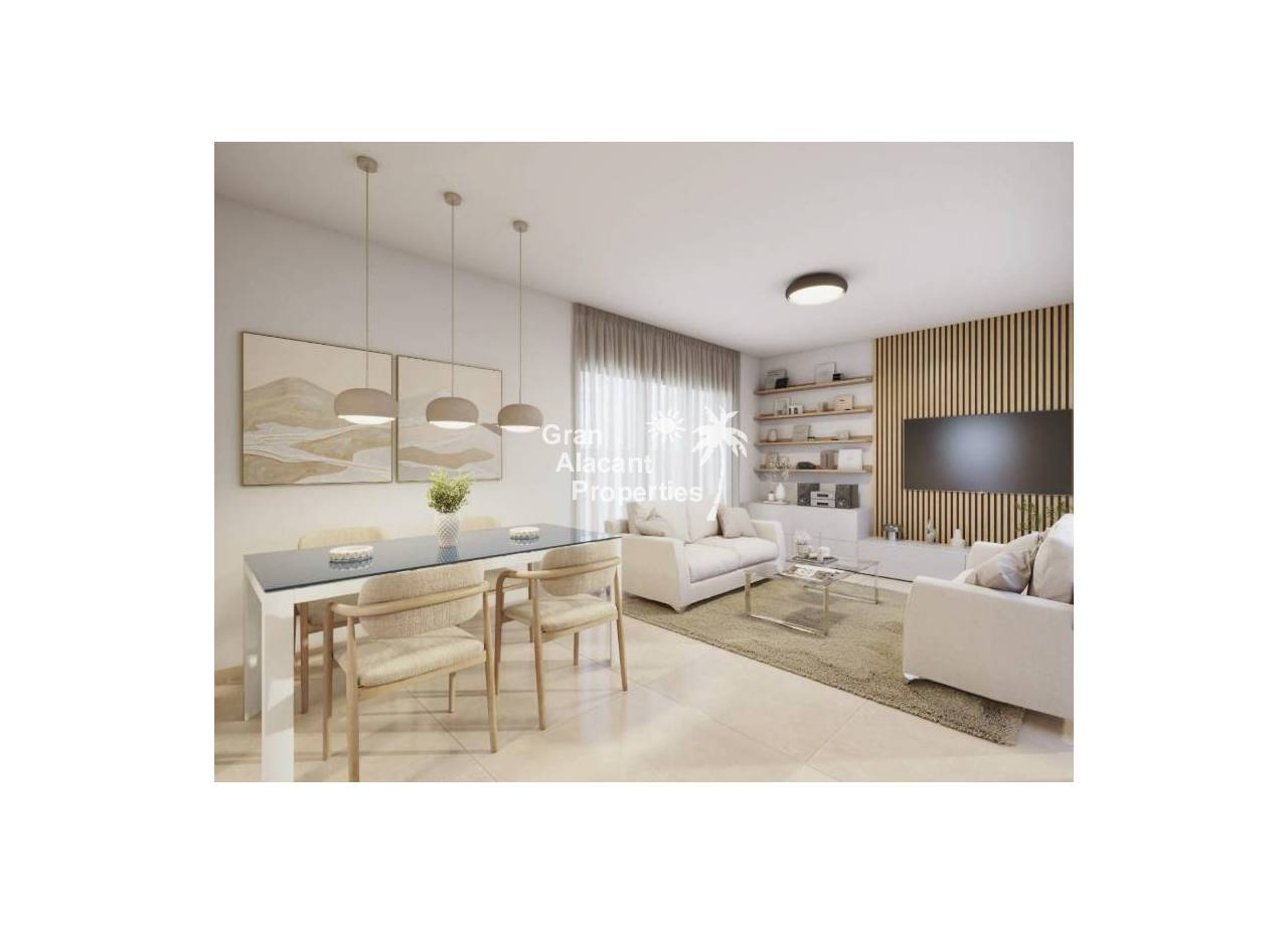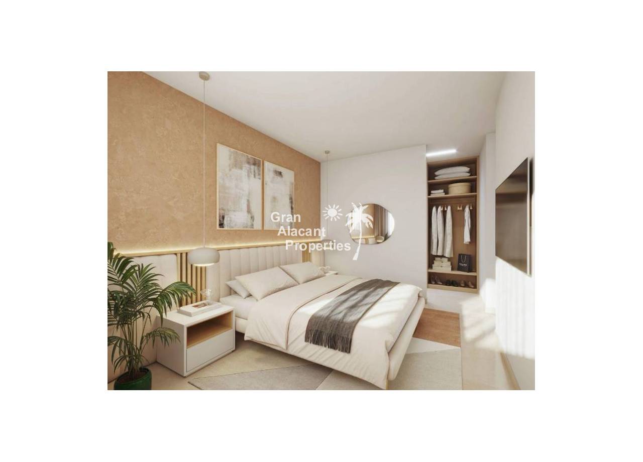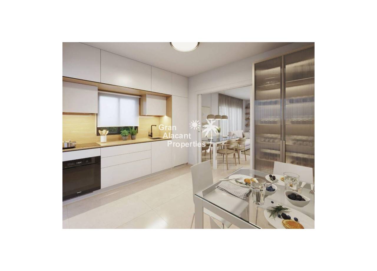 The villa has 3 double bedrooms, living room with kitchenette, and 2 bathrooms. The finishes are of high quality, with white lacquered interior carpentry, porcelain tile floors and exterior aluminum carpentry with double glazing. It also includes pre-installation of air conditioning and heating ducts, and fitted closets.