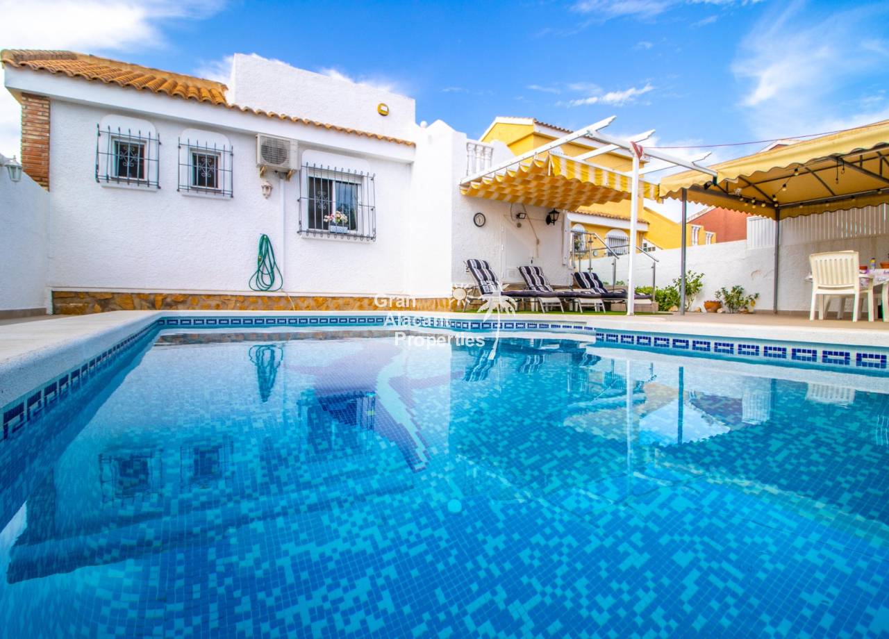 Tucked away on a quiet street in the popular Monte y Mar neighborhood of villas, this detached Bellavista-style home comes with its own pool, private parking, and plenty of thoughtful extras. These homes are beloved for their charming classic architectural details, including curved porches with elegant arches, gleaming white balustrades, and traditional curved roof tiles.