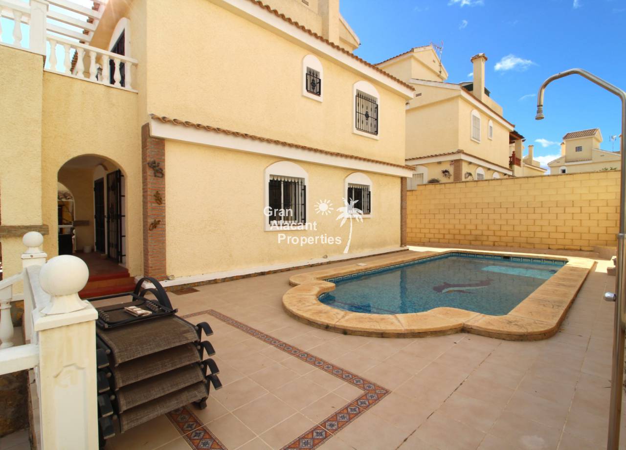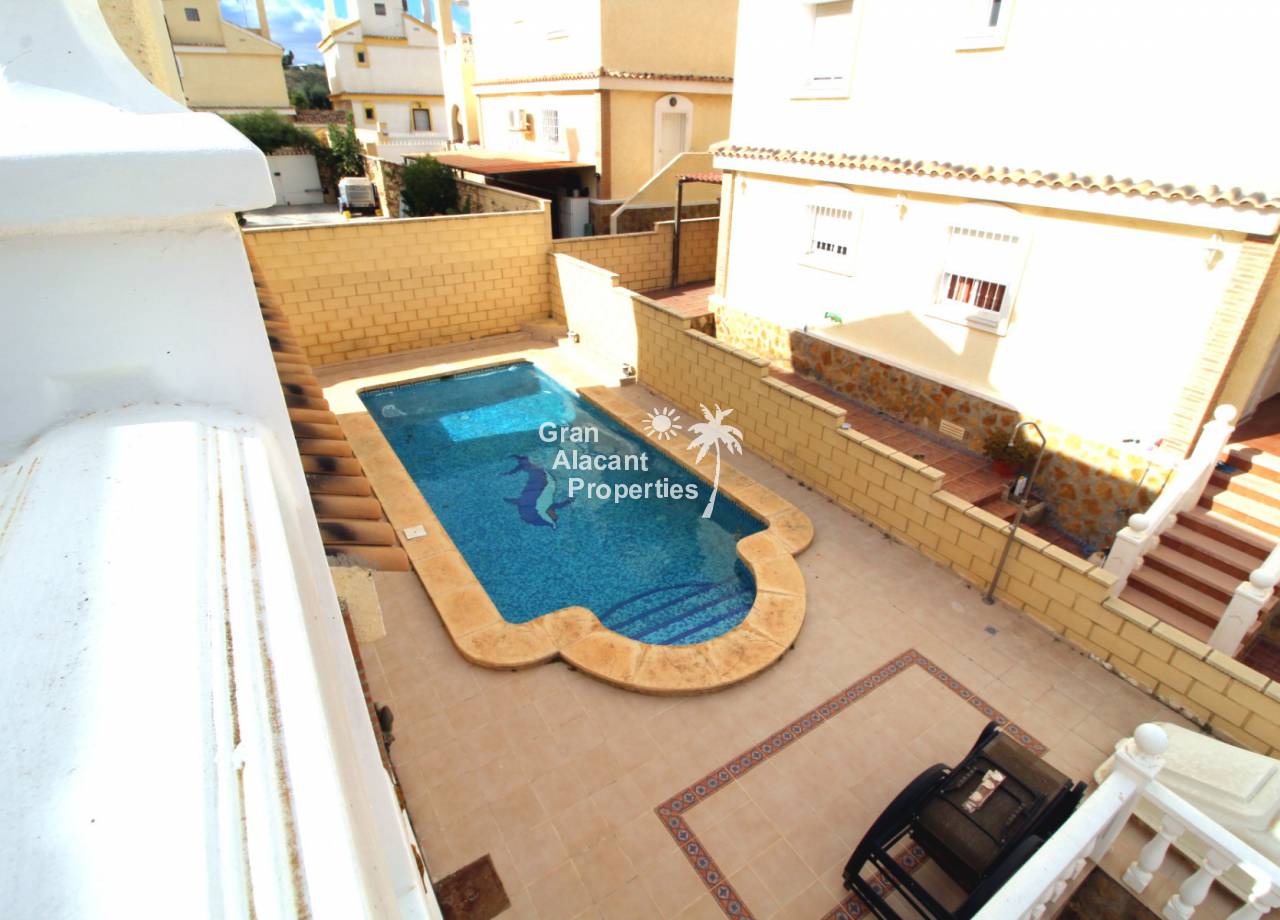 This large "key ready" north facing detached villa with private swimming pool and low maintenance gardens is an excellent opportunity to acquire a bargain property located just a few kilometers from Alicante city and the beach. It is listed exclusively for sale by Gran Alacant Properties on the up and coming urbanization of Montecid on Spain’s sunny Costa Blanca.